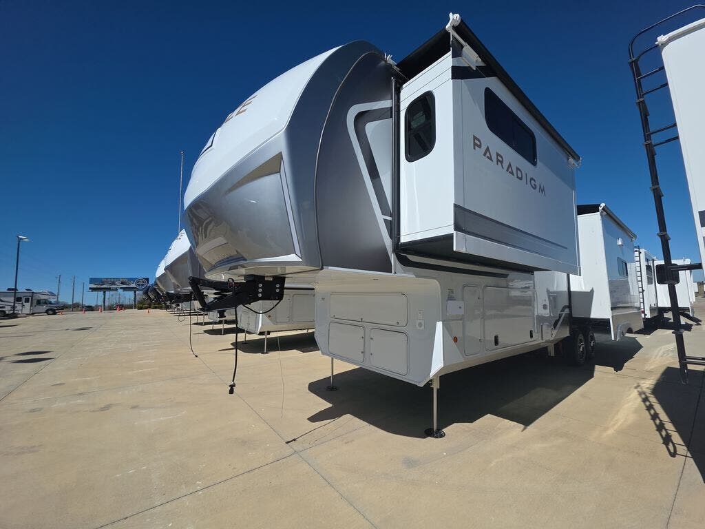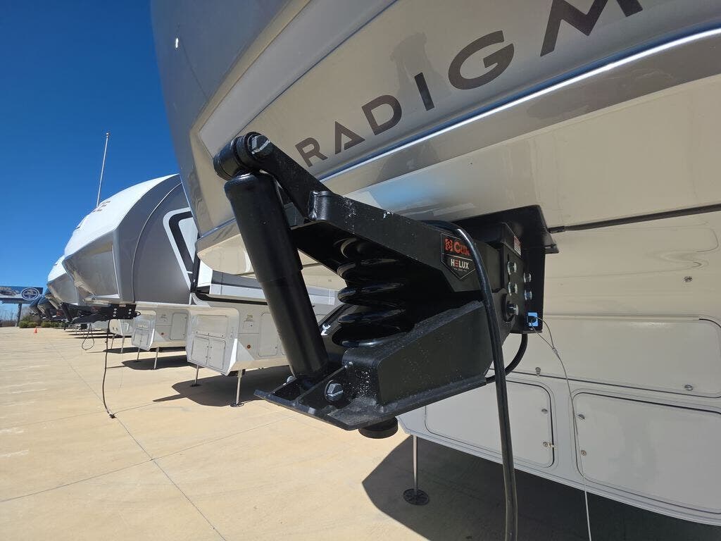 The Paradigm fifth wheels by Alliance RV are functional, high-quality, and luxurious for an unforgettable camping experience. There are three A/C units and a 40K BTU furnace to keep you comfortable year around, and you'll appreciate additional convenient amenities, like the all-in-one enclosed/heated utility center and the color coded and numbered wiring. A Helux Series coil spring pin box comes standard for hassle-free towing, along with Curt 8,000 lb. axles. You'll love the kitchen with its LG solid surface countertops and Lusso range, plus there is LED motion lighting in the pantry and a Maxx fan with a rain sensor to keep everything fresh when making dinner. Each model also includes an HD Smart TV in the living room and bedroom. And of course there are a variety of options you can choose from to further customize your fifth wheel; dual pane windows, Super Solar Plus, slide out awning toppers, and generator prep or a generator to name a few!