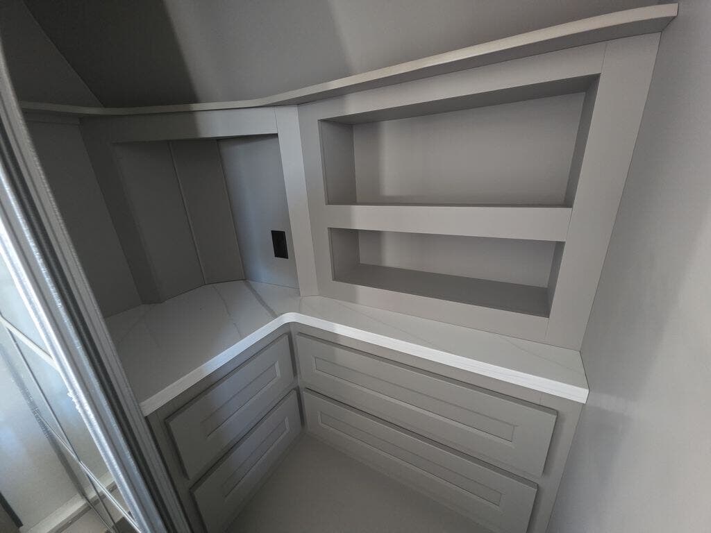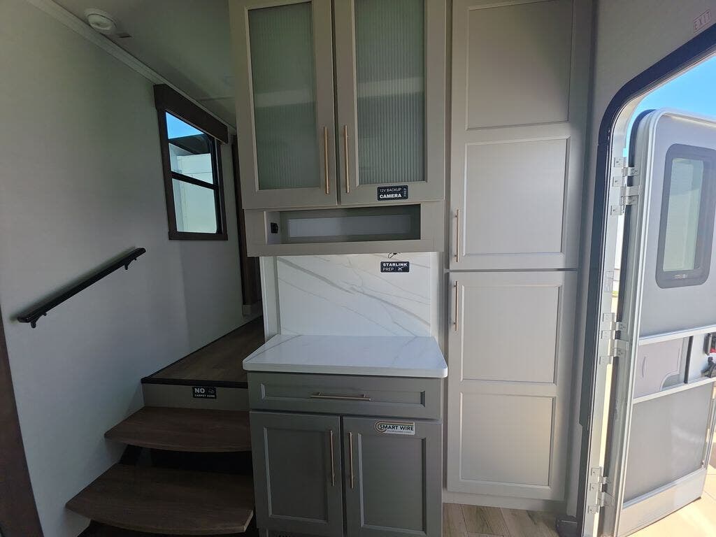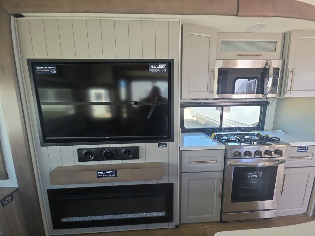 Travel to see family and friends while living in this RV or while on vacation! You will love the spacious rear living area thanks to the dual opposing slides which include the kitchen amenities and the 50" Smart TV with a fireplace. There is also a hidden pantry storage behind the TV for smart storage spaces! You can get comfortable on the dual recliner love seat or dine at the swivel table and desk. The kitchen island includes a sink and counter space to utilize many ways, plus there is dishwasher prep if you want to add that option. The full bathroom is up the steps towards the front bedroom and includes a spacious 61" x 30" shower. You even have more floor space in the hallway thanks to the third slide out which includes shelf storage, plus more shelves and a king bed in the bedroom.