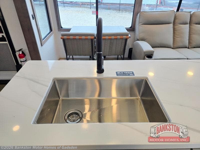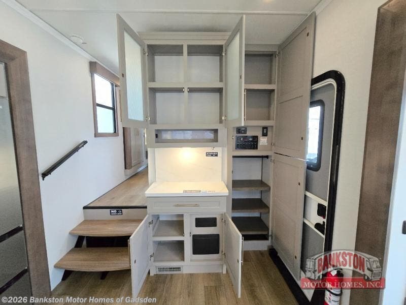 Travel to see family and friends while living in this RV or while on vacation! You will love the spacious rear living area thanks to the dual opposing slides which include the kitchen amenities and the 50" Smart TV with a fireplace. There is also a hidden pantry storage behind the TV for smart storage spaces! You can get comfortable on the dual recliner love seat or dine at the swivel table and desk. The kitchen island includes a sink and counter space to utilize many ways, plus there is dishwasher prep if you want to add that option. The full bathroom is up the steps towards the front bedroom and includes a spacious 61" x 30" shower. You even have more floor space in the hallway thanks to the third slide out which includes shelf storage, plus more shelves and a king bed in the bedroom.