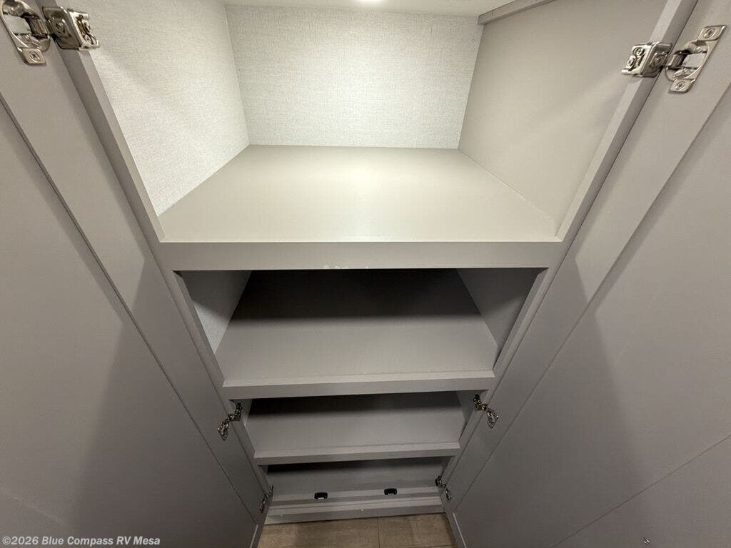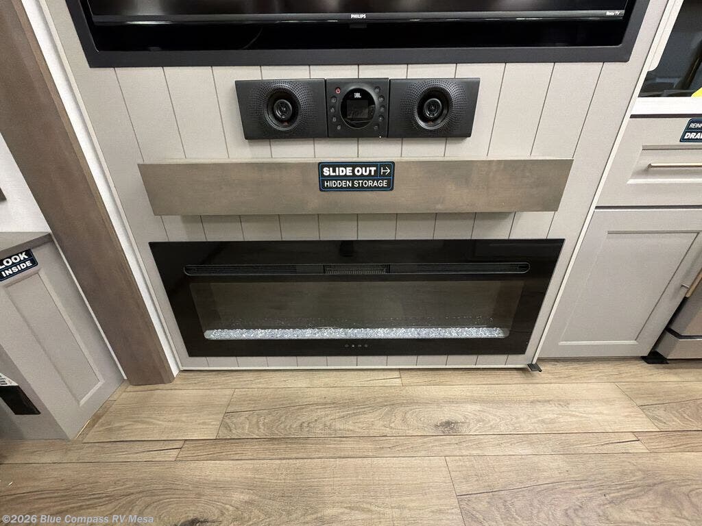 Travel to see family and friends while living in this RV or while on vacation! You will love the spacious rear living area thanks to the dual opposing slides which include the kitchen amenities and the 50" Smart TV with a fireplace. There is also a hidden pantry storage behind the TV for smart storage spaces! You can get comfortable on the dual recliner love seat or dine at the swivel table and desk. The kitchen island includes a sink and counter space to utilize many ways, plus there is dishwasher prep if you want to add that option. The full bathroom is up the steps towards the front bedroom and includes a spacious 61" x 30" shower. You even have more floor space in the hallway thanks to the third slide out which includes shelf storage, plus more shelves and a king bed in the bedroom.