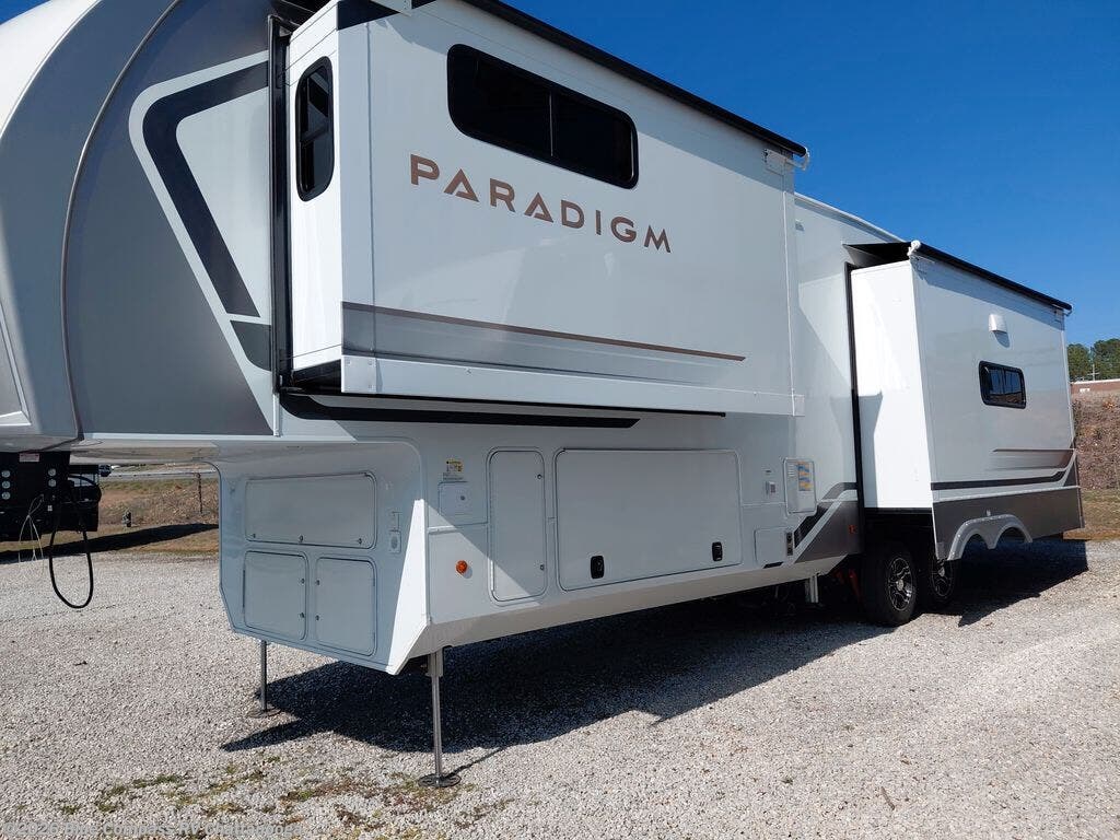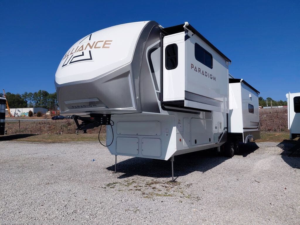 The Paradigm fifth wheels by Alliance RV are functional, high-quality, and luxurious for an unforgettable camping experience. There are three A/C units and a 40K BTU furnace to keep you comfortable year around, and you'll appreciate additional convenient amenities, like the all-in-one enclosed/heated utility center and the color coded and numbered wiring. A Helux Series coil spring pin box comes standard for hassle-free towing, along with Curt 8,000 lb. axles. You'll love the kitchen with its LG solid surface countertops and Lusso range, plus there is LED motion lighting in the pantry and a Maxx fan with a rain sensor to keep everything fresh when making dinner. Each model also includes an HD Smart TV in the living room and bedroom. And of course there are a variety of options you can choose from to further customize your fifth wheel; dual pane windows, Super Solar Plus, slide out awning toppers, and generator prep or a generator to name a few!