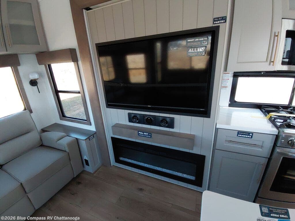 Travel to see family and friends while living in this RV or while on vacation! You will love the spacious rear living area thanks to the dual opposing slides which include the kitchen amenities and the 50" Smart TV with a fireplace. There is also a hidden pantry storage behind the TV for smart storage spaces! You can get comfortable on the dual recliner love seat or dine at the swivel table and desk. The kitchen island includes a sink and counter space to utilize many ways, plus there is dishwasher prep if you want to add that option. The full bathroom is up the steps towards the front bedroom and includes a spacious 61" x 30" shower. You even have more floor space in the hallway thanks to the third slide out which includes shelf storage, plus more shelves and a king bed in the bedroom.