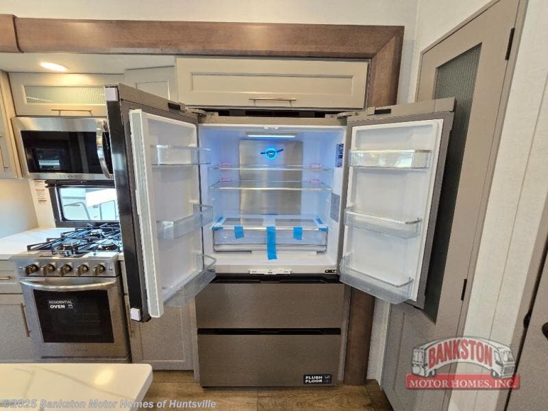 Whether you decide to be a full-timer or a long-trip traveler, this Paradigm offers so many comforts and conveniences you will love! The large full bathroom might be the reason you decide to be a new owner because you will have a large 61" x 30" shower to get cleaned up in, linen storage, and a walk-in closet with a hamper, shelves, and a space prepped for an optional washer/dryer. The bedroom allows you to sleep like a king and gives you extra floor space with the two slides, and there is storage in the flip-top dresser and under the seat, plus you can watch the Smart TV. The space saving sliding doors offer style as well. The cook will love all the residential appliances, including a residential refrigerator. The kitchen island gives you a large sink and dishwasher prep also. The half bath is super convenient just like the entry sitting bench/coat rack and closet. And you can relax on the sleeper sofa, dual recliner love seat, or swivel table and desk.