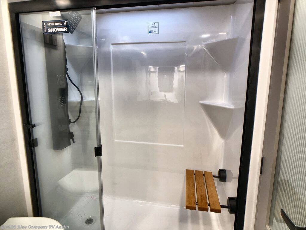 Whether you decide to be a full-timer or a long-trip traveler, this Paradigm offers so many comforts and conveniences you will love! The large full bathroom might be the reason you decide to be a new owner because you will have a large 61" x 30" shower to get cleaned up in, linen storage, and a walk-in closet with a hamper, shelves, and a space prepped for an optional washer/dryer. The bedroom allows you to sleep like a king and gives you extra floor space with the two slides, and there is storage in the flip-top dresser and under the seat, plus you can watch the Smart TV. The space saving sliding doors offer style as well. The cook will love all the residential appliances, including a residential refrigerator. The kitchen island gives you a large sink and dishwasher prep also. The half bath is super convenient just like the entry sitting bench/coat rack and closet. And you can relax on the sleeper sofa, dual recliner love seat, or swivel table and desk.