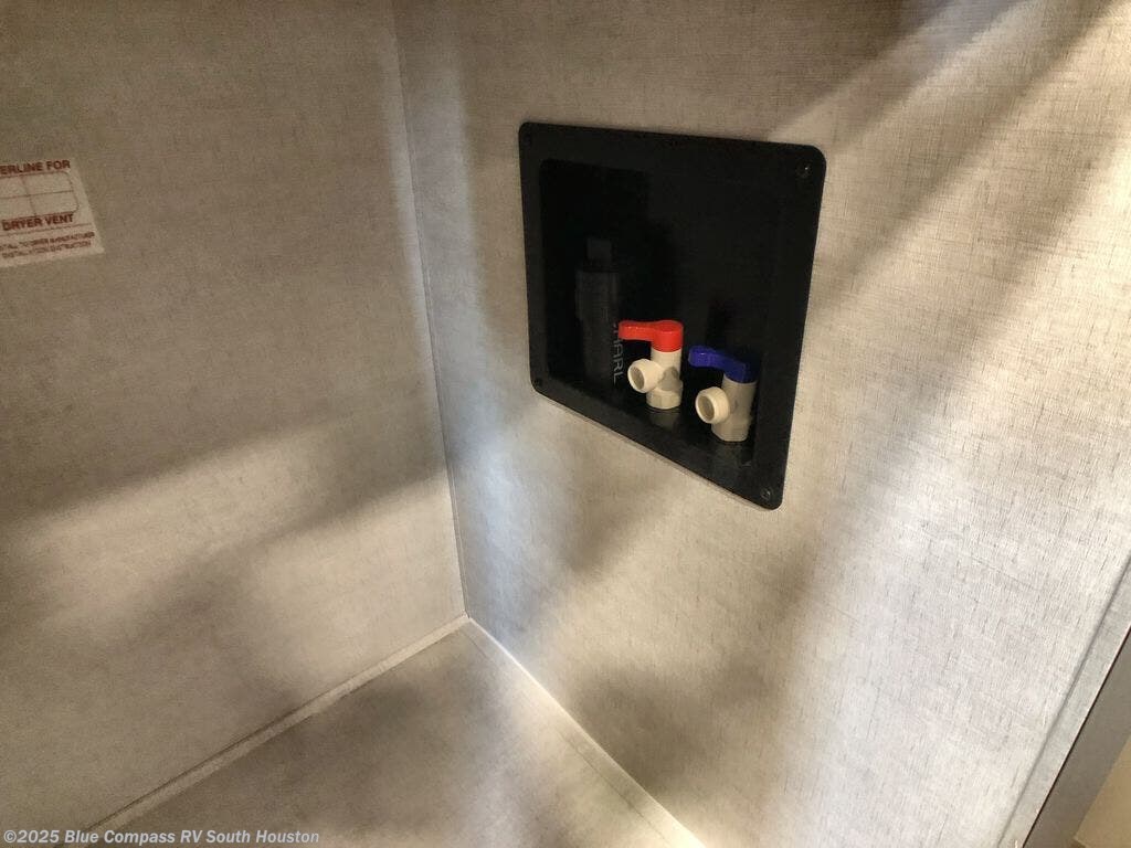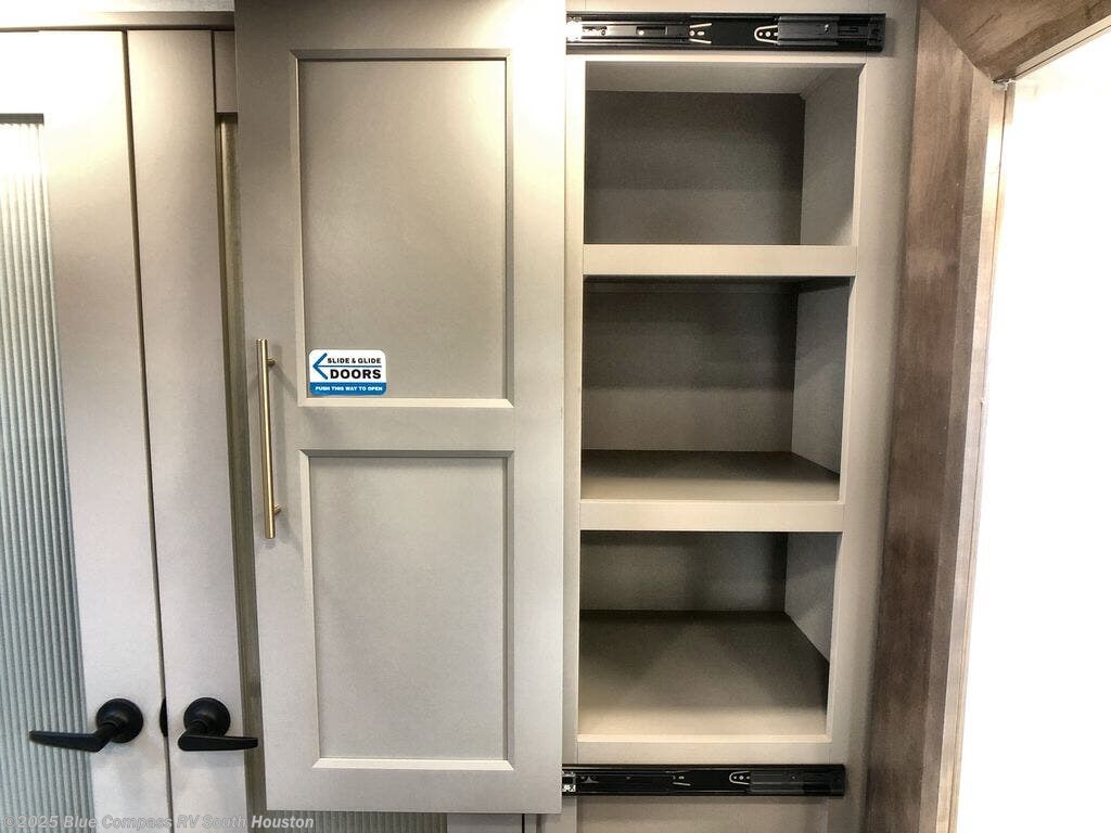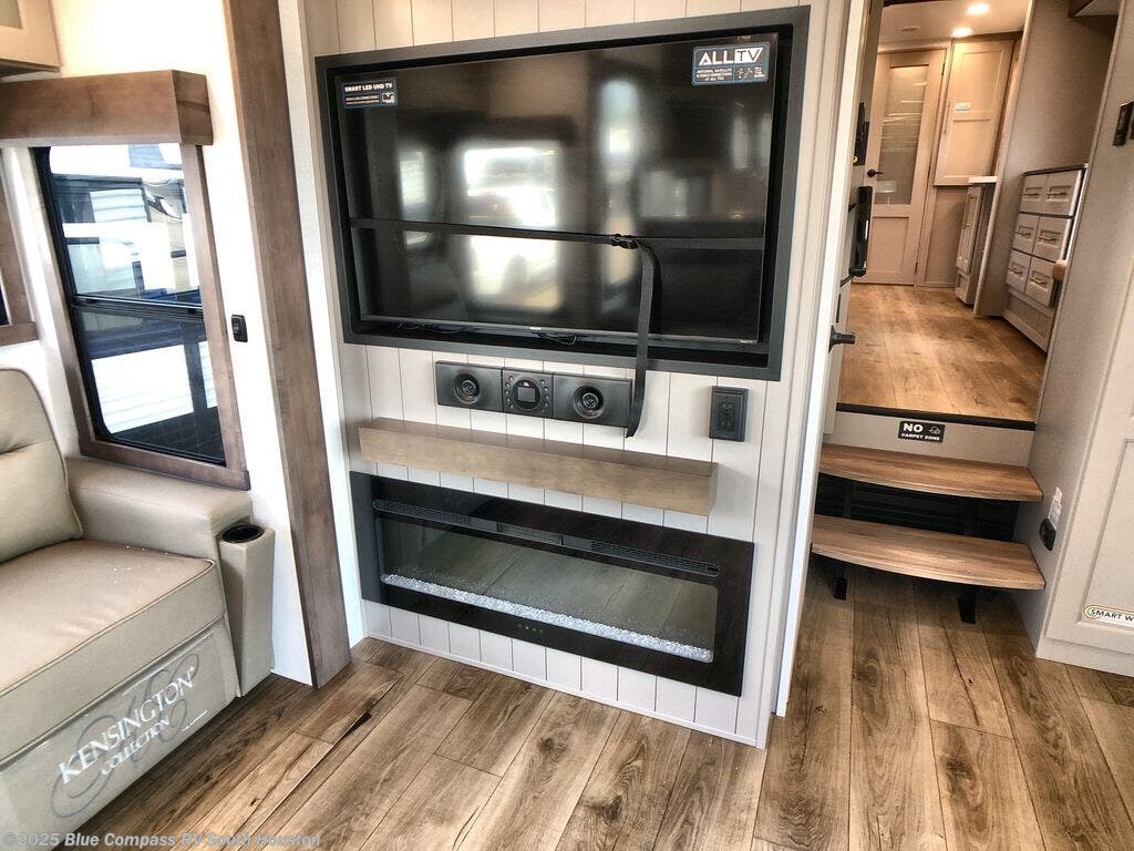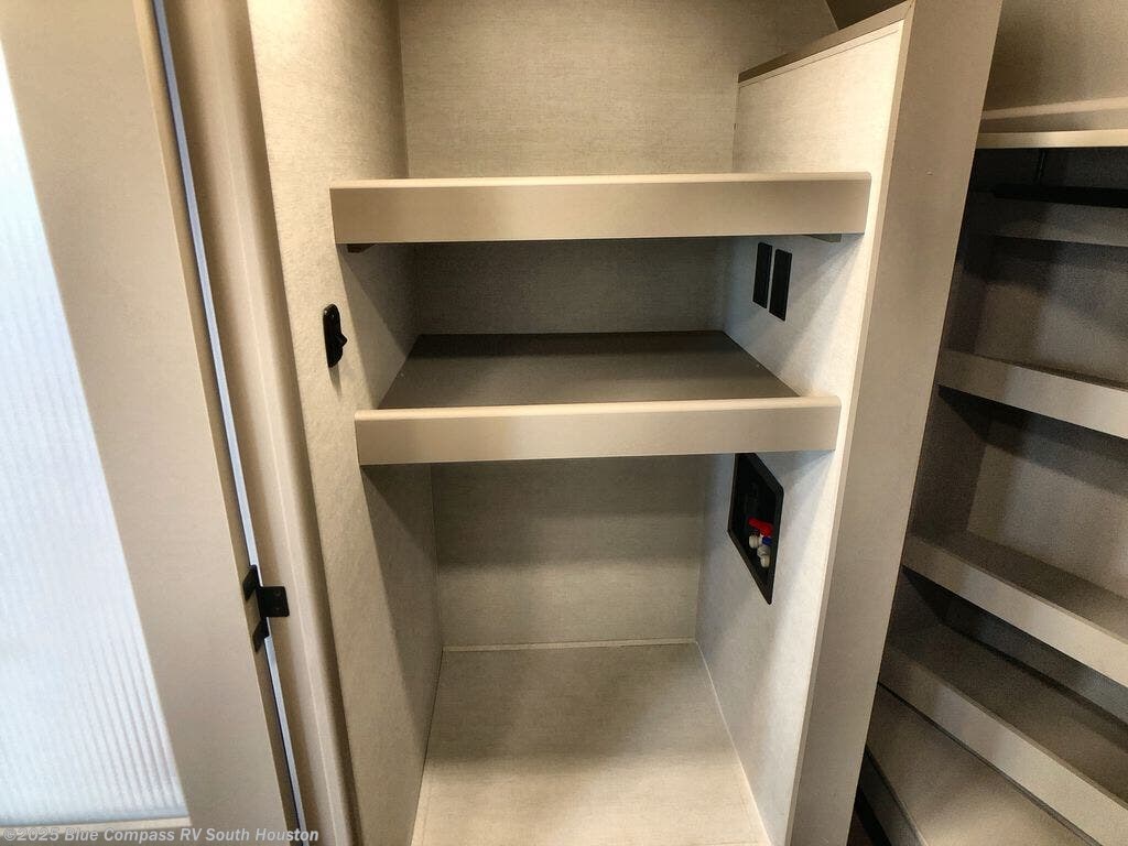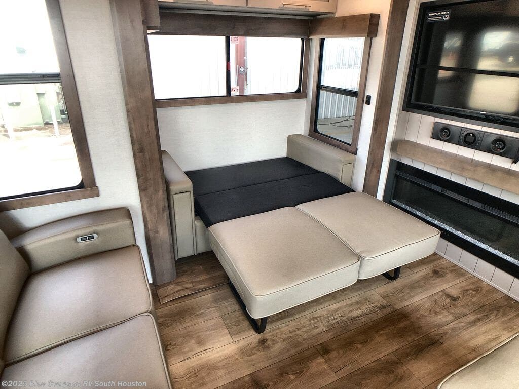 You won't want to camp any other way once you step inside this fifth wheel! the chef will enjoy all of the space in the rear kitchen with ample counter space, a 19 cu. ft. 12 volt residential refrigerator, and a pantry for snacks. Everyone will love to meet in the middle living area that includes dual sleeper sofas and a dual recliner loveseat across from the 50" Smart TV and fireplace. The half bathroom is nearby for quick bathroom breaks too. You will feel right at home in the master suite with a king bed slide to lay your head on at night, a flip top dresser with a Smart TV above it to watch your movies in true comfort, and a seat with storage, plus access to the front full bathroom. Inside the bathroom, you will find a 61" x 30" shower to freshen up in and a walk-in closet with a hamper, shelves, and washer and dryer prep for clean clothes throughout your entire trip!