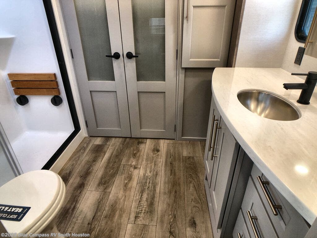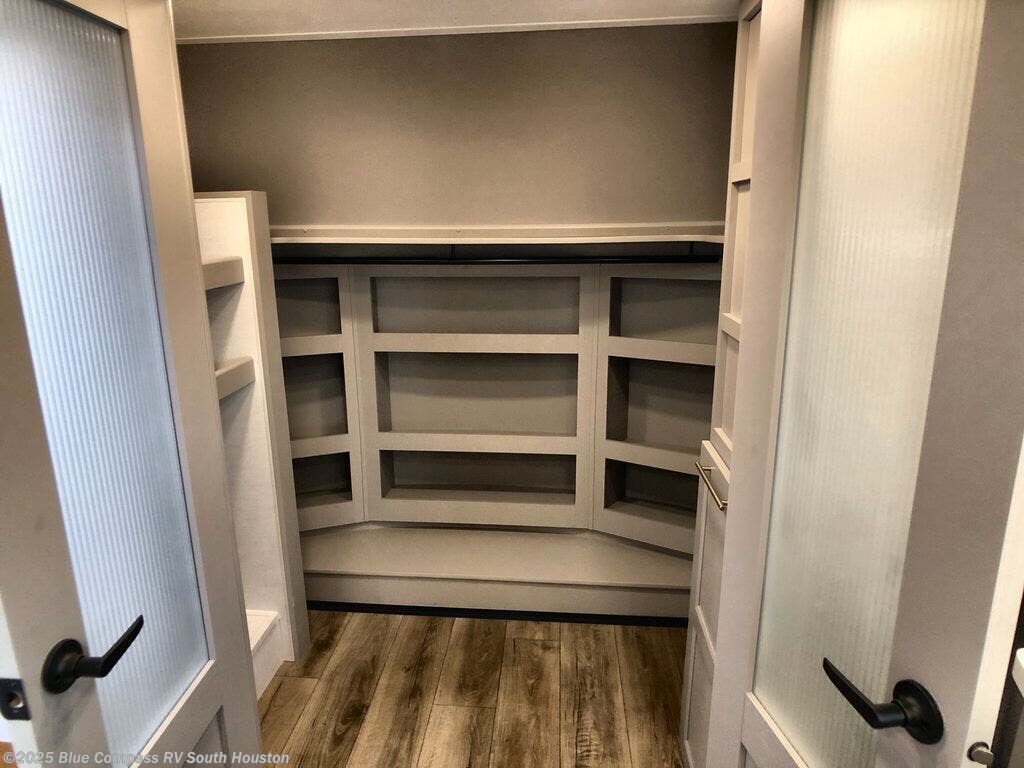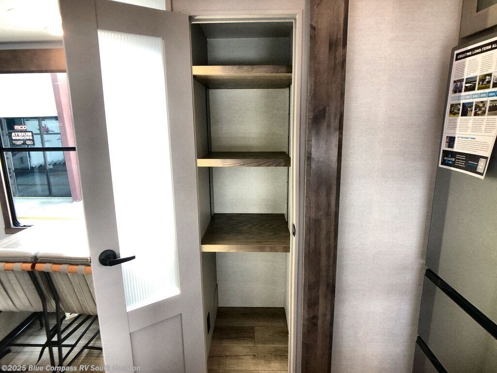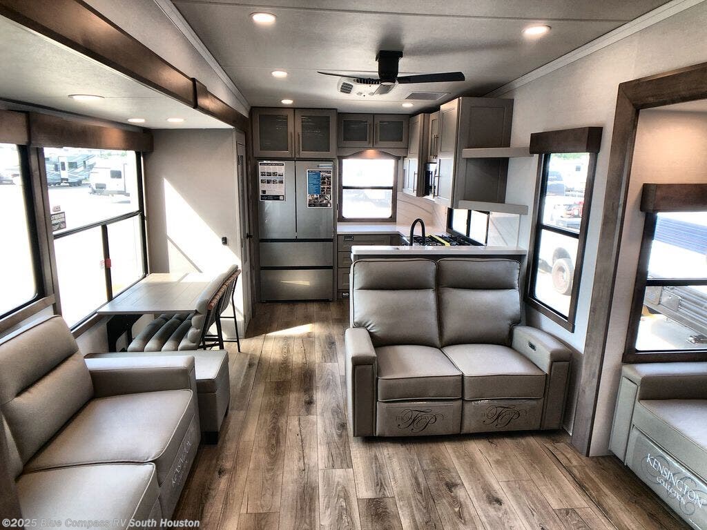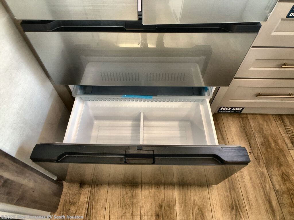 You won't want to camp any other way once you step inside this fifth wheel! the chef will enjoy all of the space in the rear kitchen with ample counter space, a 19 cu. ft. 12 volt residential refrigerator, and a pantry for snacks. Everyone will love to meet in the middle living area that includes dual sleeper sofas and a dual recliner loveseat across from the 50" Smart TV and fireplace. The half bathroom is nearby for quick bathroom breaks too. You will feel right at home in the master suite with a king bed slide to lay your head on at night, a flip top dresser with a Smart TV above it to watch your movies in true comfort, and a seat with storage, plus access to the front full bathroom. Inside the bathroom, you will find a 61" x 30" shower to freshen up in and a walk-in closet with a hamper, shelves, and washer and dryer prep for clean clothes throughout your entire trip!