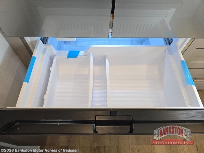 You won't want to camp any other way once you step inside this fifth wheel! the chef will enjoy all of the space in the rear kitchen with ample counter space, a 19 cu. ft. 12 volt residential refrigerator, and a pantry for snacks. Everyone will love to meet in the middle living area that includes dual sleeper sofas and a dual recliner loveseat across from the 50" Smart TV and fireplace. The half bathroom is nearby for quick bathroom breaks too. You will feel right at home in the master suite with a king bed slide to lay your head on at night, a flip top dresser with a Smart TV above it to watch your movies in true comfort, and a seat with storage, plus access to the front full bathroom. Inside the bathroom, you will find a 61" x 30" shower to freshen up in and a walk-in closet with a hamper, shelves, and washer and dryer prep for clean clothes throughout your entire trip!