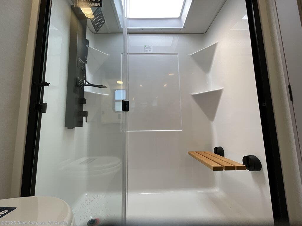 You won't want to camp any other way once you step inside this fifth wheel! the chef will enjoy all of the space in the rear kitchen with ample counter space, a 19 cu. ft. 12 volt residential refrigerator, and a pantry for snacks. Everyone will love to meet in the middle living area that includes dual sleeper sofas and a dual recliner loveseat across from the 50" Smart TV and fireplace. The half bathroom is nearby for quick bathroom breaks too. You will feel right at home in the master suite with a king bed slide to lay your head on at night, a flip top dresser with a Smart TV above it to watch your movies in true comfort, and a seat with storage, plus access to the front full bathroom. Inside the bathroom, you will find a 61" x 30" shower to freshen up in and a walk-in closet with a hamper, shelves, and washer and dryer prep for clean clothes throughout your entire trip!