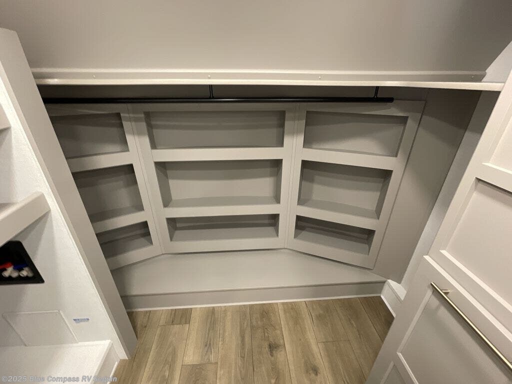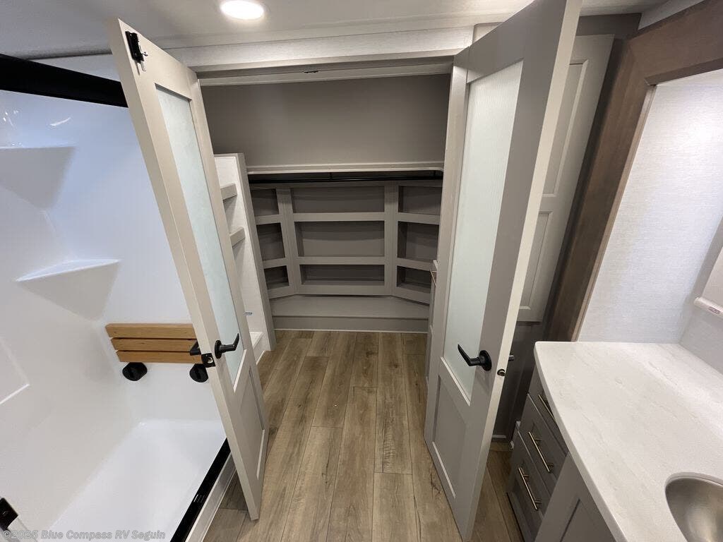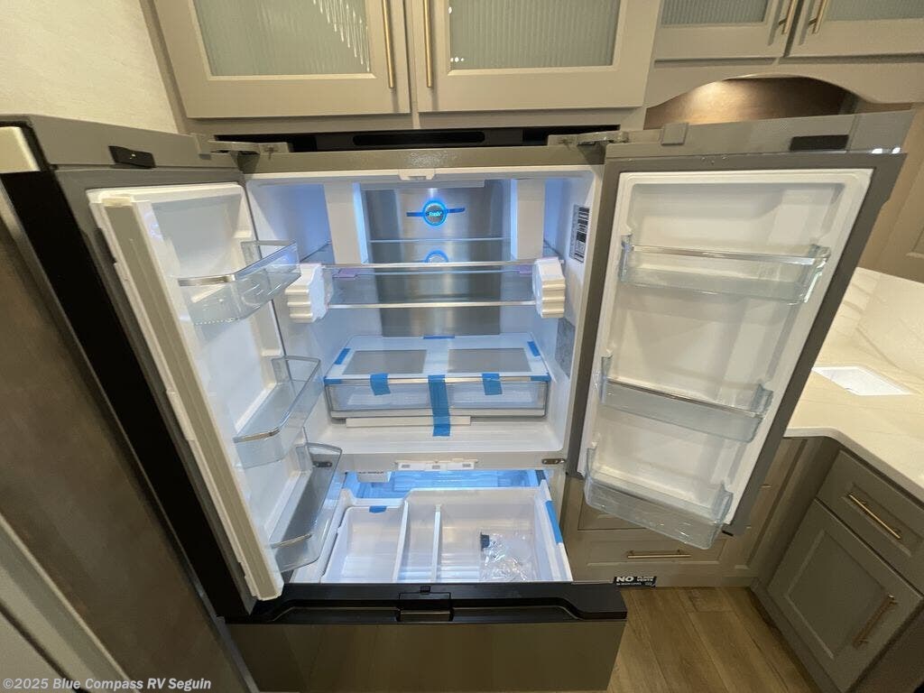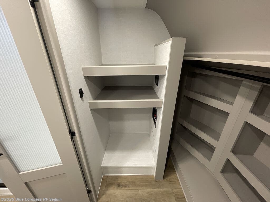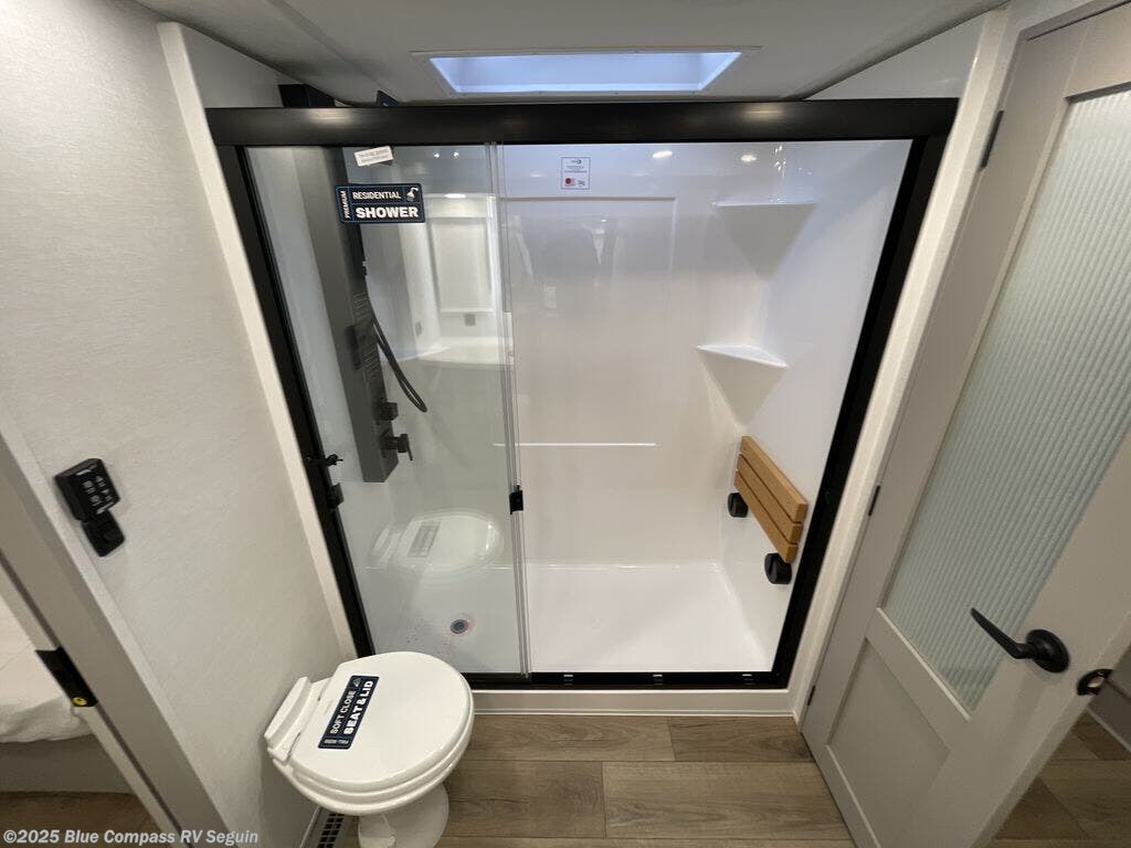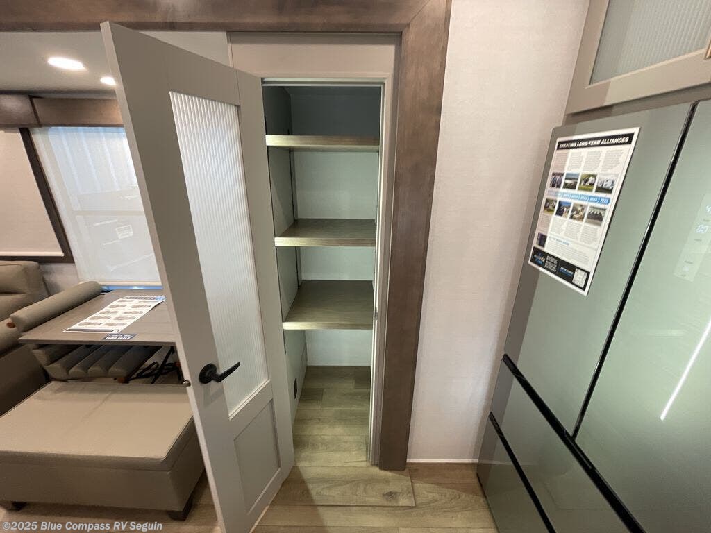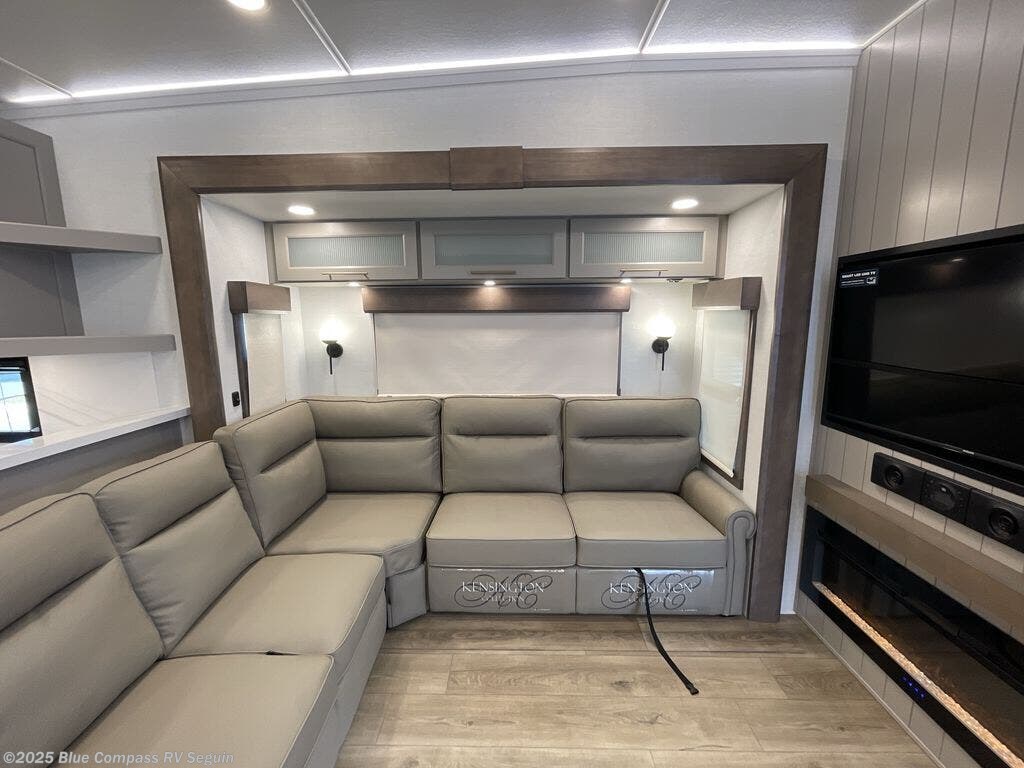 You won't want to camp any other way once you step inside this fifth wheel! the chef will enjoy all of the space in the rear kitchen with ample counter space, a 19 cu. ft. 12 volt residential refrigerator, and a pantry for snacks. Everyone will love to meet in the middle living area that includes dual sleeper sofas and a dual recliner loveseat across from the 50" Smart TV and fireplace. The half bathroom is nearby for quick bathroom breaks too. You will feel right at home in the master suite with a king bed slide to lay your head on at night, a flip top dresser with a Smart TV above it to watch your movies in true comfort, and a seat with storage, plus access to the front full bathroom. Inside the bathroom, you will find a 61" x 30" shower to freshen up in and a walk-in closet with a hamper, shelves, and washer and dryer prep for clean clothes throughout your entire trip!