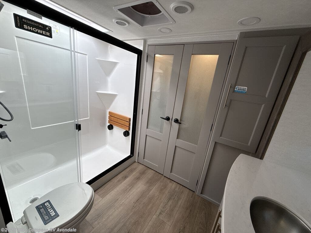 You won't want to camp any other way once you step inside this fifth wheel! the chef will enjoy all of the space in the rear kitchen with ample counter space, a 19 cu. ft. 12 volt residential refrigerator, and a pantry for snacks. Everyone will love to meet in the middle living area that includes dual sleeper sofas and a dual recliner loveseat across from the 50" Smart TV and fireplace. The half bathroom is nearby for quick bathroom breaks too. You will feel right at home in the master suite with a king bed slide to lay your head on at night, a flip top dresser with a Smart TV above it to watch your movies in true comfort, and a seat with storage, plus access to the front full bathroom. Inside the bathroom, you will find a 61" x 30" shower to freshen up in and a walk-in closet with a hamper, shelves, and washer and dryer prep for clean clothes throughout your entire trip!