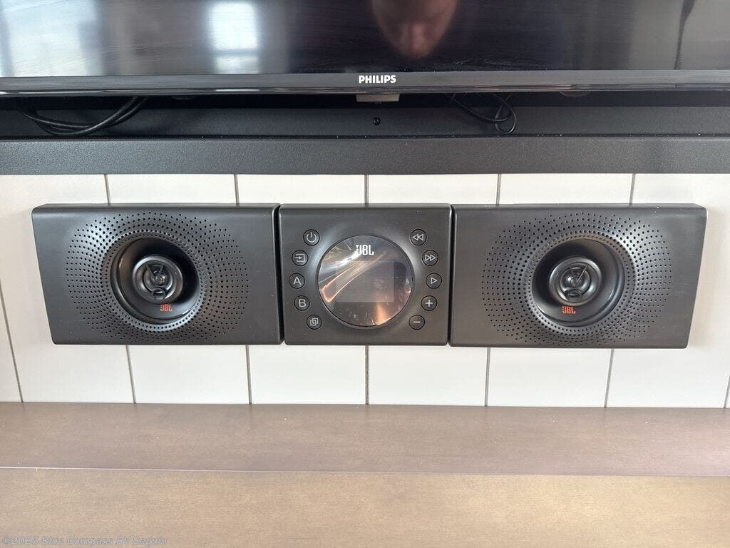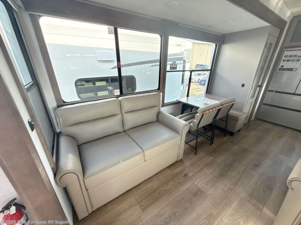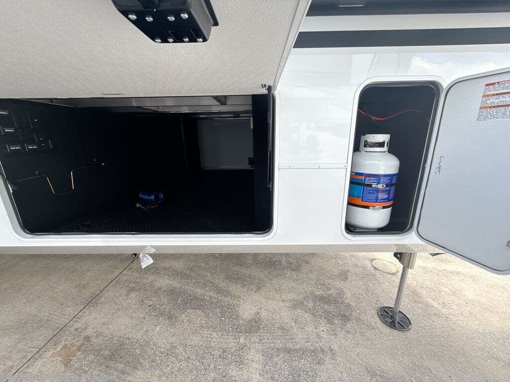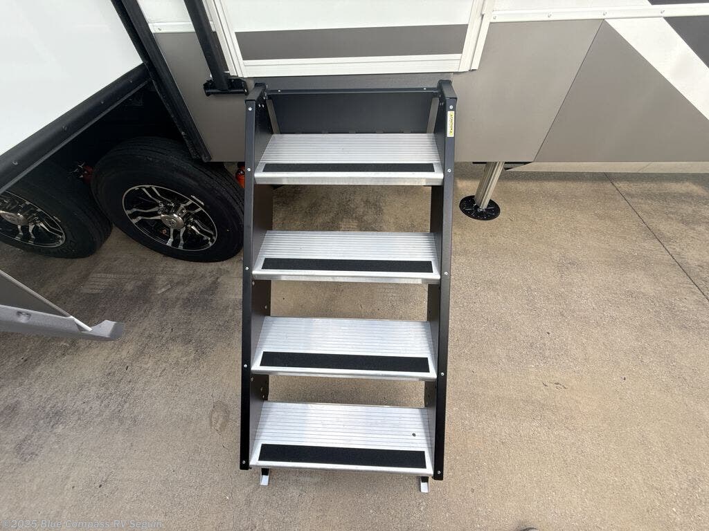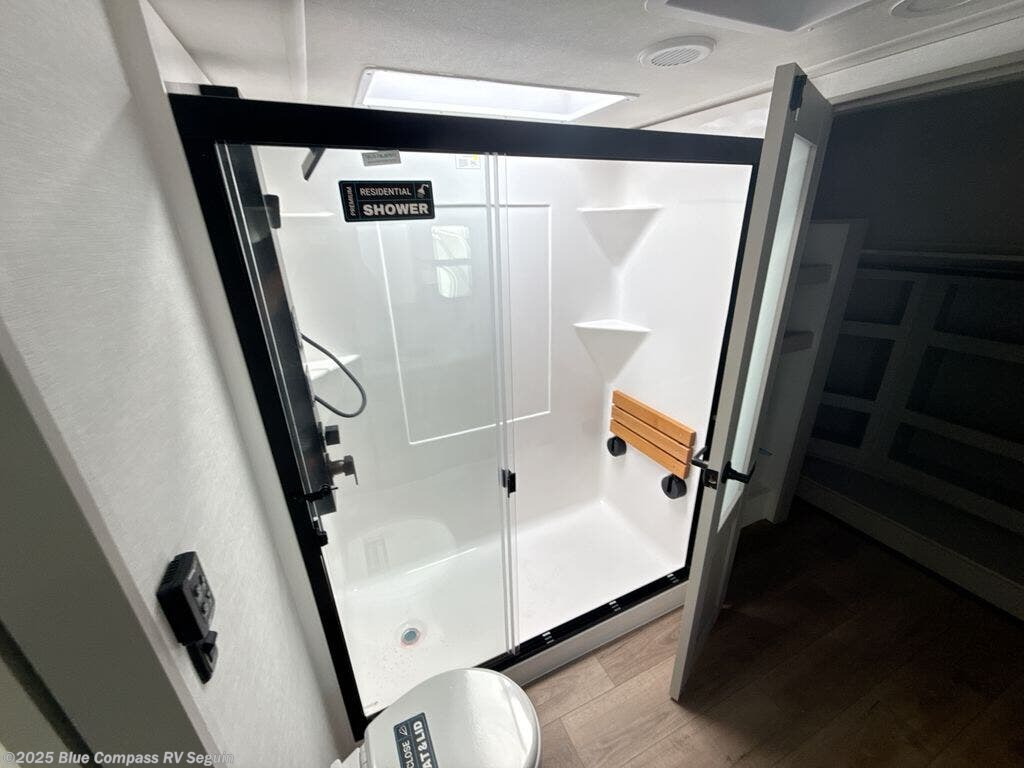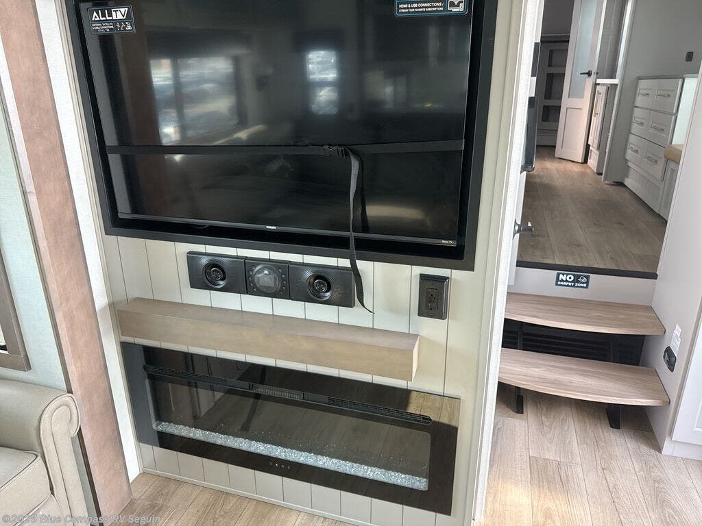 You won't want to camp any other way once you step inside this fifth wheel! the chef will enjoy all of the space in the rear kitchen with ample counter space, a 19 cu. ft. 12 volt residential refrigerator, and a pantry for snacks. Everyone will love to meet in the middle living area that includes dual sleeper sofas and a dual recliner loveseat across from the 50" Smart TV and fireplace. The half bathroom is nearby for quick bathroom breaks too. You will feel right at home in the master suite with a king bed slide to lay your head on at night, a flip top dresser with a Smart TV above it to watch your movies in true comfort, and a seat with storage, plus access to the front full bathroom. Inside the bathroom, you will find a 61" x 30" shower to freshen up in and a walk-in closet with a hamper, shelves, and washer and dryer prep for clean clothes throughout your entire trip!