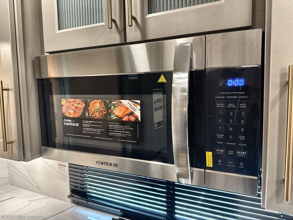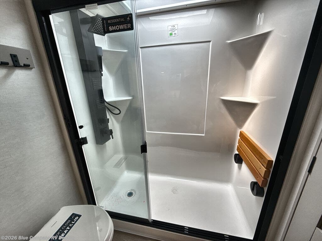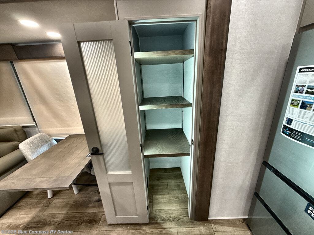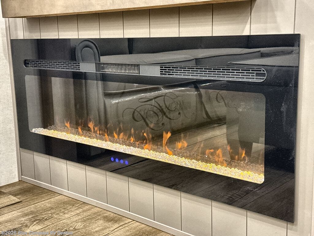 You won't want to camp any other way once you step inside this fifth wheel! the chef will enjoy all of the space in the rear kitchen with ample counter space, a 19 cu. ft. 12 volt residential refrigerator, and a pantry for snacks. Everyone will love to meet in the middle living area that includes dual sleeper sofas and a dual recliner loveseat across from the 50" Smart TV and fireplace. The half bathroom is nearby for quick bathroom breaks too. You will feel right at home in the master suite with a king bed slide to lay your head on at night, a flip top dresser with a Smart TV above it to watch your movies in true comfort, and a seat with storage, plus access to the front full bathroom. Inside the bathroom, you will find a 61" x 30" shower to freshen up in and a walk-in closet with a hamper, shelves, and washer and dryer prep for clean clothes throughout your entire trip!