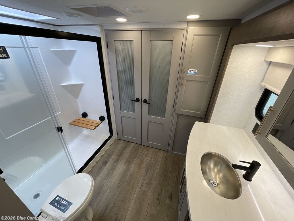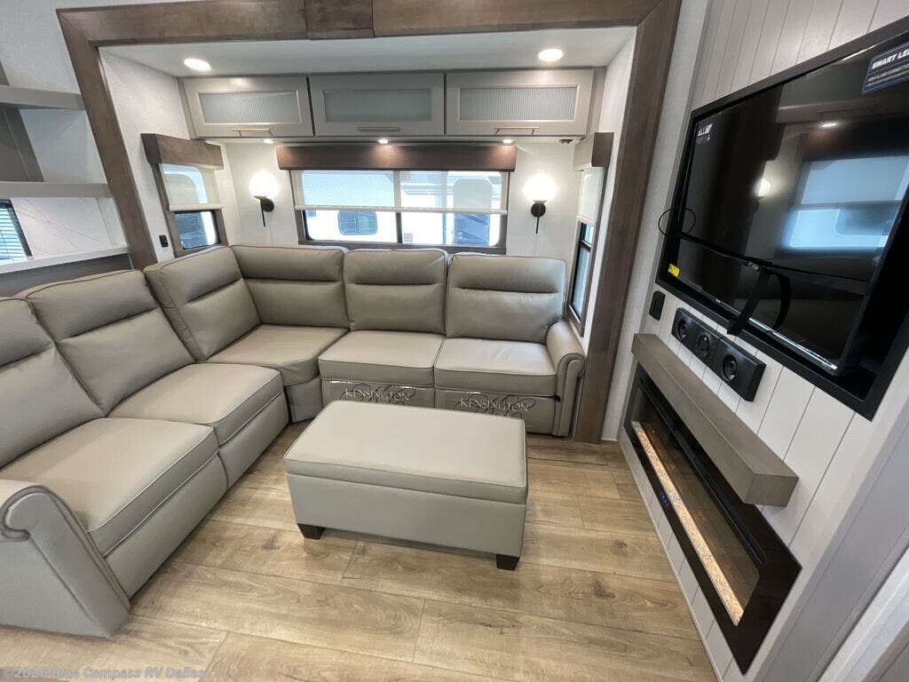 You won't want to camp any other way once you step inside this fifth wheel! the chef will enjoy all of the space in the rear kitchen with ample counter space, a 19 cu. ft. 12 volt residential refrigerator, and a pantry for snacks. Everyone will love to meet in the middle living area that includes dual sleeper sofas and a dual recliner loveseat across from the 50" Smart TV and fireplace. The half bathroom is nearby for quick bathroom breaks too. You will feel right at home in the master suite with a king bed slide to lay your head on at night, a flip top dresser with a Smart TV above it to watch your movies in true comfort, and a seat with storage, plus access to the front full bathroom. Inside the bathroom, you will find a 61" x 30" shower to freshen up in and a walk-in closet with a hamper, shelves, and washer and dryer prep for clean clothes throughout your entire trip!