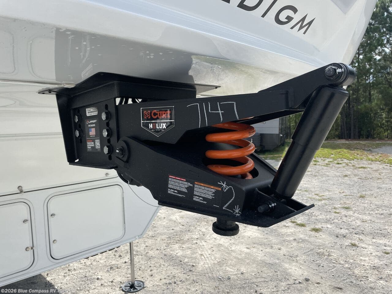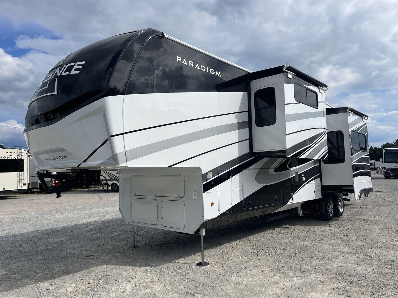 The Paradigm fifth wheels by Alliance RV are functional, high-quality, and luxurious for an unforgettable camping experience. There are three A/C units and a 40K BTU furnace to keep you comfortable year around, and you'll appreciate additional convenient amenities, like the all-in-one enclosed/heated utility center and the color coded and numbered wiring. A Helux Series coil spring pin box comes standard for hassle-free towing, along with Super-G 4,400 lb. rated tires and Dexter 7,000 lb. axles. You'll love the kitchen with its LG solid surface countertops and Lusso range, plus there is LED motion lighting in the pantry and a Maxx fan with a rain sensor to keep everything fresh when making dinner. Each model also includes an HD Smart TV in the living room and bedroom, plus a Winegard Air 360 antenna to keep you connected to the outside world. And of course there are a variety of options you can choose from to further customize your fifth wheel; dual pane windows, Super Solar Plus, slide out awning toppers, and generator prep or a generator to name a few!