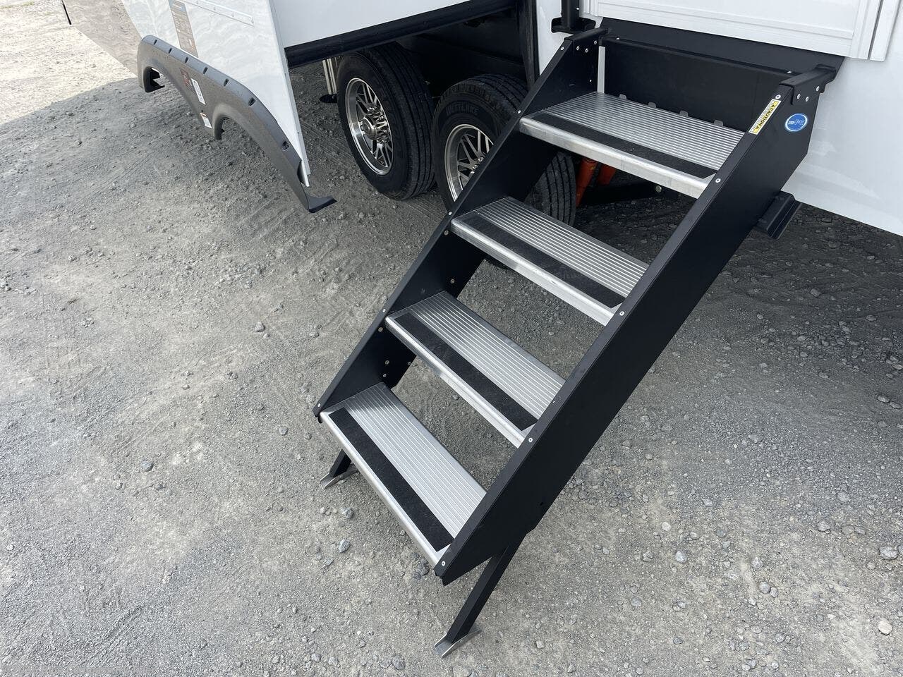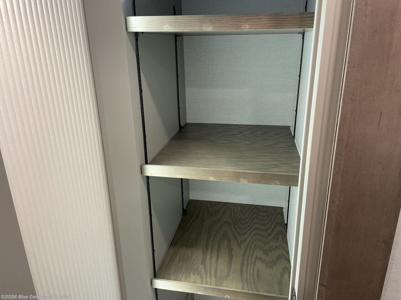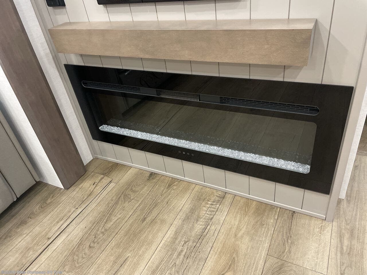 You won't want to camp any other way once you step inside this fifth wheel! the chef will enjoy all of the space in the rear kitchen with ample counter space, a 19 cu. ft. 12 volt residential refrigerator, and a pantry for snacks. Everyone will love to meet in the middle living area that includes dual sleeper sofas and a dual recliner loveseat across from the 50" Smart TV and fireplace. The half bathroom is nearby for quick bathroom breaks too. You will feel right at home in the master suite with a king bed slide to lay your head on at night, a flip top dresser with a Smart TV above it to watch your movies in true comfort, and a seat with storage, plus access to the front full bathroom. Inside the bathroom, you will find a 61" x 30" shower to freshen up in and a walk-in closet with a hamper, shelves, and washer and dryer prep for clean clothes throughout your entire trip!
