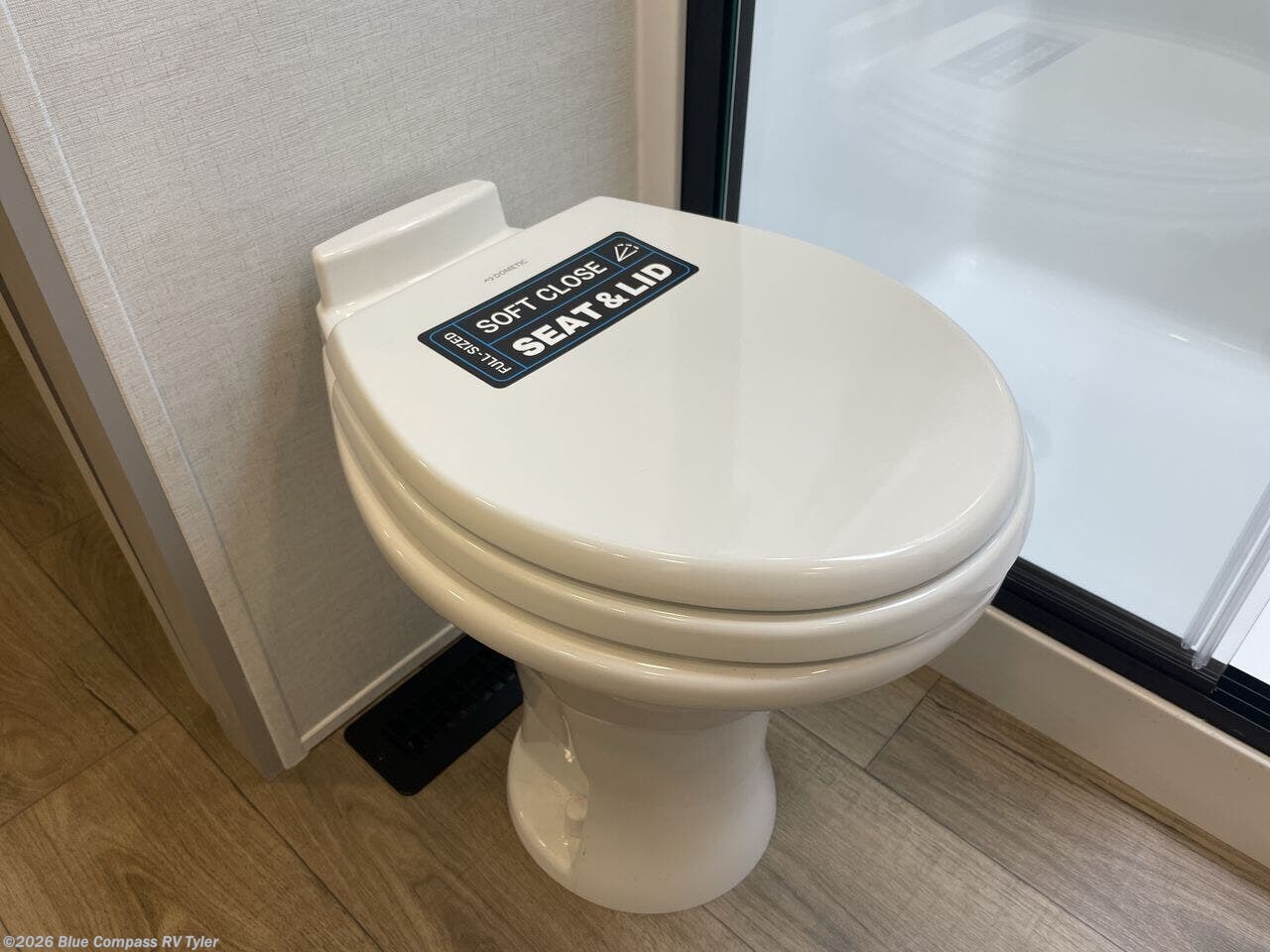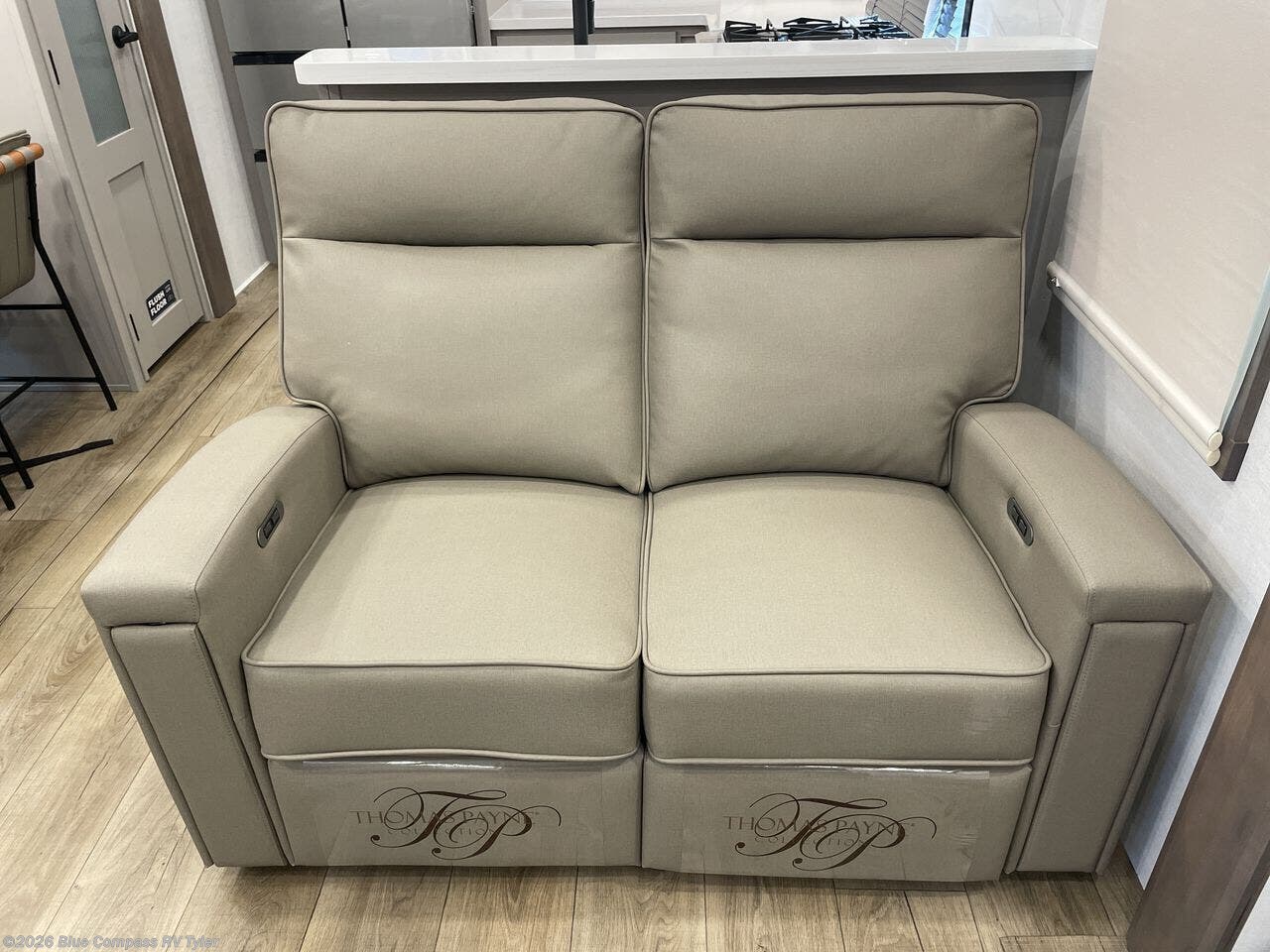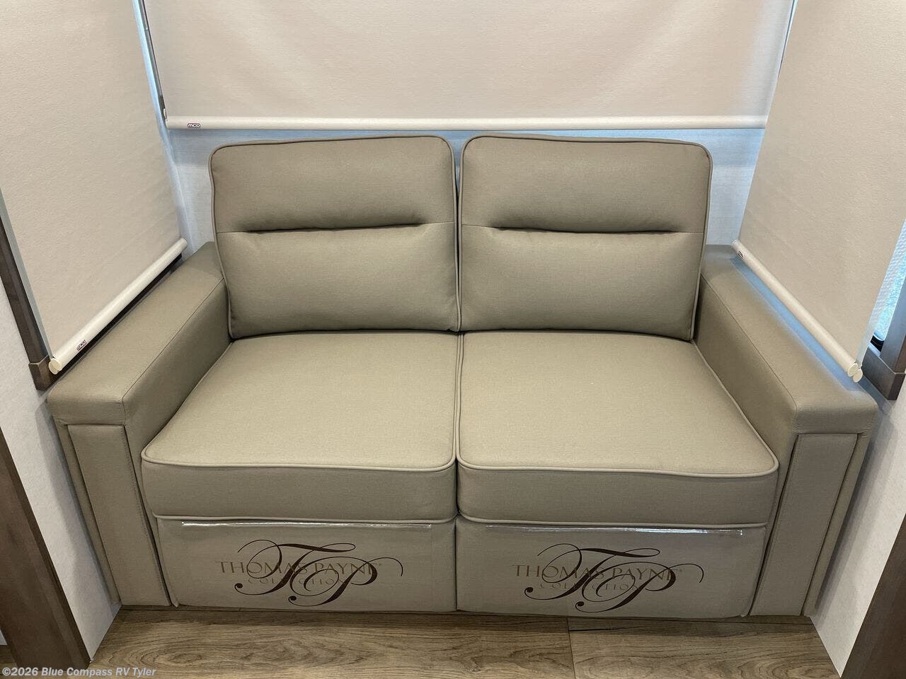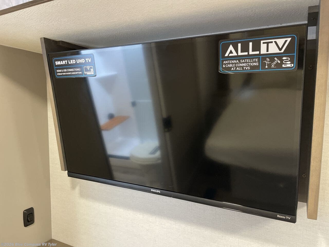 You won't want to camp any other way once you step inside this fifth wheel! the chef will enjoy all of the space in the rear kitchen with ample counter space, a 19 cu. ft. 12 volt residential refrigerator, and a pantry for snacks. Everyone will love to meet in the middle living area that includes dual sleeper sofas and a dual recliner loveseat across from the 50" Smart TV and fireplace. The half bathroom is nearby for quick bathroom breaks too. You will feel right at home in the master suite with a king bed slide to lay your head on at night, a flip top dresser with a Smart TV above it to watch your movies in true comfort, and a seat with storage, plus access to the front full bathroom. Inside the bathroom, you will find a 61" x 30" shower to freshen up in and a walk-in closet with a hamper, shelves, and washer and dryer prep for clean clothes throughout your entire trip!