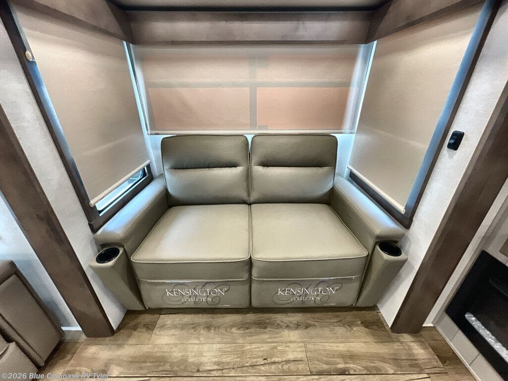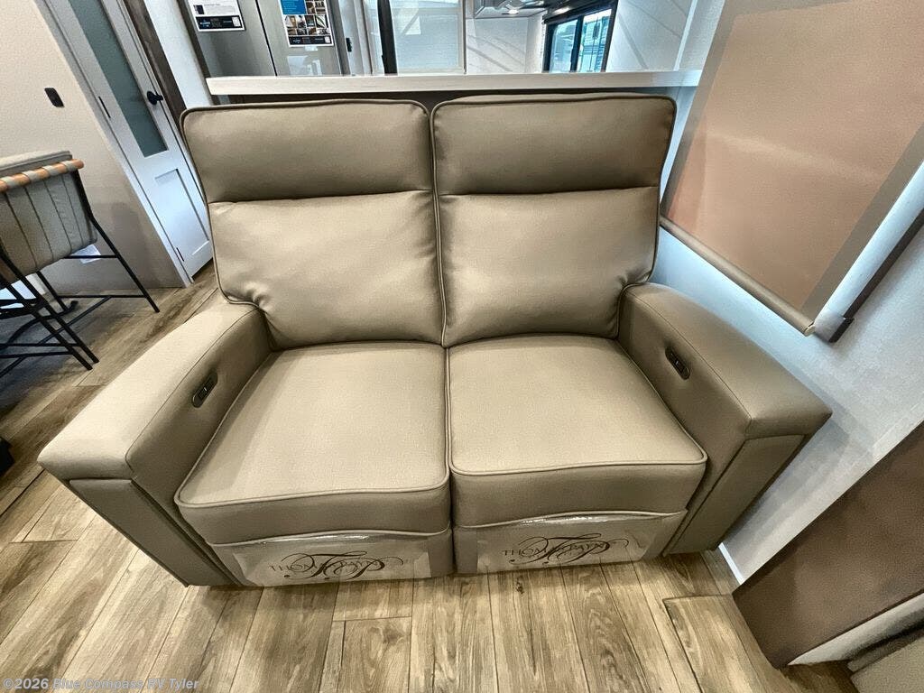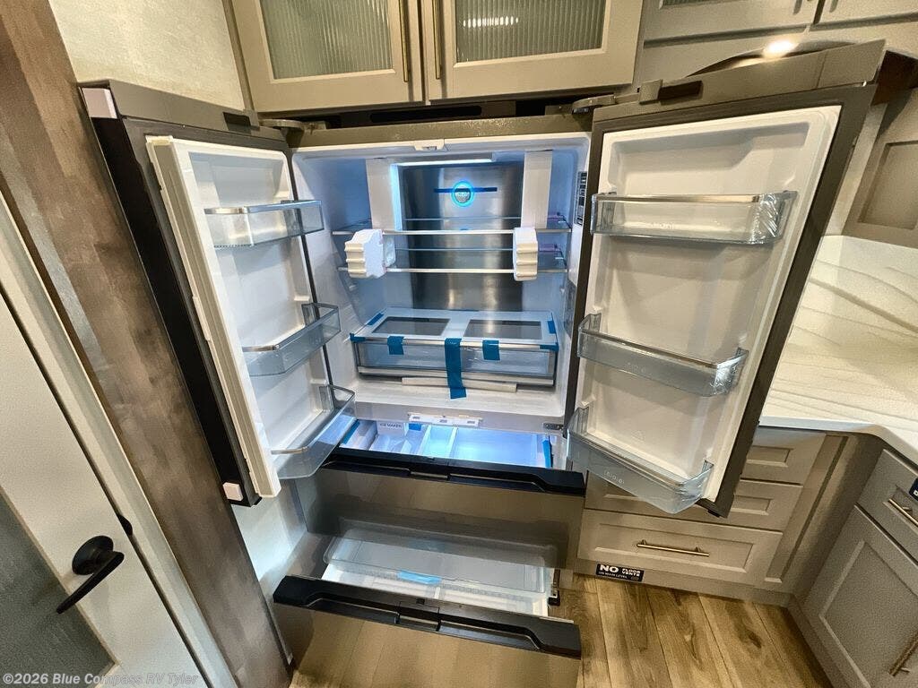 You won't want to camp any other way once you step inside this fifth wheel! the chef will enjoy all of the space in the rear kitchen with ample counter space, a 19 cu. ft. 12 volt residential refrigerator, and a pantry for snacks. Everyone will love to meet in the middle living area that includes dual sleeper sofas and a dual recliner loveseat across from the 50" Smart TV and fireplace. The half bathroom is nearby for quick bathroom breaks too. You will feel right at home in the master suite with a king bed slide to lay your head on at night, a flip top dresser with a Smart TV above it to watch your movies in true comfort, and a seat with storage, plus access to the front full bathroom. Inside the bathroom, you will find a 61" x 30" shower to freshen up in and a walk-in closet with a hamper, shelves, and washer and dryer prep for clean clothes throughout your entire trip!