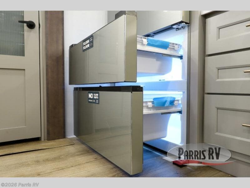 You won't want to camp any other way once you step inside this fifth wheel! the chef will enjoy all of the space in the rear kitchen with ample counter space, a 19 cu. ft. 12 volt residential refrigerator, and a pantry for snacks. Everyone will love to meet in the middle living area that includes dual sleeper sofas and a dual recliner loveseat across from the 50" Smart TV and fireplace. The half bathroom is nearby for quick bathroom breaks too. You will feel right at home in the master suite with a king bed slide to lay your head on at night, a flip top dresser with a Smart TV above it to watch your movies in true comfort, and a seat with storage, plus access to the front full bathroom. Inside the bathroom, you will find a 61" x 30" shower to freshen up in and a walk-in closet with a hamper, shelves, and washer and dryer prep for clean clothes throughout your entire trip!