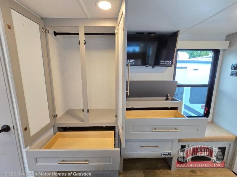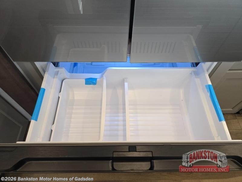 An active family will want this fifth wheel with its 48" x 115" exterior basement pull-out tray for kayaks or extra storage. Just above this area is the master suite with a rear bathroom that offers a residential shower, a porcelain toilet with soft close seat, plus a wardrobe and shelf storage. The king bed slide gives you more floor space, and you will have a seat, a flip-top dresser, and a Smart TV to watch movies in bed. The half bath is next to the main entry which is super convenient, and the middle kitchen is separate from the front living area. The cook will love the residential microwave, range and oven, plus the 19 cu. ft. 12 volt residential refrigerator. There is also a pantry and extra counter space on the kitchen island with a large sink. The views out of the atrium windows in the slide out, which includes the swivel table and desk, are a must see. And when you need to watch the big game, the 55" Smart TV with a pull-out fireplace storage are up front with the dual recliner love seat and two sleeper sofas.