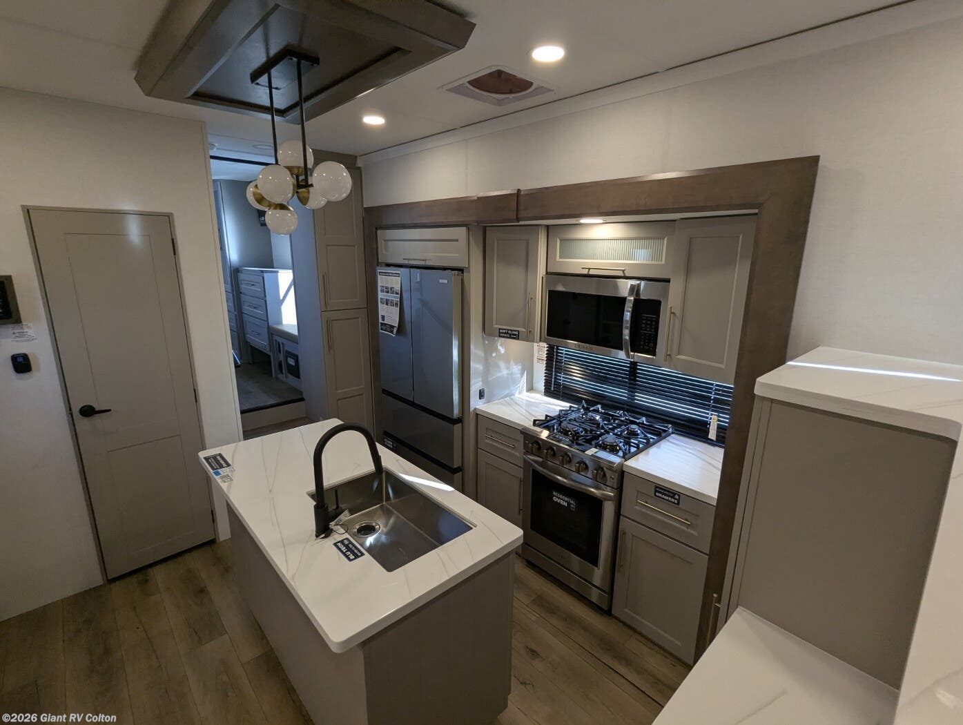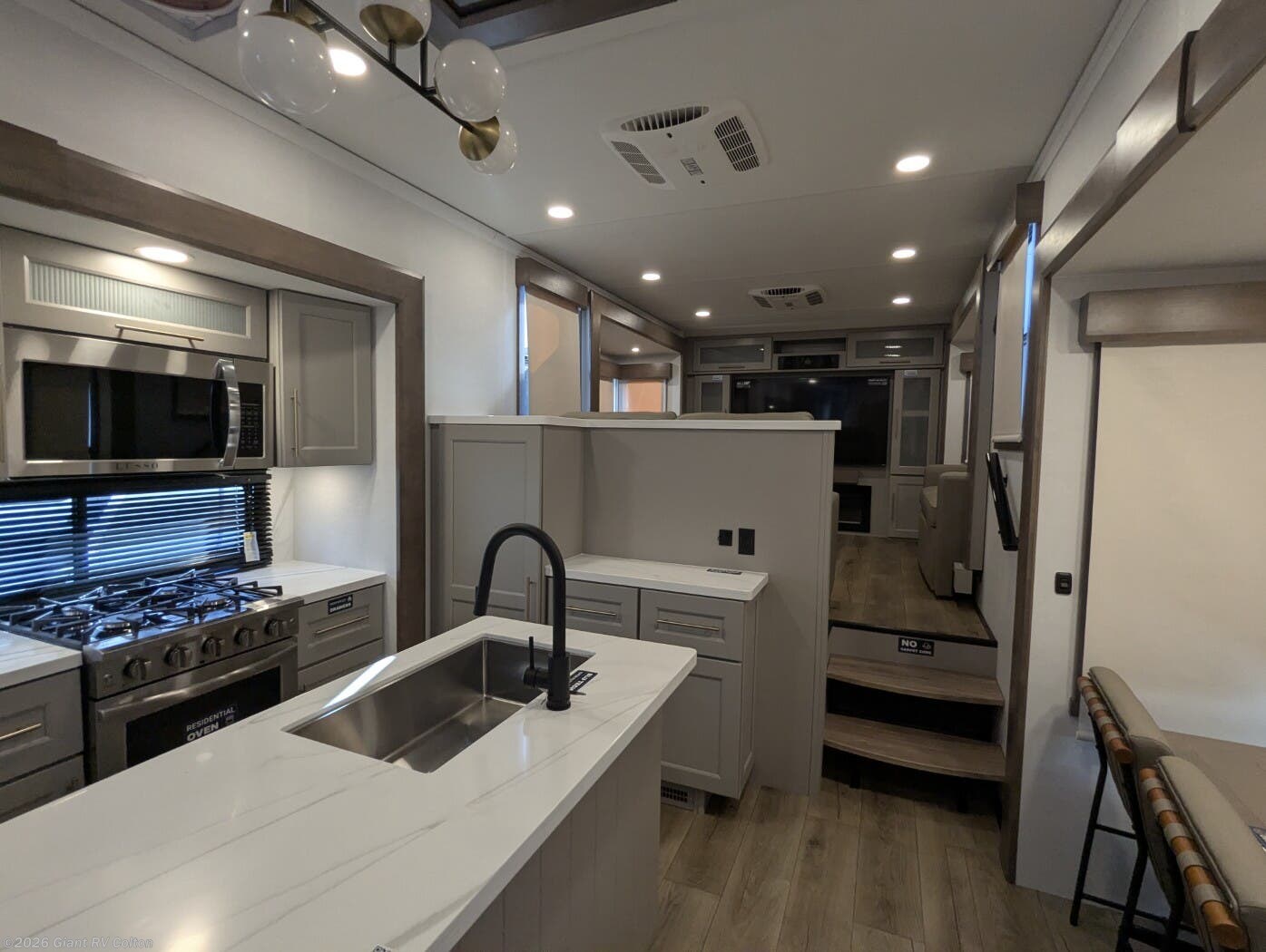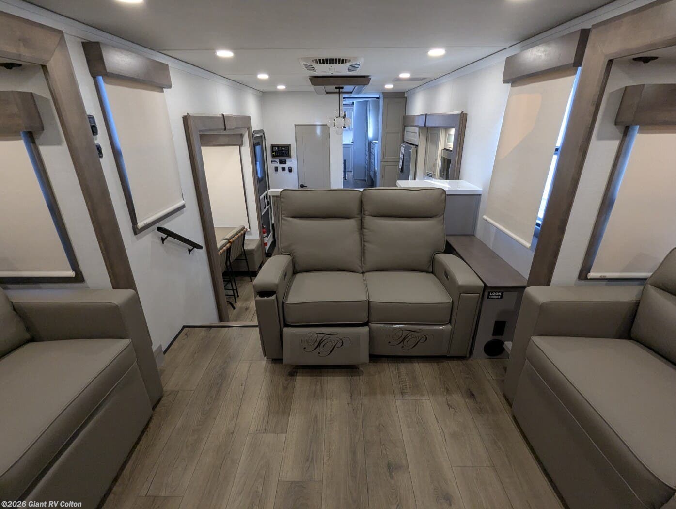 - Front Living Retreat: Sleeps up to 6 with two sleeper sofas, swivel table and desk, theater seating, and kitchen island, enhanced by five slideouts for a grand interior.