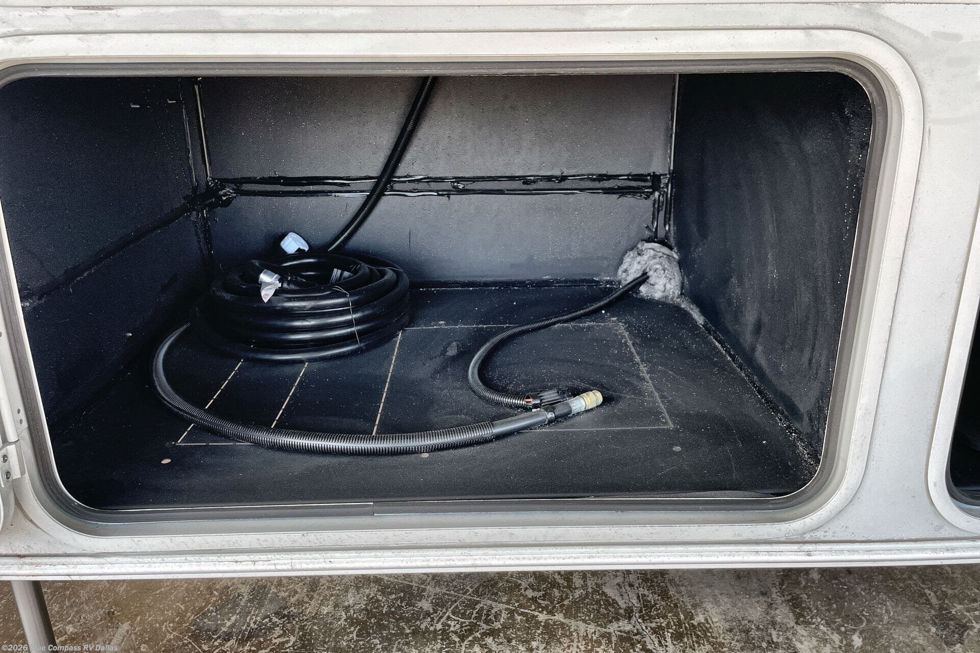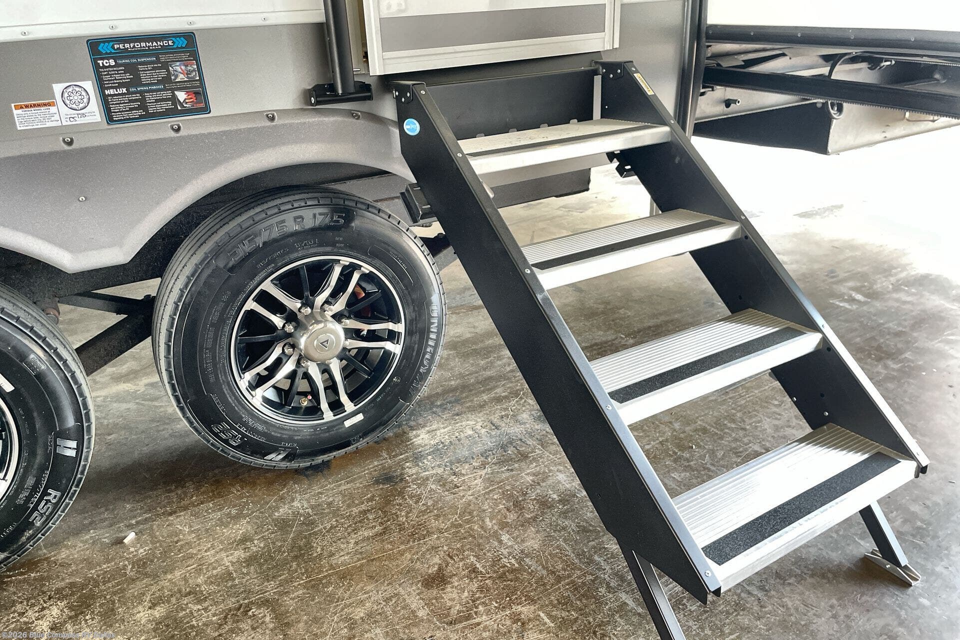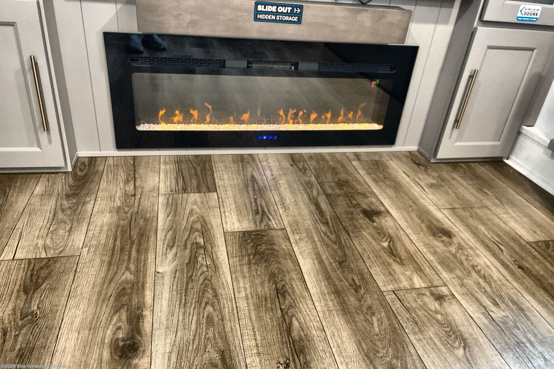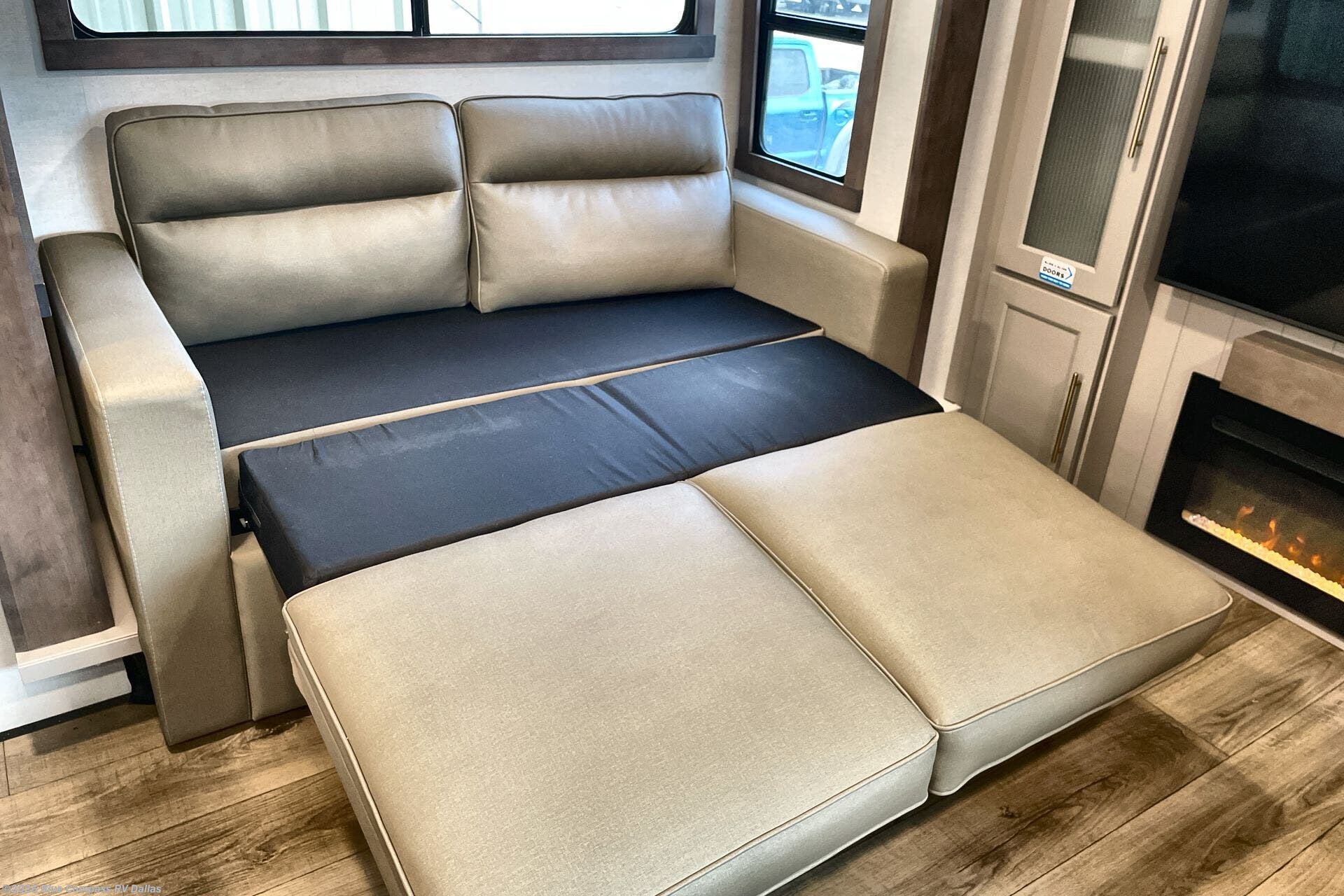 An active family will want this fifth wheel with its 48" x 115" exterior basement pull-out tray for kayaks or extra storage. Just above this area is the master suite with a rear bathroom that offers a residential shower, a porcelain toilet with soft close seat, plus a wardrobe and shelf storage. The king bed slide gives you more floor space, and you will have a seat, a flip-top dresser, and a Smart TV to watch movies in bed. The half bath is next to the main entry which is super convenient, and the middle kitchen is separate from the front living area. The cook will love the residential microwave, range and oven, plus the 19 cu. ft. 12 volt residential refrigerator. There is also a pantry and extra counter space on the kitchen island with a large sink. The views out of the atrium windows in the slide out, which includes the swivel table and desk, are a must see. And when you need to watch the big game, the 55" Smart TV with a pull-out fireplace storage are up front with the dual recliner love seat and two sleeper sofas.