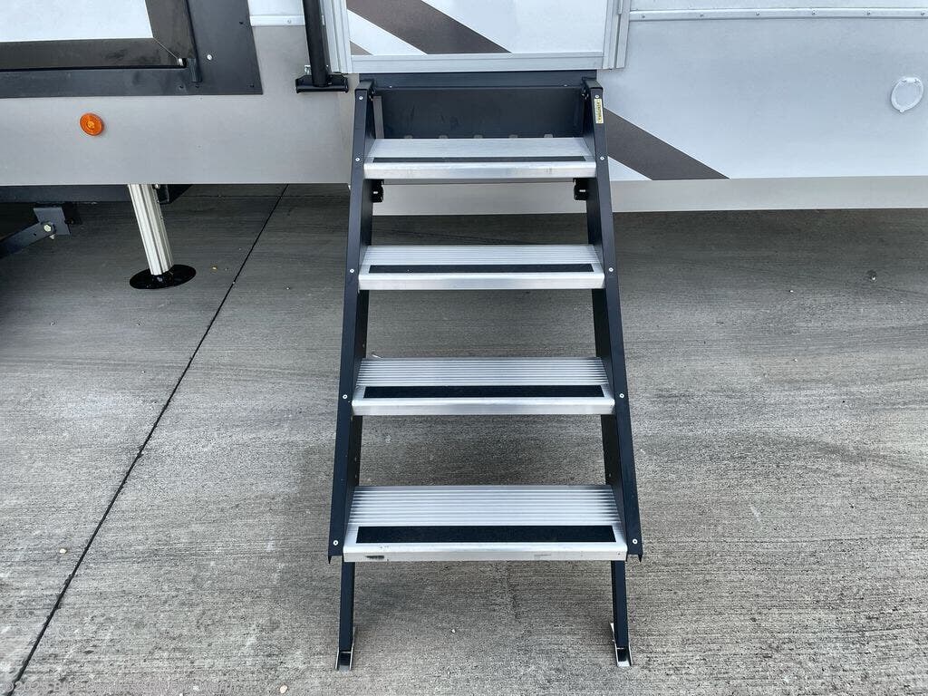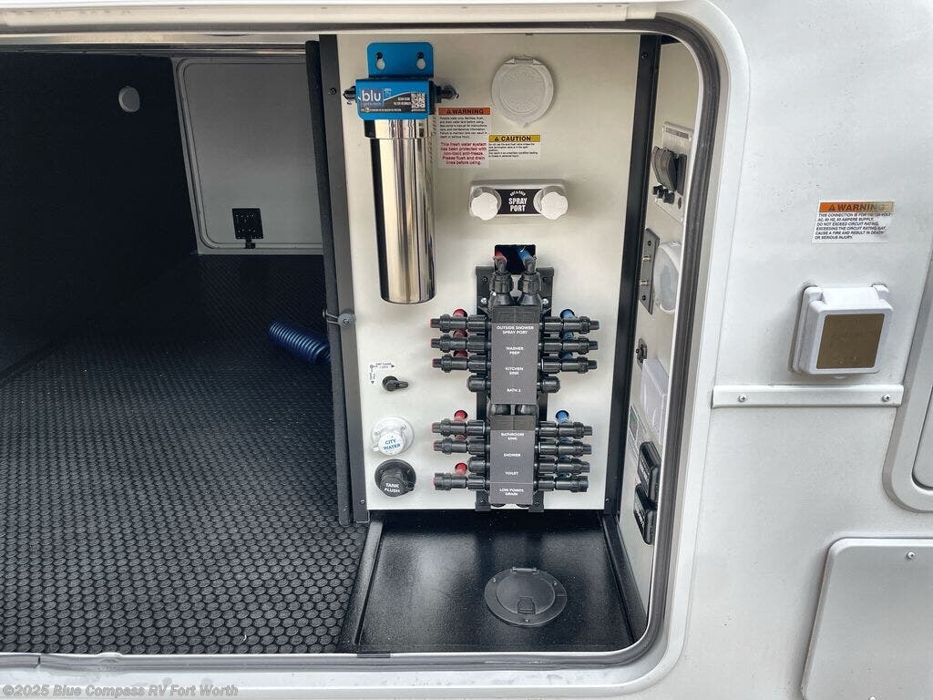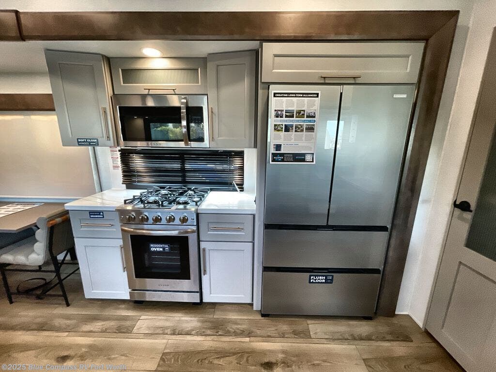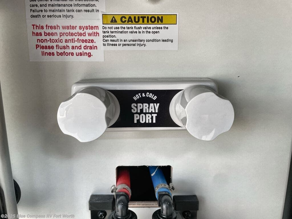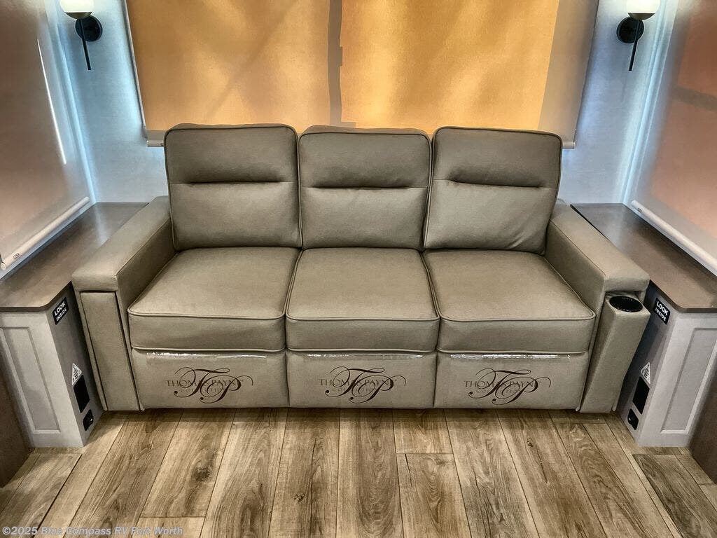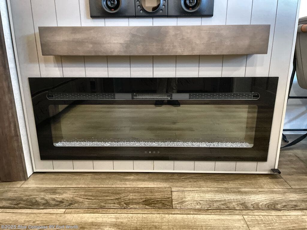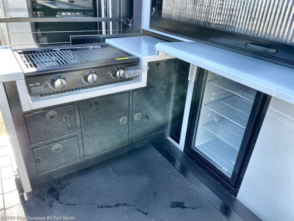 You will fall in love with this unit’s slide patio with picture window, the perfect spot to take in the breathtaking views. Enjoy outdoor cooking with the countertop prep area and pull-out grill, while the drop-down TV provides entertainment for all. Inside, rear living area features two sleeper sofas, perfect for lounging and relaxing. Overhead cabinets provide ample storage, while the 50” class smart TV offers endless entertainment options. Gather around the turn table dinette for meals or socializing. The kitchen is fully equipped with a microwave, sink, refrigerator, pantry, and hutch, making meal preparation and storage a breeze. Also this unit has a full bathroom and a cozy front bedroom which boast a king bed, ample closet, a TV, and so much more!