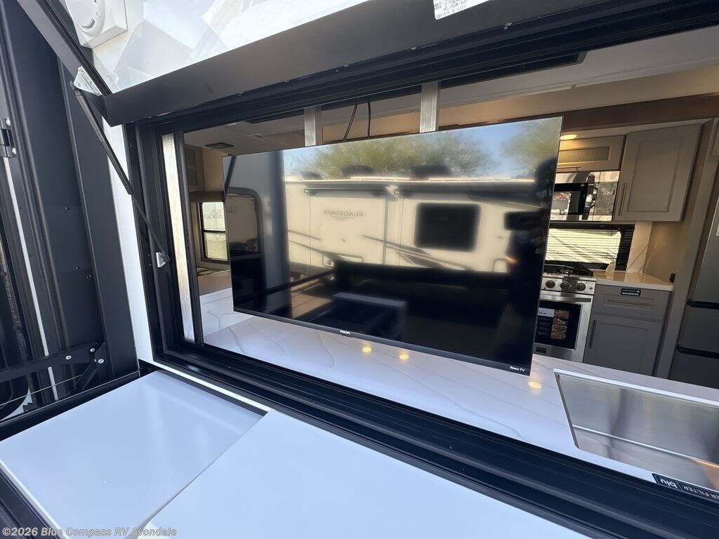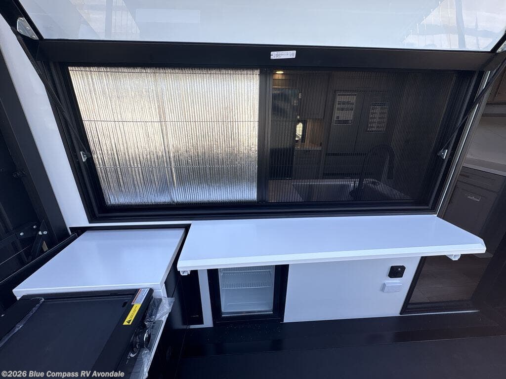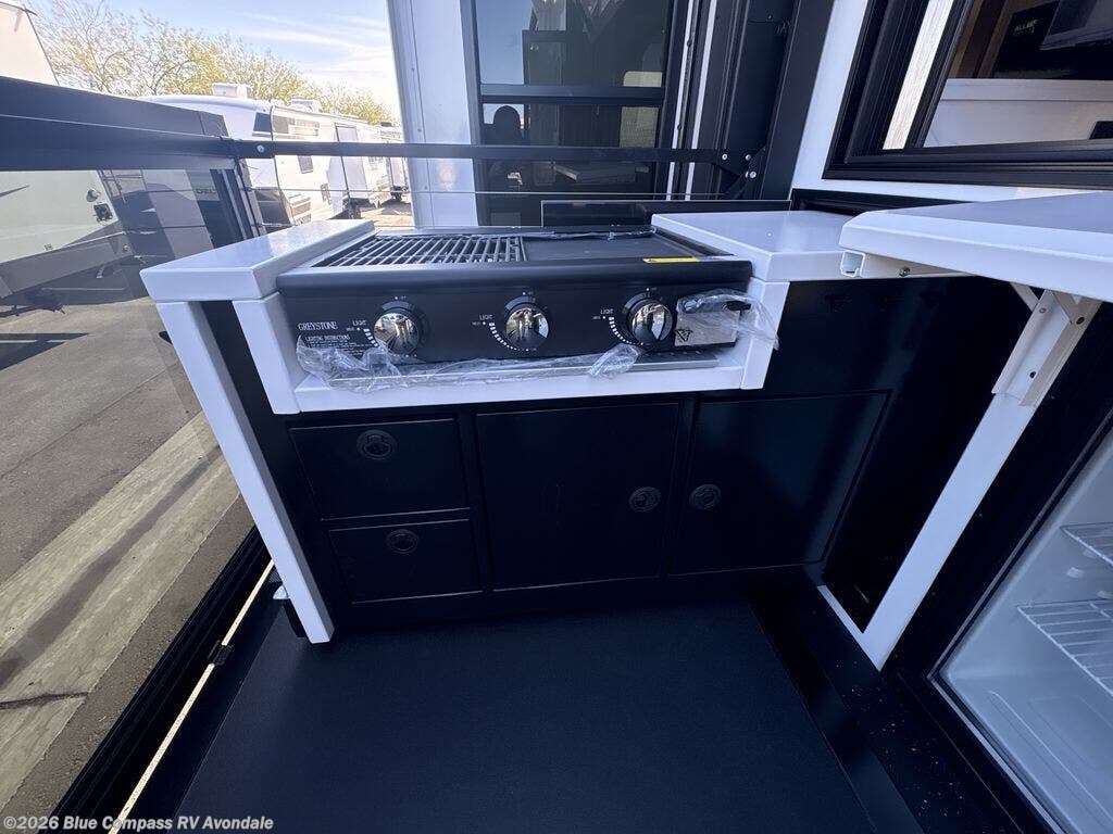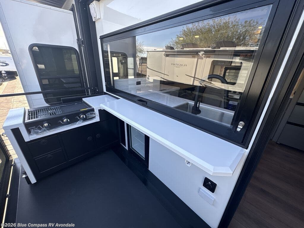 You will fall in love with this unit’s slide patio with picture window, the perfect spot to take in the breathtaking views. Enjoy outdoor cooking with the countertop prep area and pull-out grill, while the drop-down TV provides entertainment for all. Inside, rear living area features two sleeper sofas, perfect for lounging and relaxing. Overhead cabinets provide ample storage, while the 50” class smart TV offers endless entertainment options. Gather around the turn table dinette for meals or socializing. The kitchen is fully equipped with a microwave, sink, refrigerator, pantry, and hutch, making meal preparation and storage a breeze. Also this unit has a full bathroom and a cozy front bedroom which boast a king bed, ample closet, a TV, and so much more!