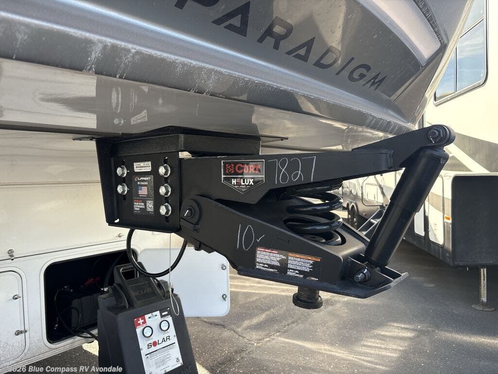The Paradigm fifth wheels by Alliance RV are functional, high-quality, and luxurious for an unforgettable camping experience. There are three A/C units and a 40K BTU furnace to keep you comfortable year around, and you'll appreciate additional convenient amenities, like the all-in-one enclosed/heated utility center and the color coded and numbered wiring. A Helux Series coil spring pin box comes standard for hassle-free towing, along with Curt 8,000 lb. axles. You'll love the kitchen with its LG solid surface countertops and Lusso range, plus there is LED motion lighting in the pantry and a Maxx fan with a rain sensor to keep everything fresh when making dinner. Each model also includes an HD Smart TV in the living room and bedroom. And of course there are a variety of options you can choose from to further customize your fifth wheel; dual pane windows, Super Solar Plus, slide out awning toppers, and generator prep or a generator to name a few!