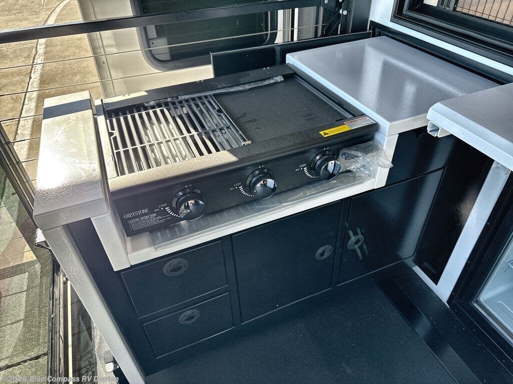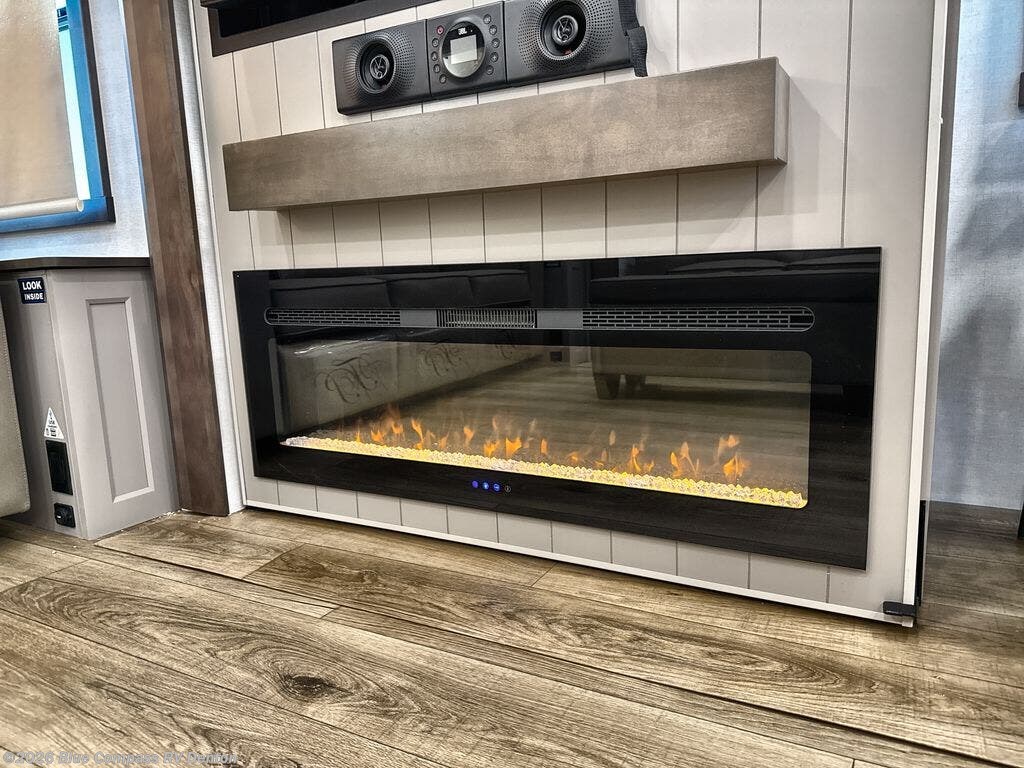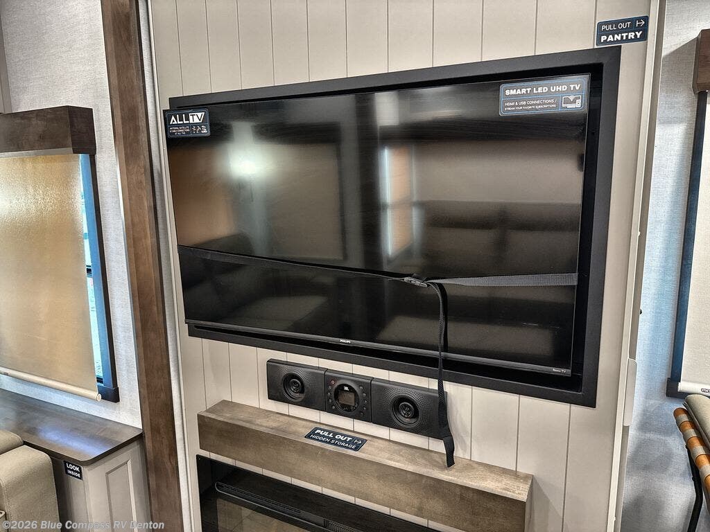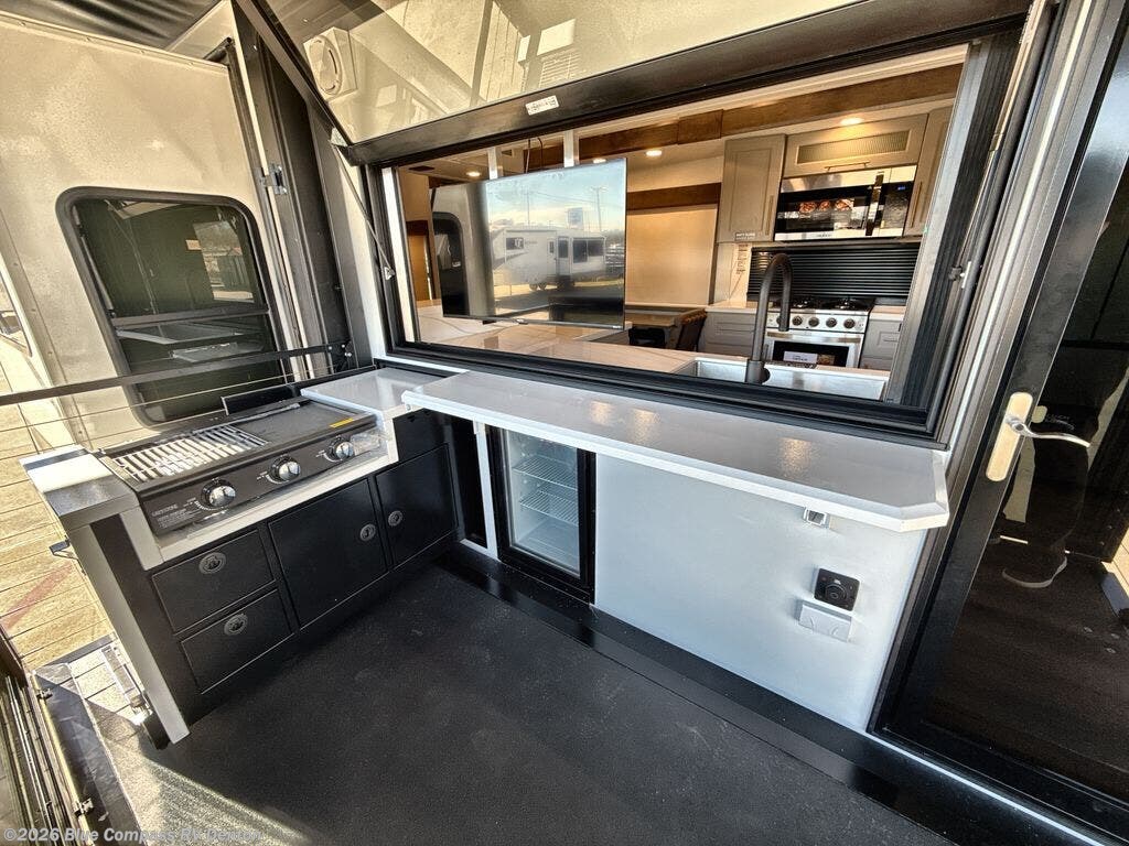 You will fall in love with this unit’s slide patio with picture window, the perfect spot to take in the breathtaking views. Enjoy outdoor cooking with the countertop prep area and pull-out grill, while the drop-down TV provides entertainment for all. Inside, rear living area features two sleeper sofas, perfect for lounging and relaxing. Overhead cabinets provide ample storage, while the 50” class smart TV offers endless entertainment options. Gather around the turn table dinette for meals or socializing. The kitchen is fully equipped with a microwave, sink, refrigerator, pantry, and hutch, making meal preparation and storage a breeze. Also this unit has a full bathroom and a cozy front bedroom which boast a king bed, ample closet, a TV, and so much more!
