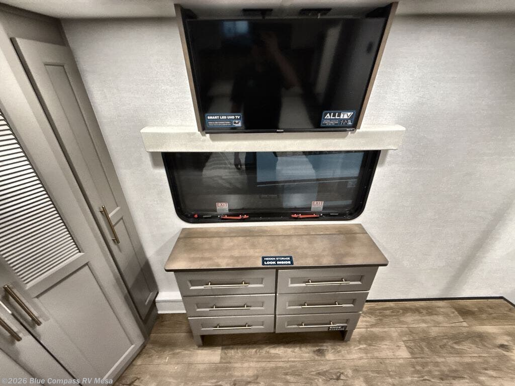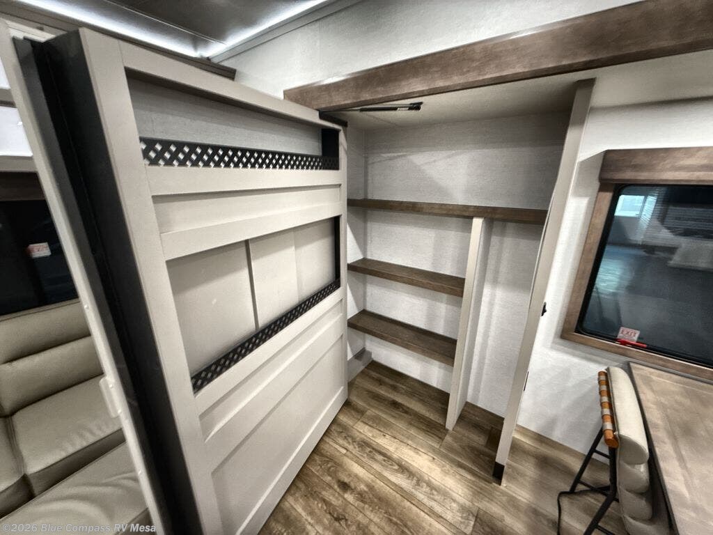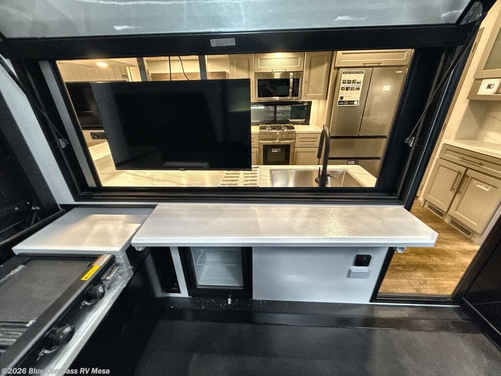 You will fall in love with this unit’s slide patio with picture window, the perfect spot to take in the breathtaking views. Enjoy outdoor cooking with the countertop prep area and pull-out grill, while the drop-down TV provides entertainment for all. Inside, rear living area features two sleeper sofas, perfect for lounging and relaxing. Overhead cabinets provide ample storage, while the 50” class smart TV offers endless entertainment options. Gather around the turn table dinette for meals or socializing. The kitchen is fully equipped with a microwave, sink, refrigerator, pantry, and hutch, making meal preparation and storage a breeze. Also this unit has a full bathroom and a cozy front bedroom which boast a king bed, ample closet, a TV, and so much more!