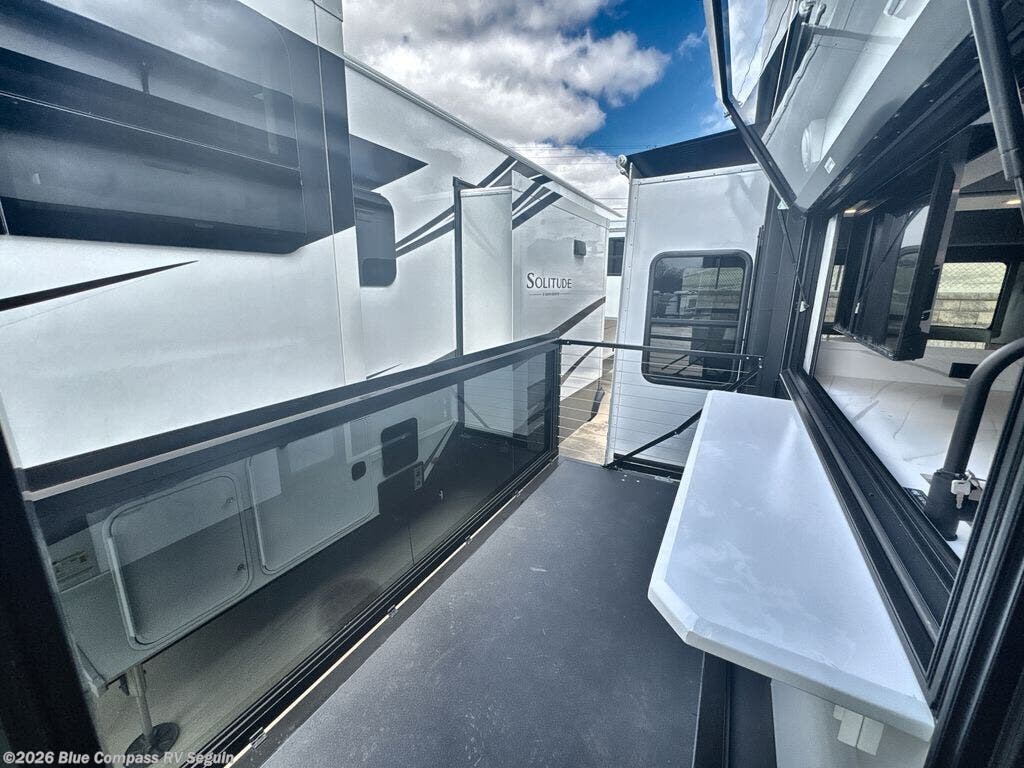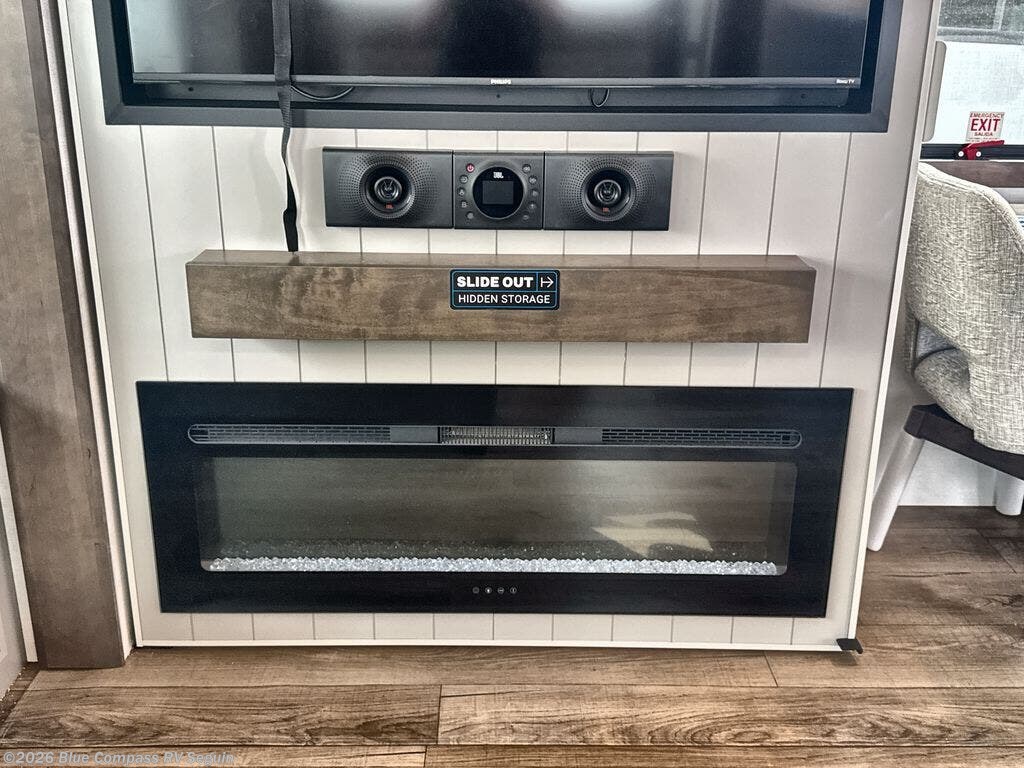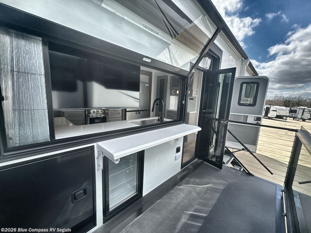 You will fall in love with this unit’s slide patio with picture window, the perfect spot to take in the breathtaking views. Enjoy outdoor cooking with the countertop prep area and pull-out grill, while the drop-down TV provides entertainment for all. Inside, rear living area features two sleeper sofas, perfect for lounging and relaxing. Overhead cabinets provide ample storage, while the 50” class smart TV offers endless entertainment options. Gather around the turn table dinette for meals or socializing. The kitchen is fully equipped with a microwave, sink, refrigerator, pantry, and hutch, making meal preparation and storage a breeze. Also this unit has a full bathroom and a cozy front bedroom which boast a king bed, ample closet, a TV, and so much more!
