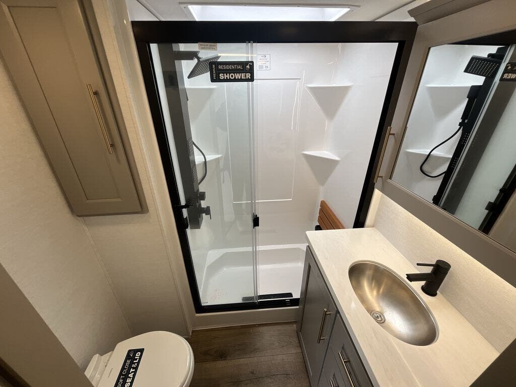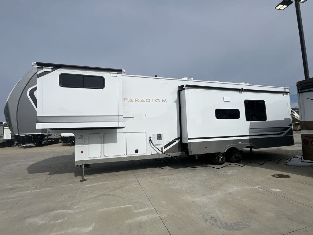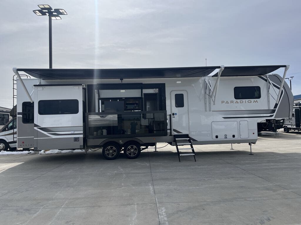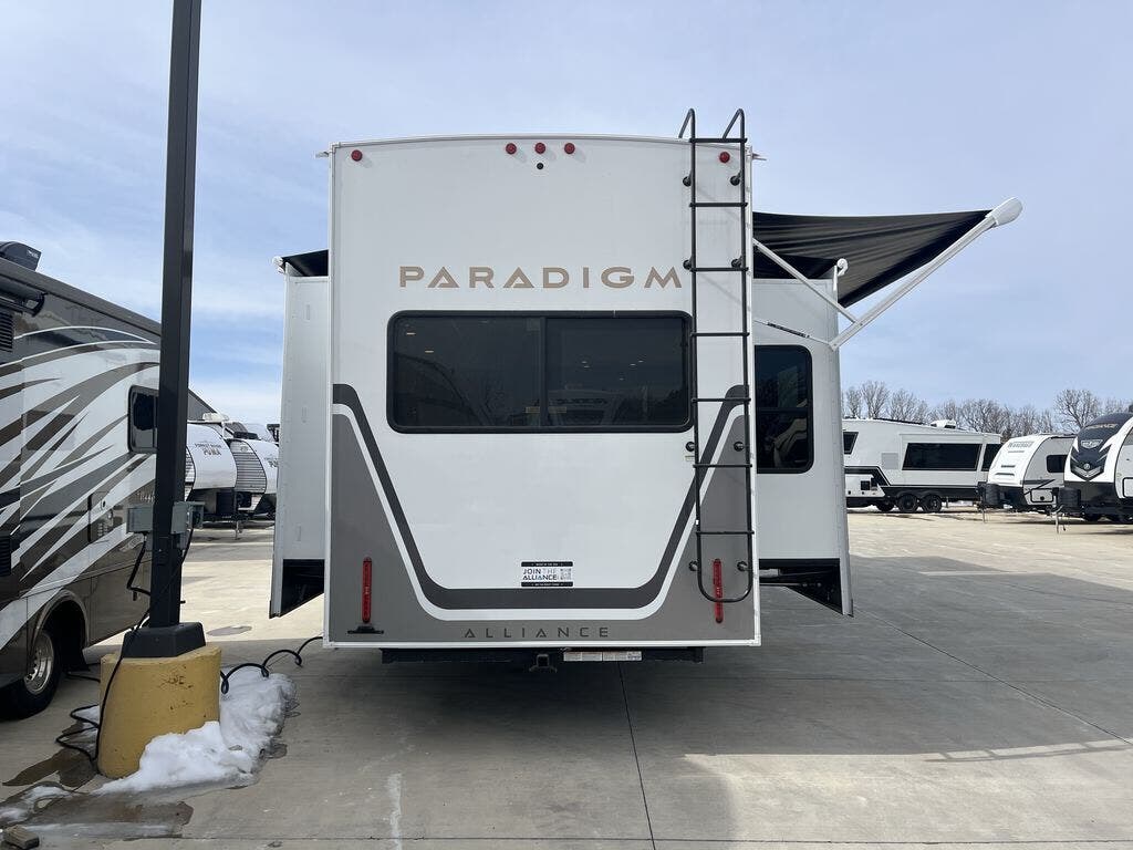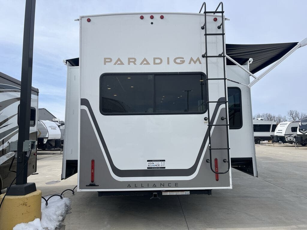 The Paradigm fifth wheels by Alliance RV are functional, high-quality, and luxurious for an unforgettable camping experience. There are three A/C units and a 40K BTU furnace to keep you comfortable year around, and you'll appreciate additional convenient amenities, like the all-in-one enclosed/heated utility center and the color coded and numbered wiring. A Helux Series coil spring pin box comes standard for hassle-free towing, along with Curt 8,000 lb. axles. You'll love the kitchen with its LG solid surface countertops and Lusso range, plus there is LED motion lighting in the pantry and a Maxx fan with a rain sensor to keep everything fresh when making dinner. Each model also includes an HD Smart TV in the living room and bedroom. And of course there are a variety of options you can choose from to further customize your fifth wheel; dual pane windows, Super Solar Plus, slide out awning toppers, and generator prep or a generator to name a few!