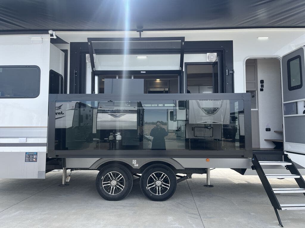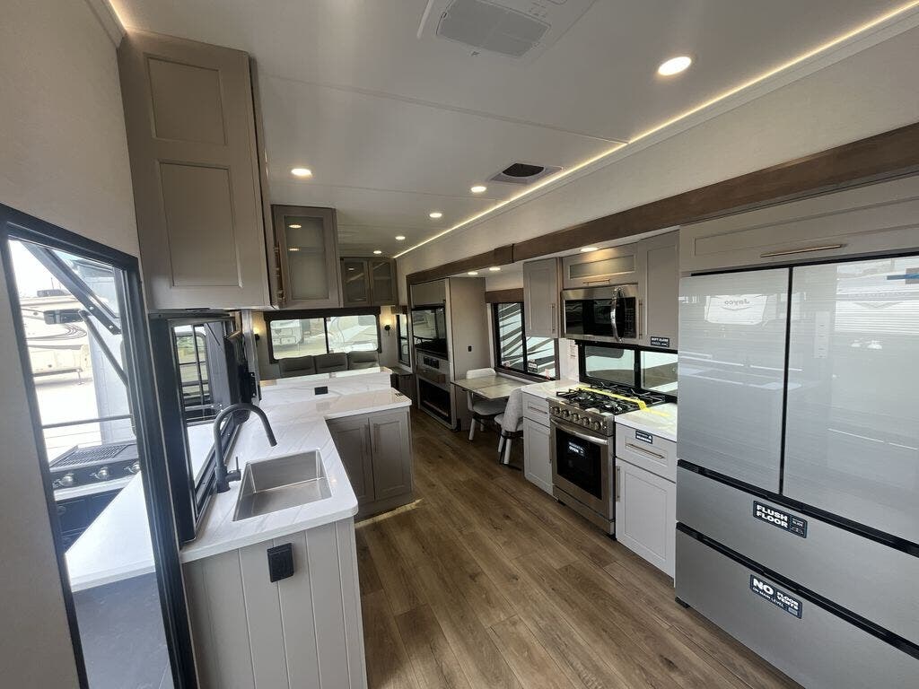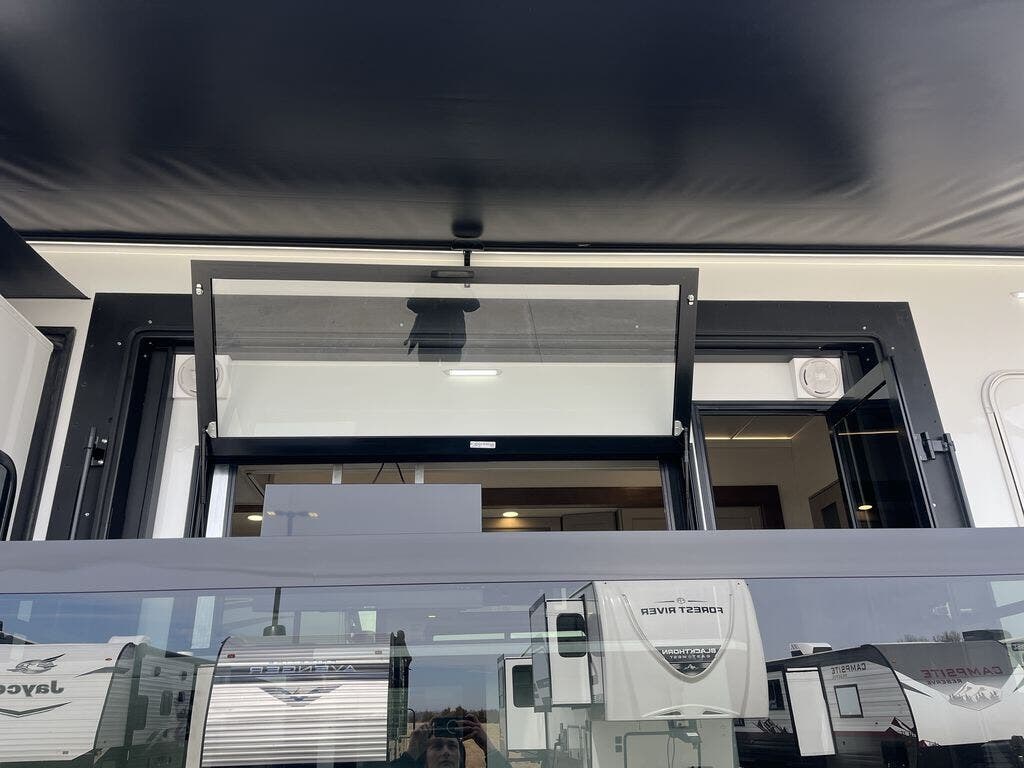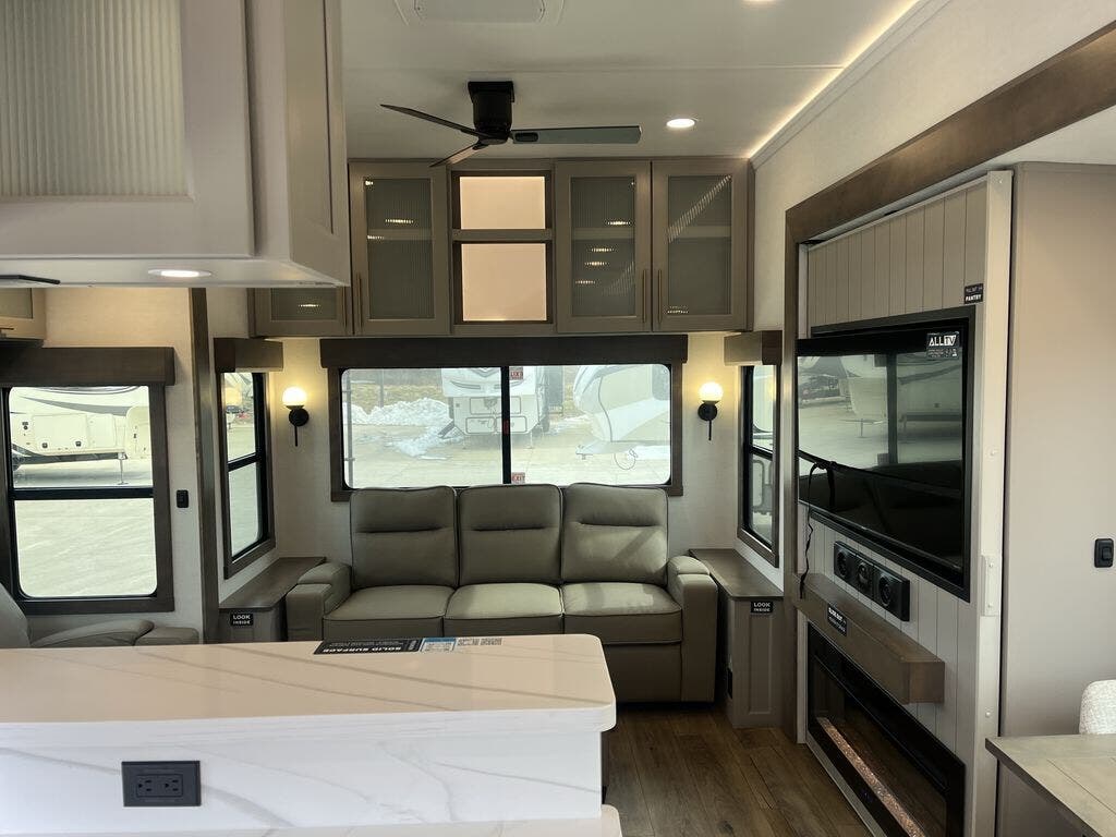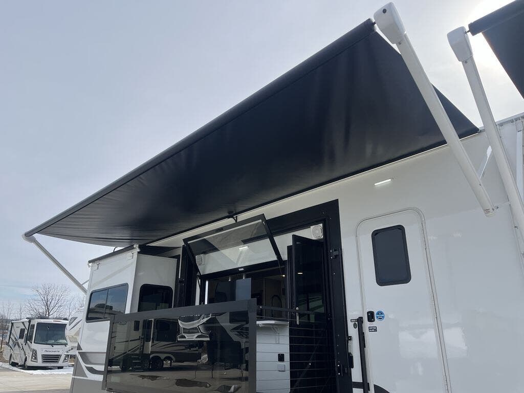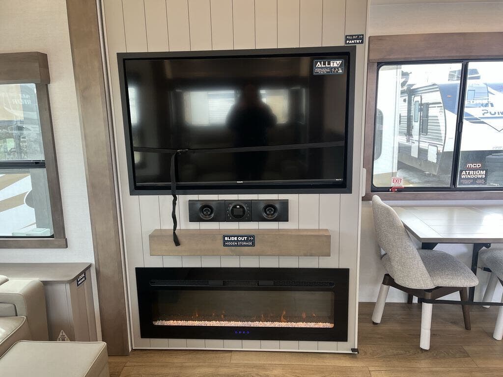 You will fall in love with this unit’s slide patio with picture window, the perfect spot to take in the breathtaking views. Enjoy outdoor cooking with the countertop prep area and pull-out grill, while the drop-down TV provides entertainment for all. Inside, rear living area features two sleeper sofas, perfect for lounging and relaxing. Overhead cabinets provide ample storage, while the 50” class smart TV offers endless entertainment options. Gather around the turn table dinette for meals or socializing. The kitchen is fully equipped with a microwave, sink, refrigerator, pantry, and hutch, making meal preparation and storage a breeze. Also this unit has a full bathroom and a cozy front bedroom which boast a king bed, ample closet, a TV, and so much more!