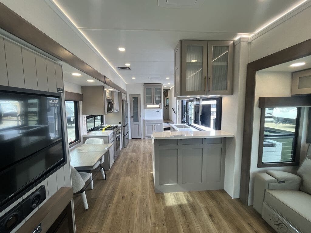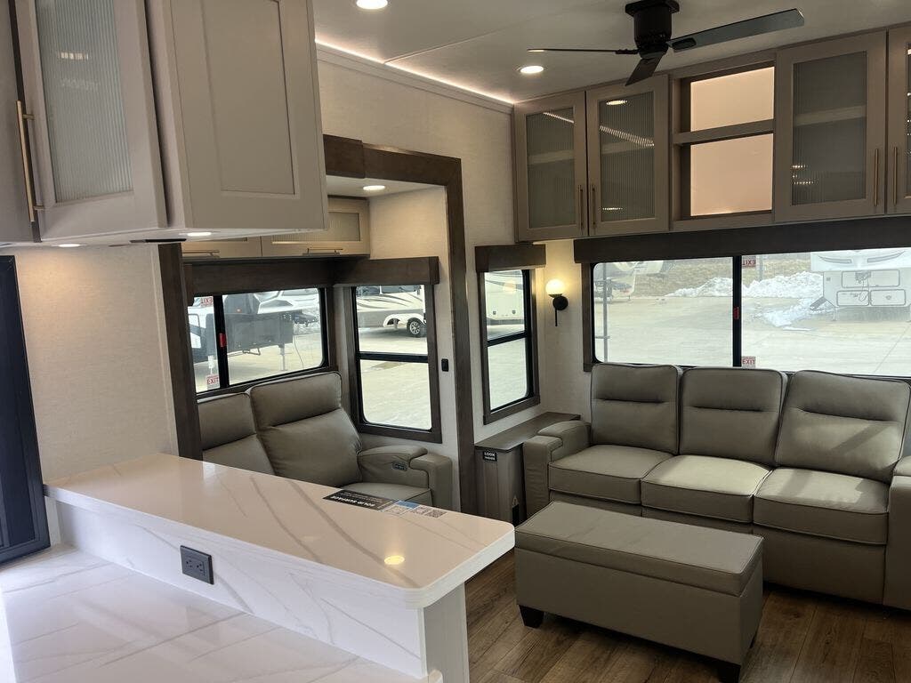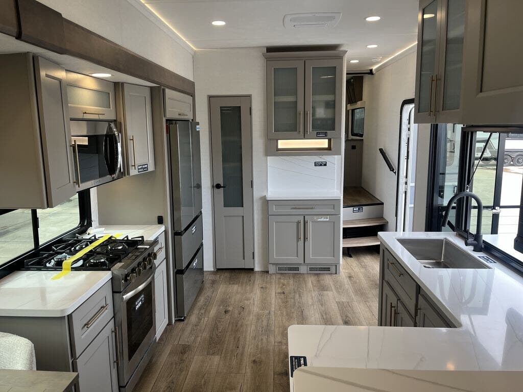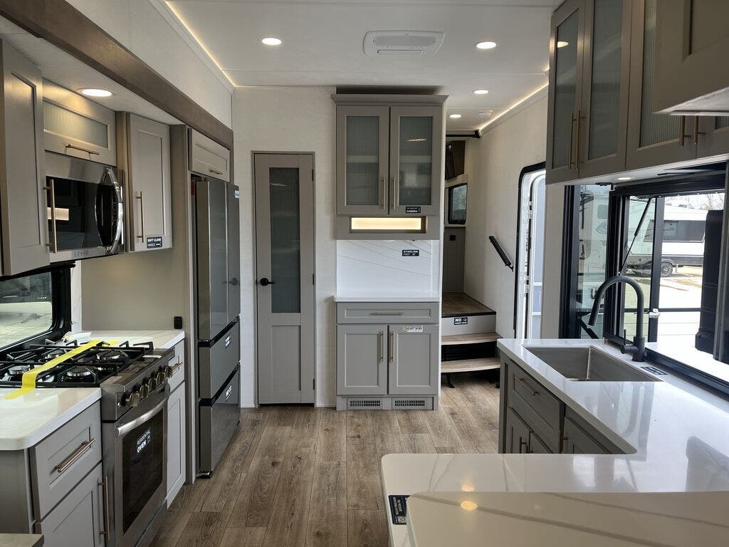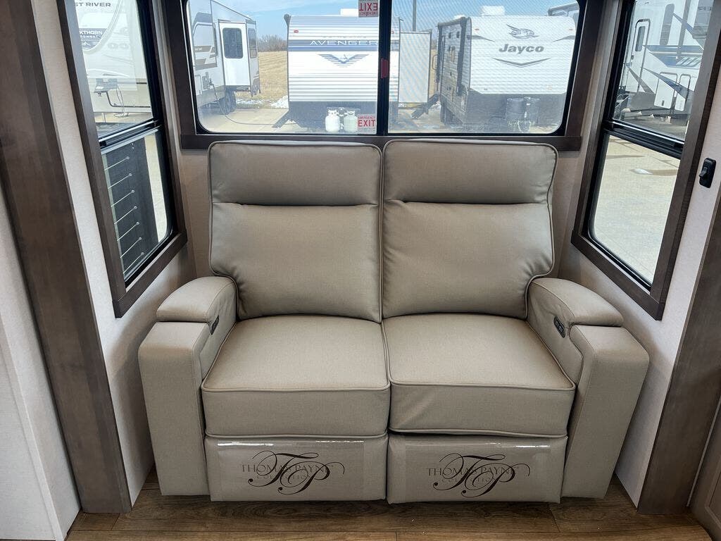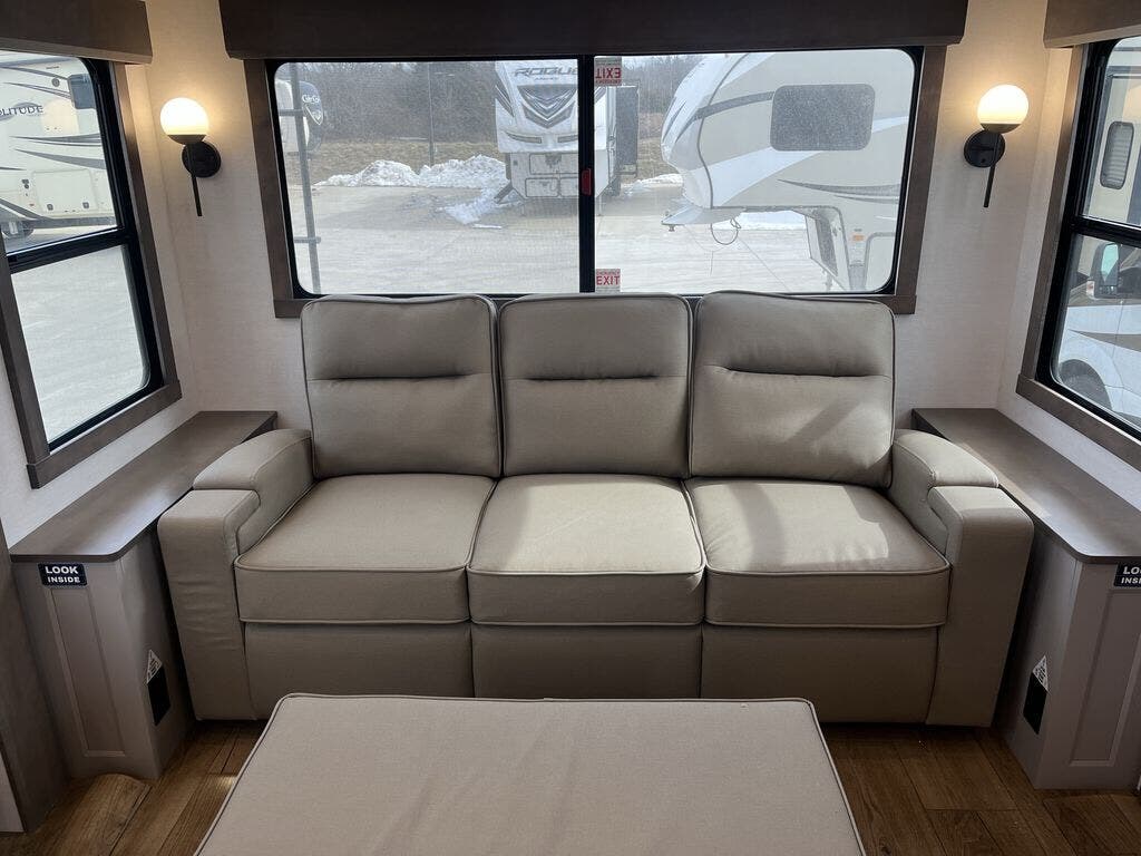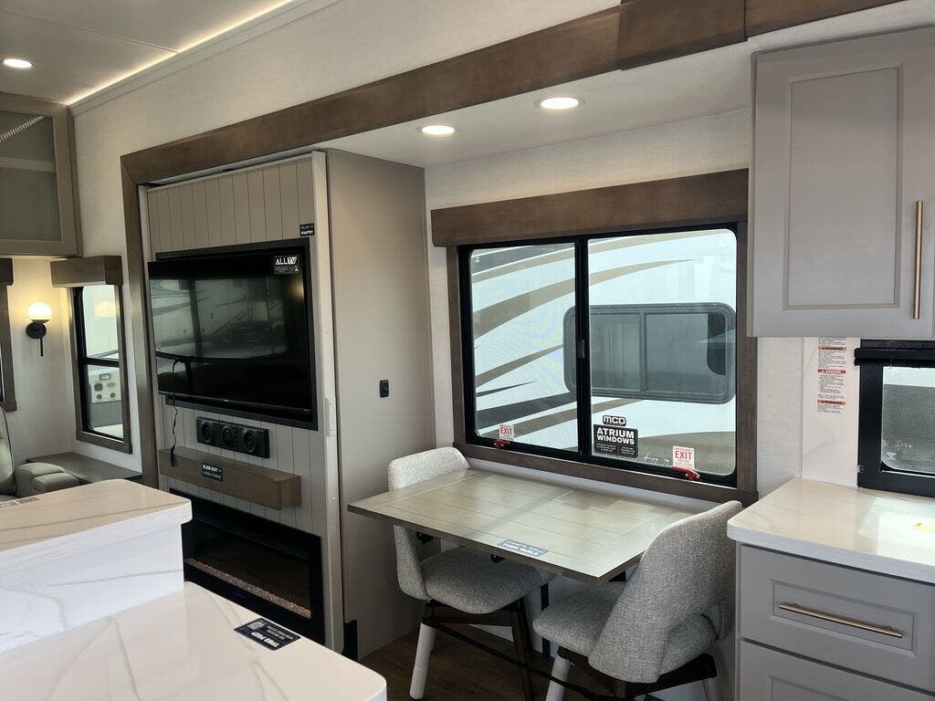 You will fall in love with this unit’s slide patio with picture window, the perfect spot to take in the breathtaking views. Enjoy outdoor cooking with the countertop prep area and pull-out grill, while the drop-down TV provides entertainment for all. Inside, rear living area features two sleeper sofas, perfect for lounging and relaxing. Overhead cabinets provide ample storage, while the 50” class smart TV offers endless entertainment options. Gather around the turn table dinette for meals or socializing. The kitchen is fully equipped with a microwave, sink, refrigerator, pantry, and hutch, making meal preparation and storage a breeze. Also this unit has a full bathroom and a cozy front bedroom which boast a king bed, ample closet, a TV, and so much more!