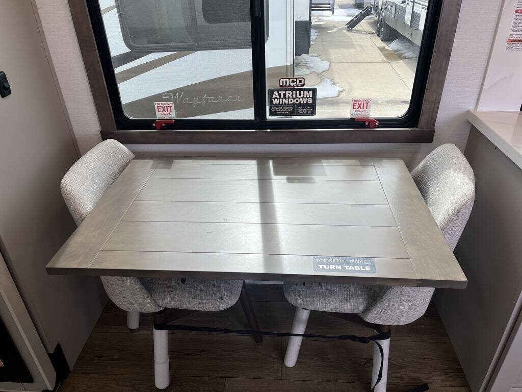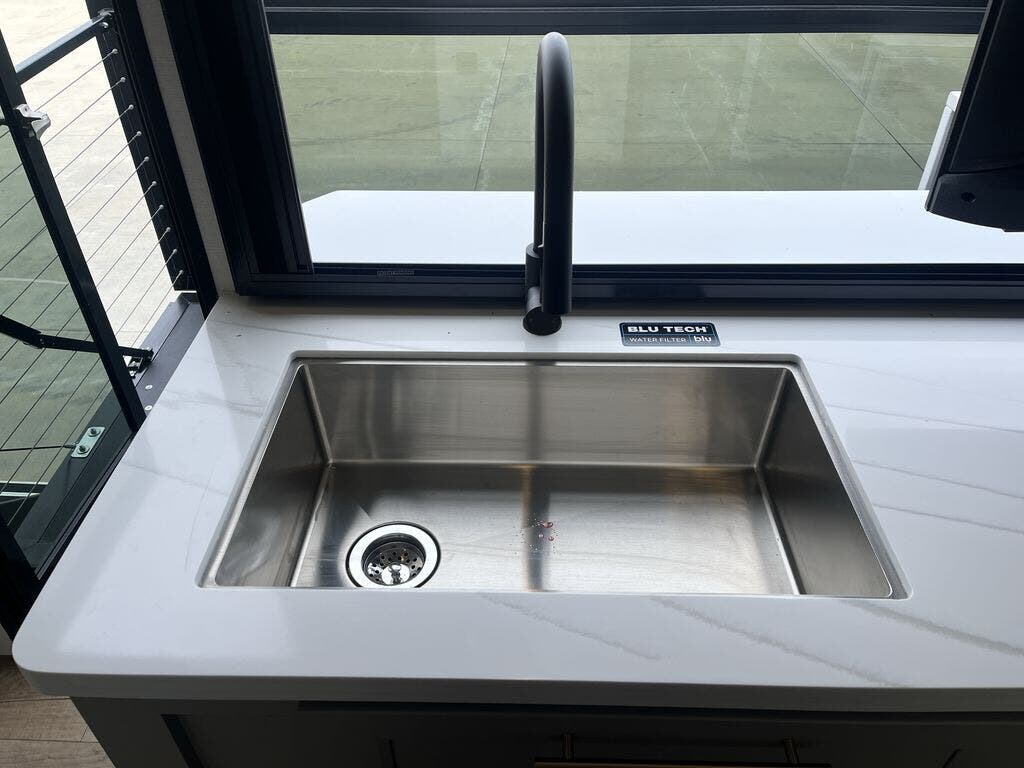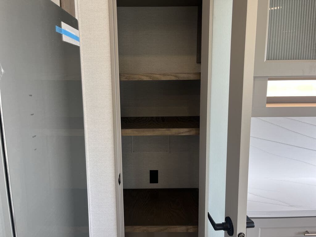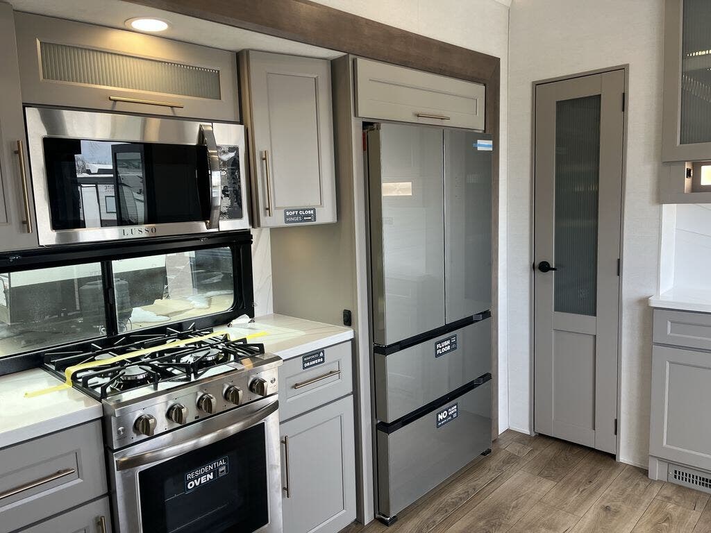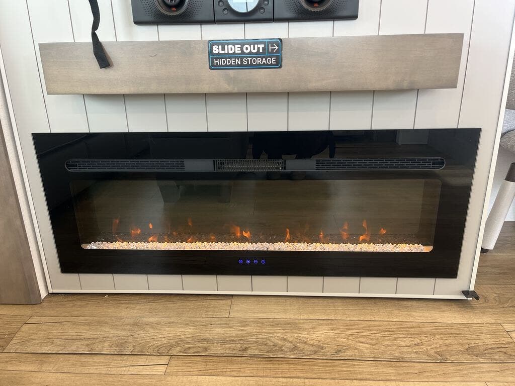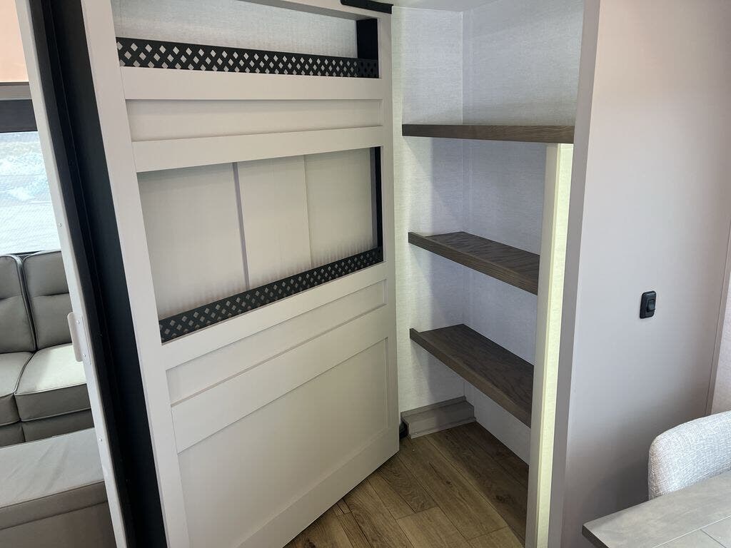 You will fall in love with this unit’s slide patio with picture window, the perfect spot to take in the breathtaking views. Enjoy outdoor cooking with the countertop prep area and pull-out grill, while the drop-down TV provides entertainment for all. Inside, rear living area features two sleeper sofas, perfect for lounging and relaxing. Overhead cabinets provide ample storage, while the 50” class smart TV offers endless entertainment options. Gather around the turn table dinette for meals or socializing. The kitchen is fully equipped with a microwave, sink, refrigerator, pantry, and hutch, making meal preparation and storage a breeze. Also this unit has a full bathroom and a cozy front bedroom which boast a king bed, ample closet, a TV, and so much more!