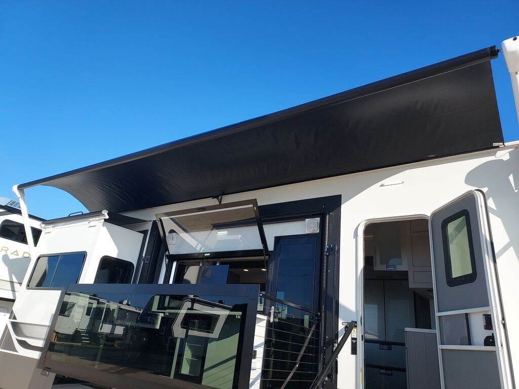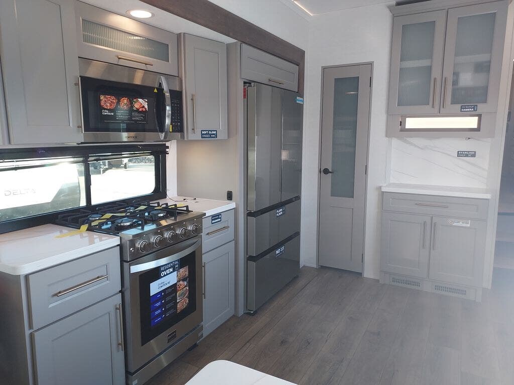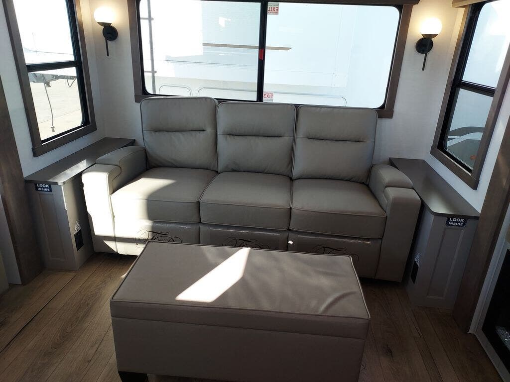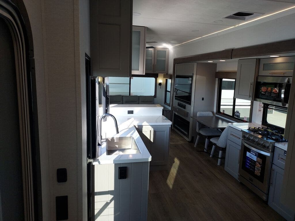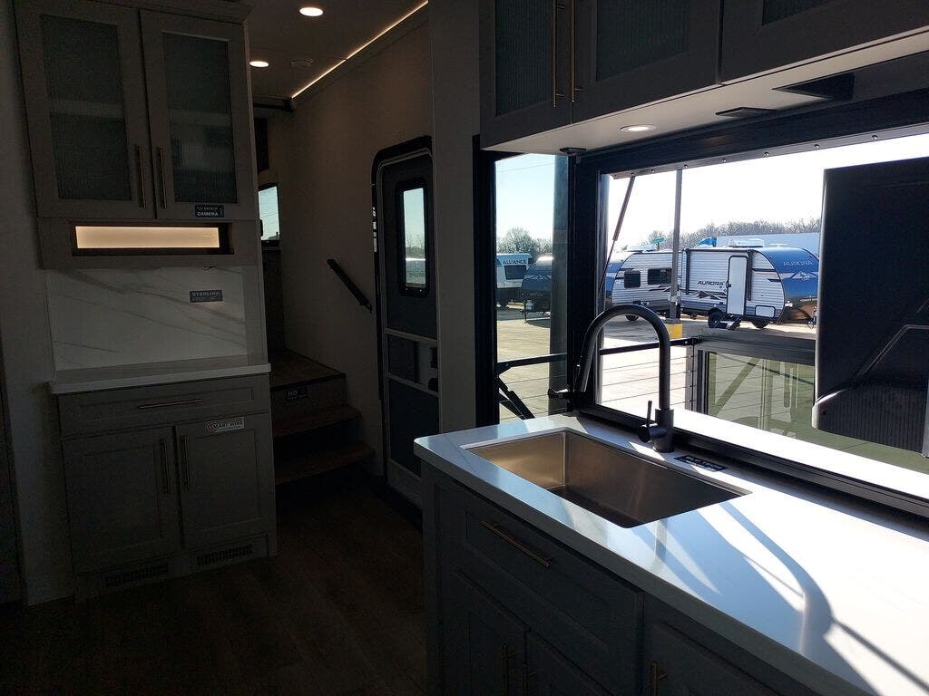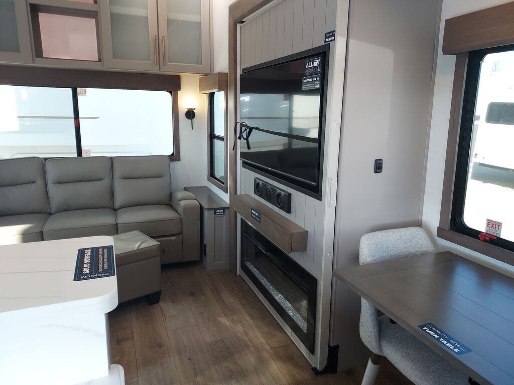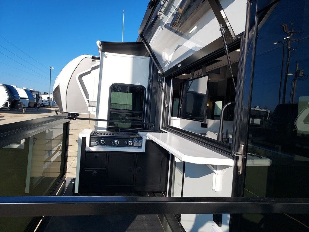 You will fall in love with this unit’s slide patio with picture window, the perfect spot to take in the breathtaking views. Enjoy outdoor cooking with the countertop prep area and pull-out grill, while the drop-down TV provides entertainment for all. Inside, rear living area features two sleeper sofas, perfect for lounging and relaxing. Overhead cabinets provide ample storage, while the 50” class smart TV offers endless entertainment options. Gather around the turn table dinette for meals or socializing. The kitchen is fully equipped with a microwave, sink, refrigerator, pantry, and hutch, making meal preparation and storage a breeze. Also this unit has a full bathroom and a cozy front bedroom which boast a king bed, ample closet, a TV, and so much more!