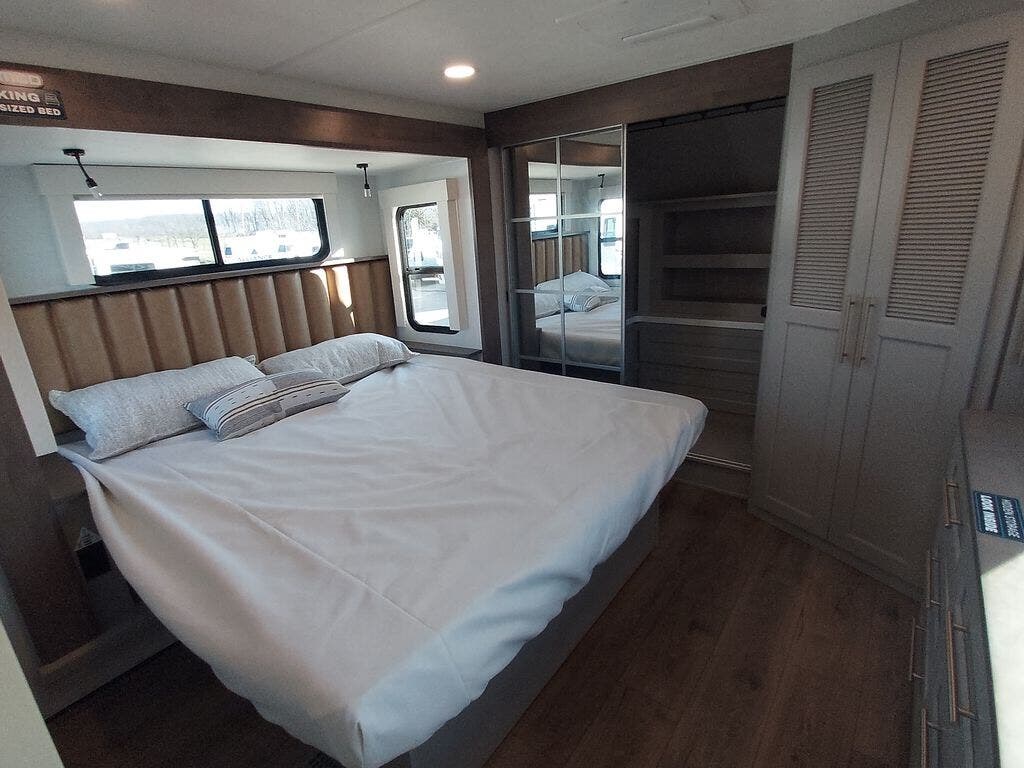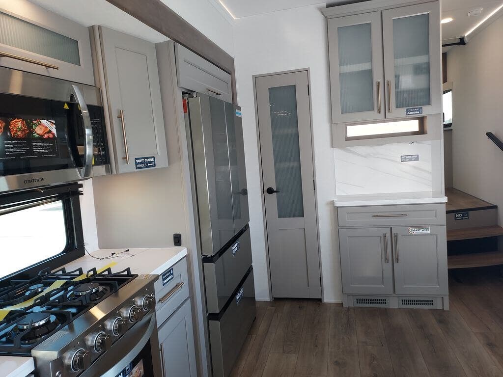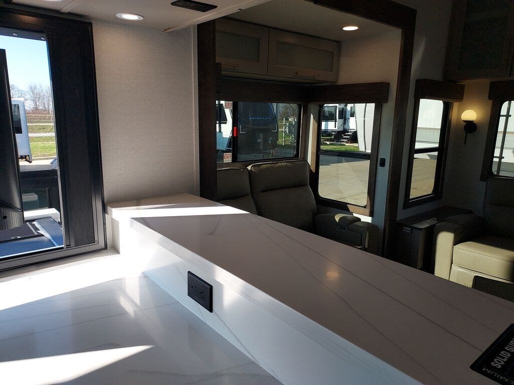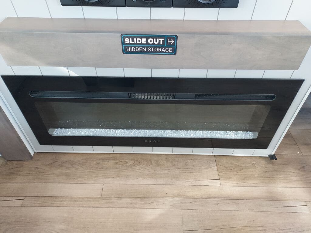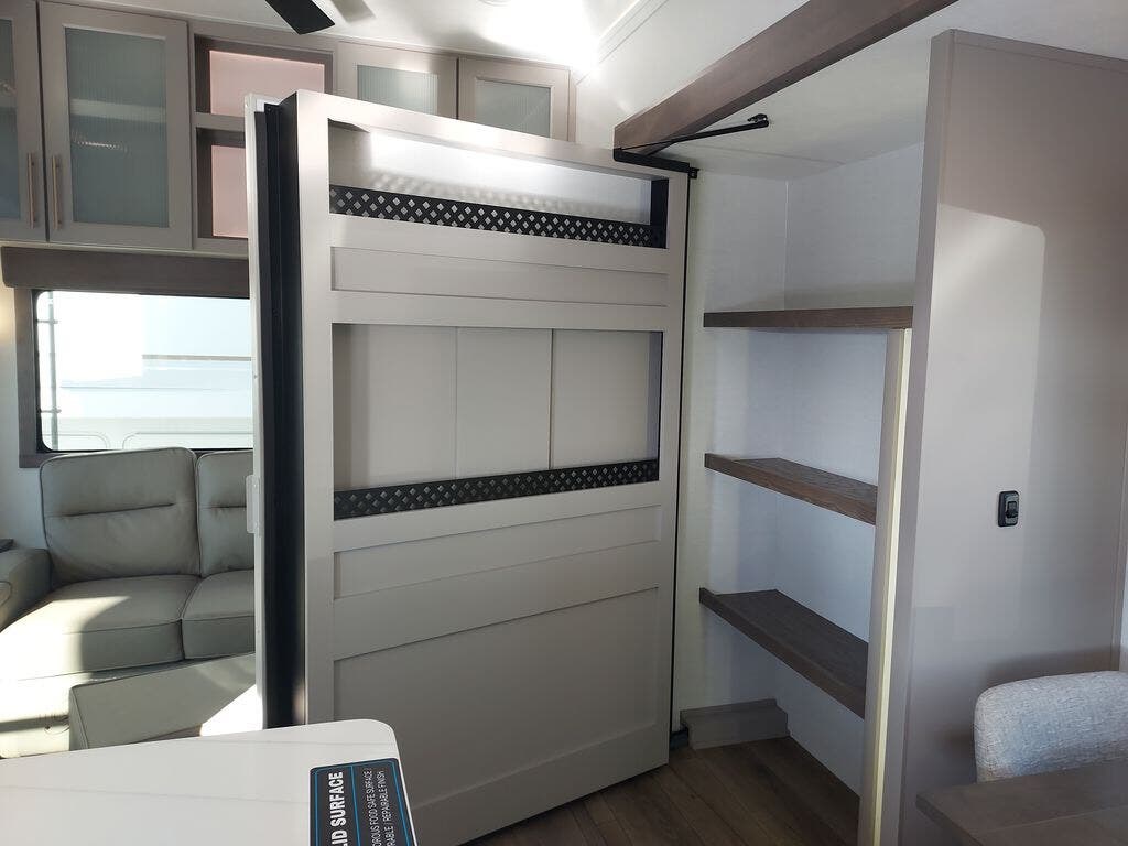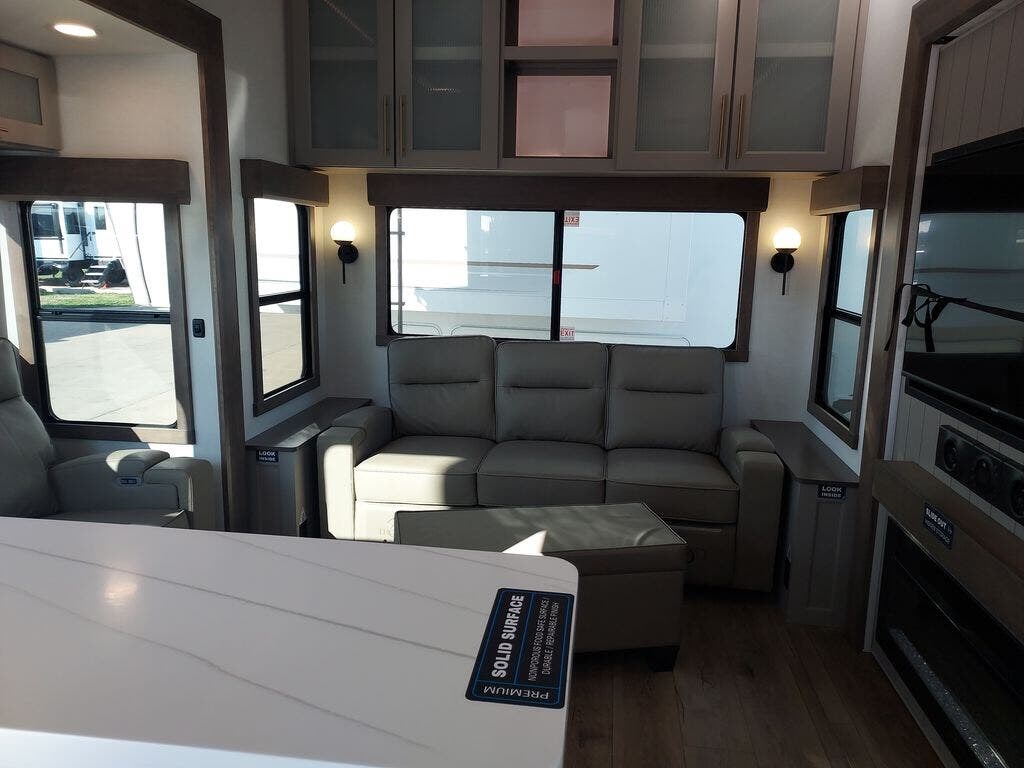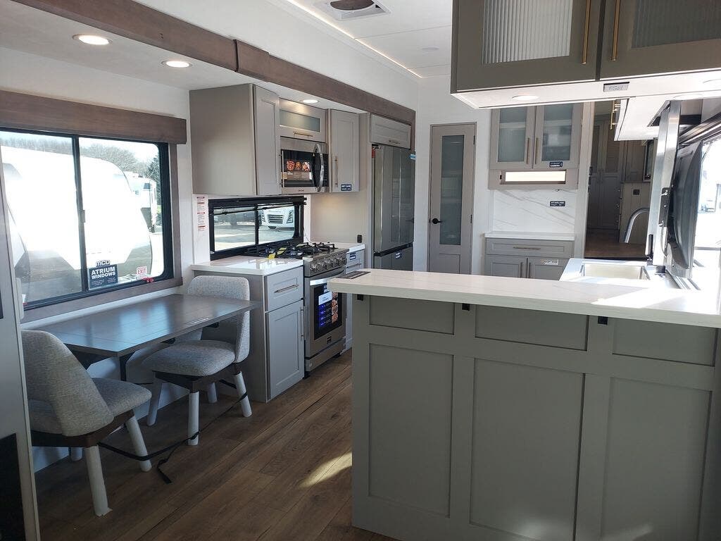 You will fall in love with this unit’s slide patio with picture window, the perfect spot to take in the breathtaking views. Enjoy outdoor cooking with the countertop prep area and pull-out grill, while the drop-down TV provides entertainment for all. Inside, rear living area features two sleeper sofas, perfect for lounging and relaxing. Overhead cabinets provide ample storage, while the 50” class smart TV offers endless entertainment options. Gather around the turn table dinette for meals or socializing. The kitchen is fully equipped with a microwave, sink, refrigerator, pantry, and hutch, making meal preparation and storage a breeze. Also this unit has a full bathroom and a cozy front bedroom which boast a king bed, ample closet, a TV, and so much more!