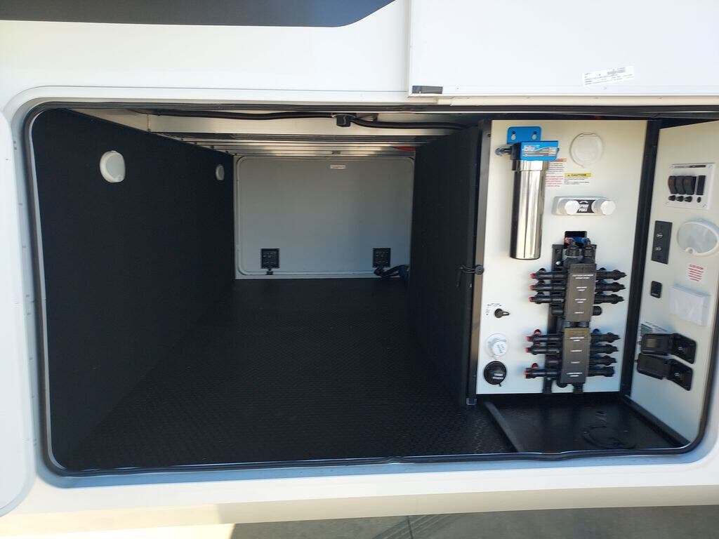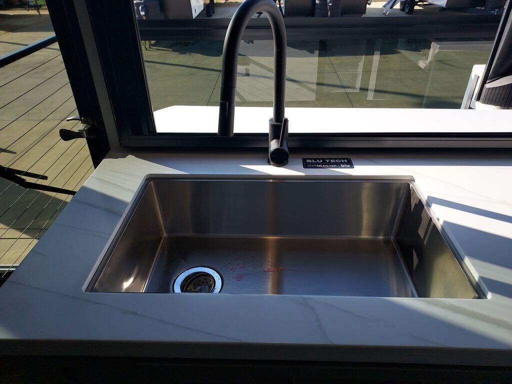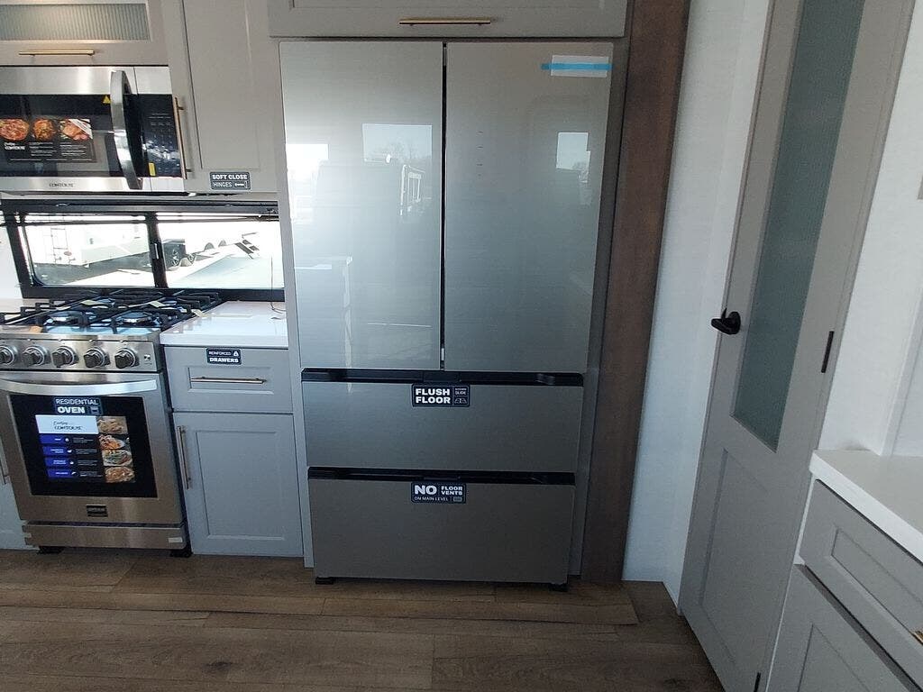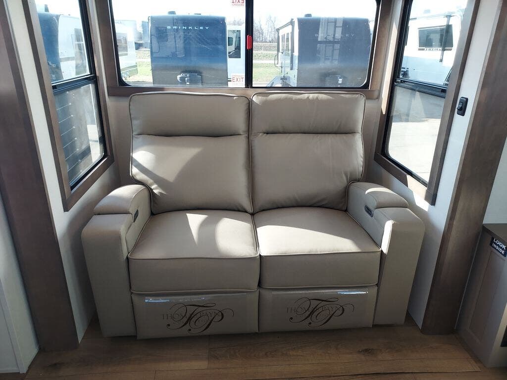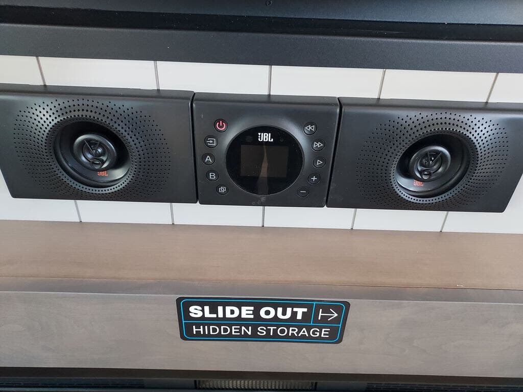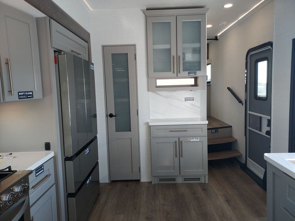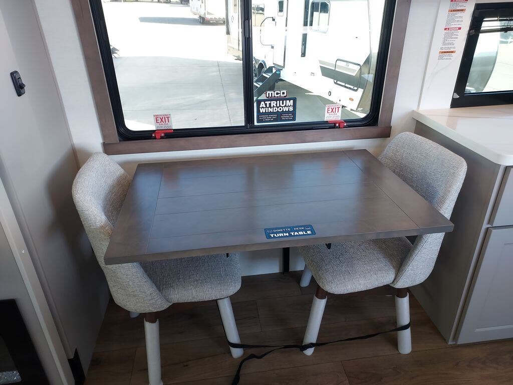 You will fall in love with this unit’s slide patio with picture window, the perfect spot to take in the breathtaking views. Enjoy outdoor cooking with the countertop prep area and pull-out grill, while the drop-down TV provides entertainment for all. Inside, rear living area features two sleeper sofas, perfect for lounging and relaxing. Overhead cabinets provide ample storage, while the 50” class smart TV offers endless entertainment options. Gather around the turn table dinette for meals or socializing. The kitchen is fully equipped with a microwave, sink, refrigerator, pantry, and hutch, making meal preparation and storage a breeze. Also this unit has a full bathroom and a cozy front bedroom which boast a king bed, ample closet, a TV, and so much more!