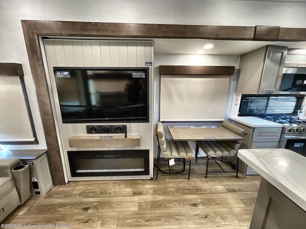 You will fall in love with this unit’s slide patio with picture window, the perfect spot to take in the breathtaking views. Enjoy outdoor cooking with the countertop prep area and pull-out grill, while the drop-down TV provides entertainment for all. Inside, rear living area features two sleeper sofas, perfect for lounging and relaxing. Overhead cabinets provide ample storage, while the 50” class smart TV offers endless entertainment options. Gather around the turn table dinette for meals or socializing. The kitchen is fully equipped with a microwave, sink, refrigerator, pantry, and hutch, making meal preparation and storage a breeze. Also this unit has a full bathroom and a cozy front bedroom which boast a king bed, ample closet, a TV, and so much more!