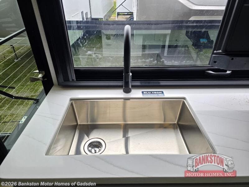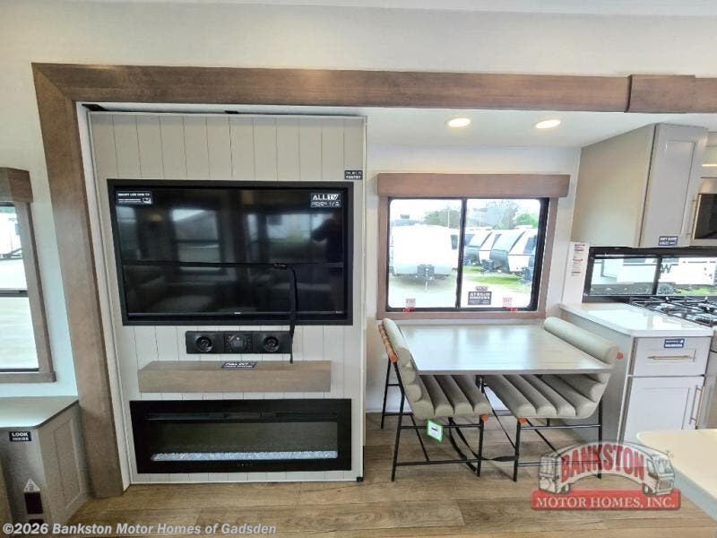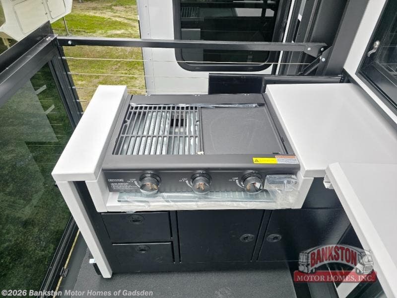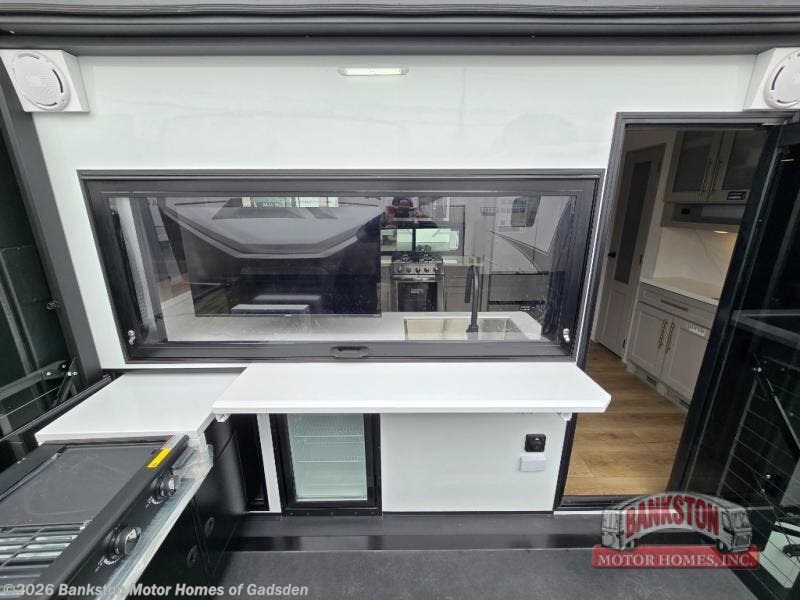 You will fall in love with this unit’s slide patio with picture window, the perfect spot to take in the breathtaking views. Enjoy outdoor cooking with the countertop prep area and pull-out grill, while the drop-down TV provides entertainment for all. Inside, rear living area features two sleeper sofas, perfect for lounging and relaxing. Overhead cabinets provide ample storage, while the 50” class smart TV offers endless entertainment options. Gather around the turn table dinette for meals or socializing. The kitchen is fully equipped with a microwave, sink, refrigerator, pantry, and hutch, making meal preparation and storage a breeze. Also this unit has a full bathroom and a cozy front bedroom which boast a king bed, ample closet, a TV, and so much more!