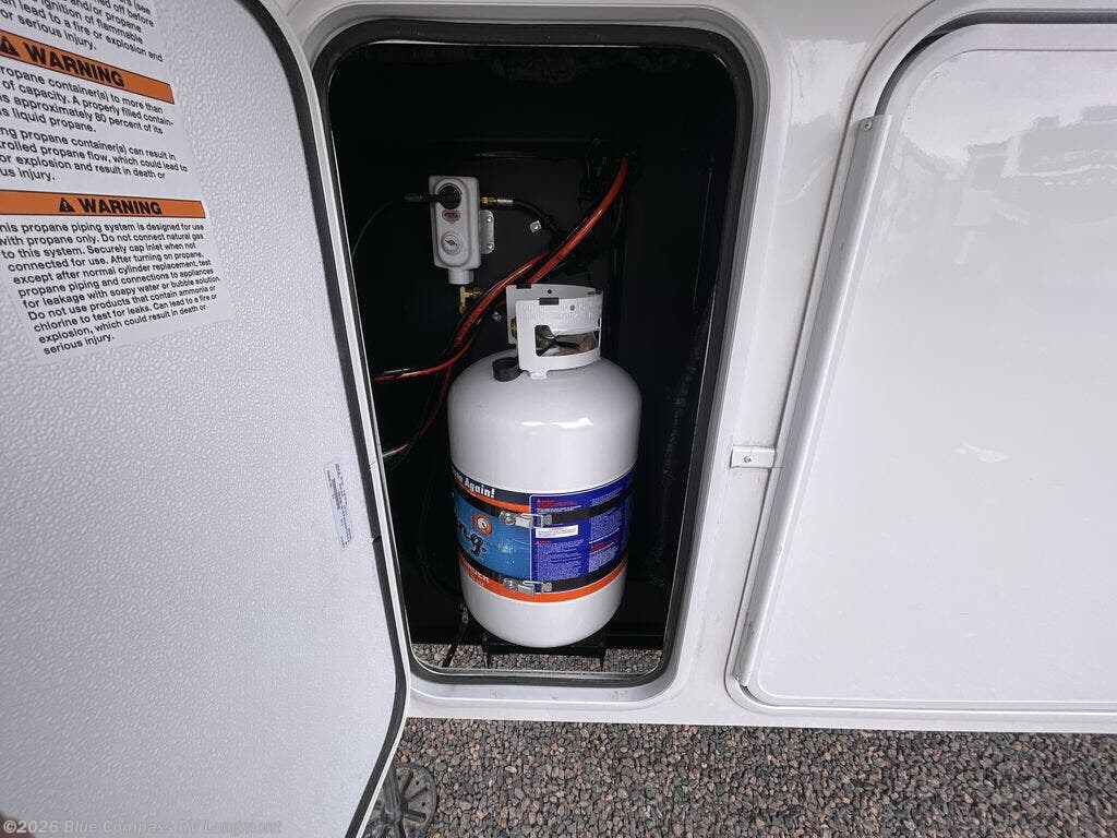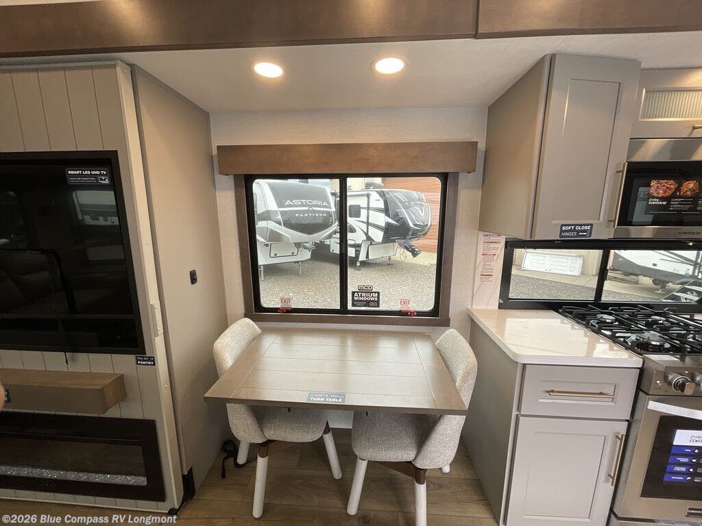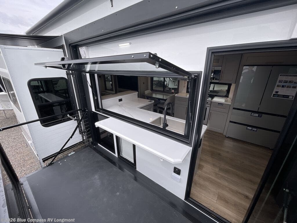 You will fall in love with this unit’s slide patio with picture window, the perfect spot to take in the breathtaking views. Enjoy outdoor cooking with the countertop prep area and pull-out grill, while the drop-down TV provides entertainment for all. Inside, rear living area features two sleeper sofas, perfect for lounging and relaxing. Overhead cabinets provide ample storage, while the 50” class smart TV offers endless entertainment options. Gather around the turn table dinette for meals or socializing. The kitchen is fully equipped with a microwave, sink, refrigerator, pantry, and hutch, making meal preparation and storage a breeze. Also this unit has a full bathroom and a cozy front bedroom which boast a king bed, ample closet, a TV, and so much more!