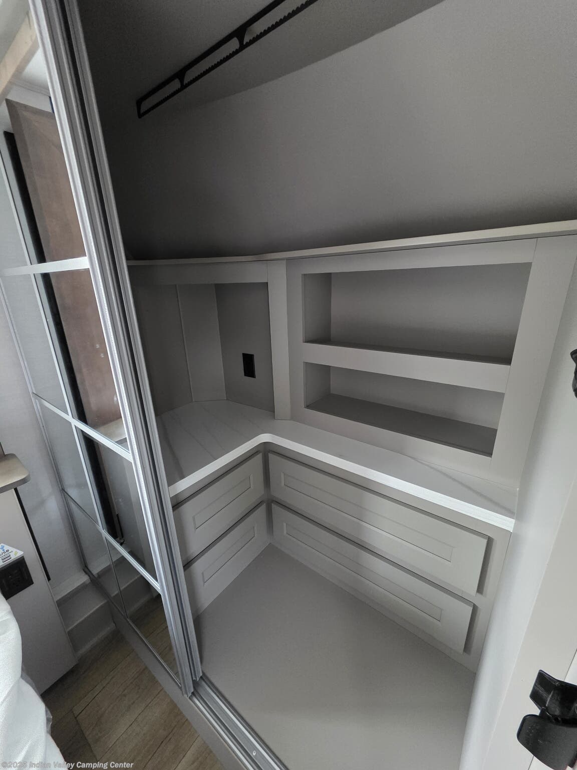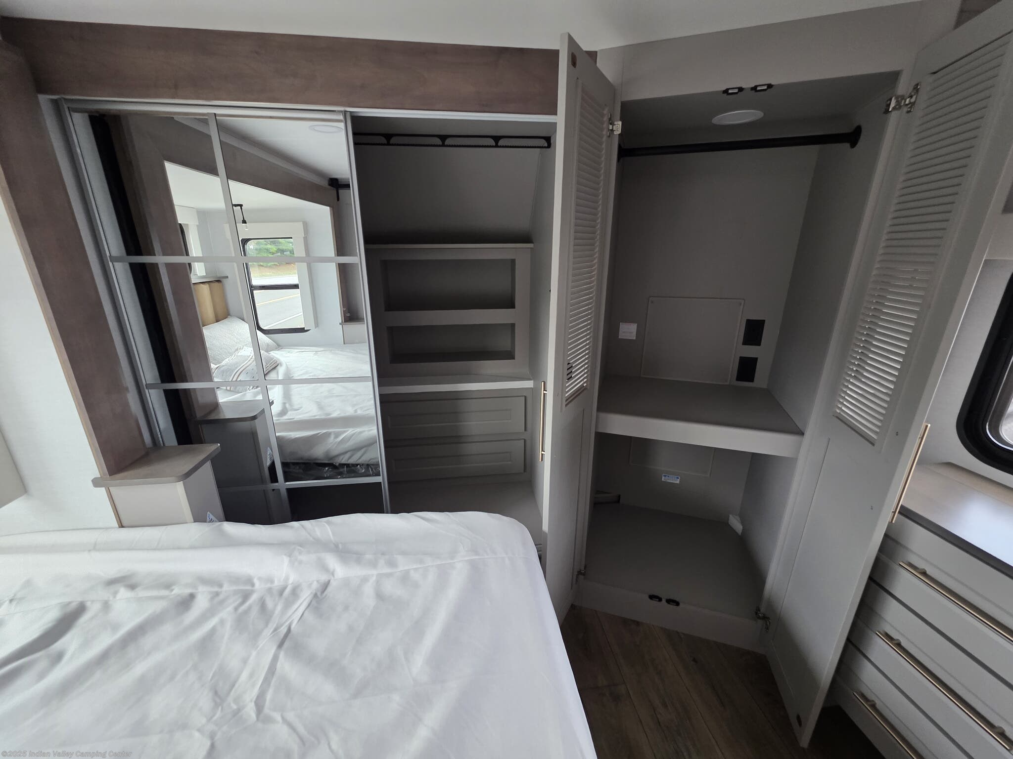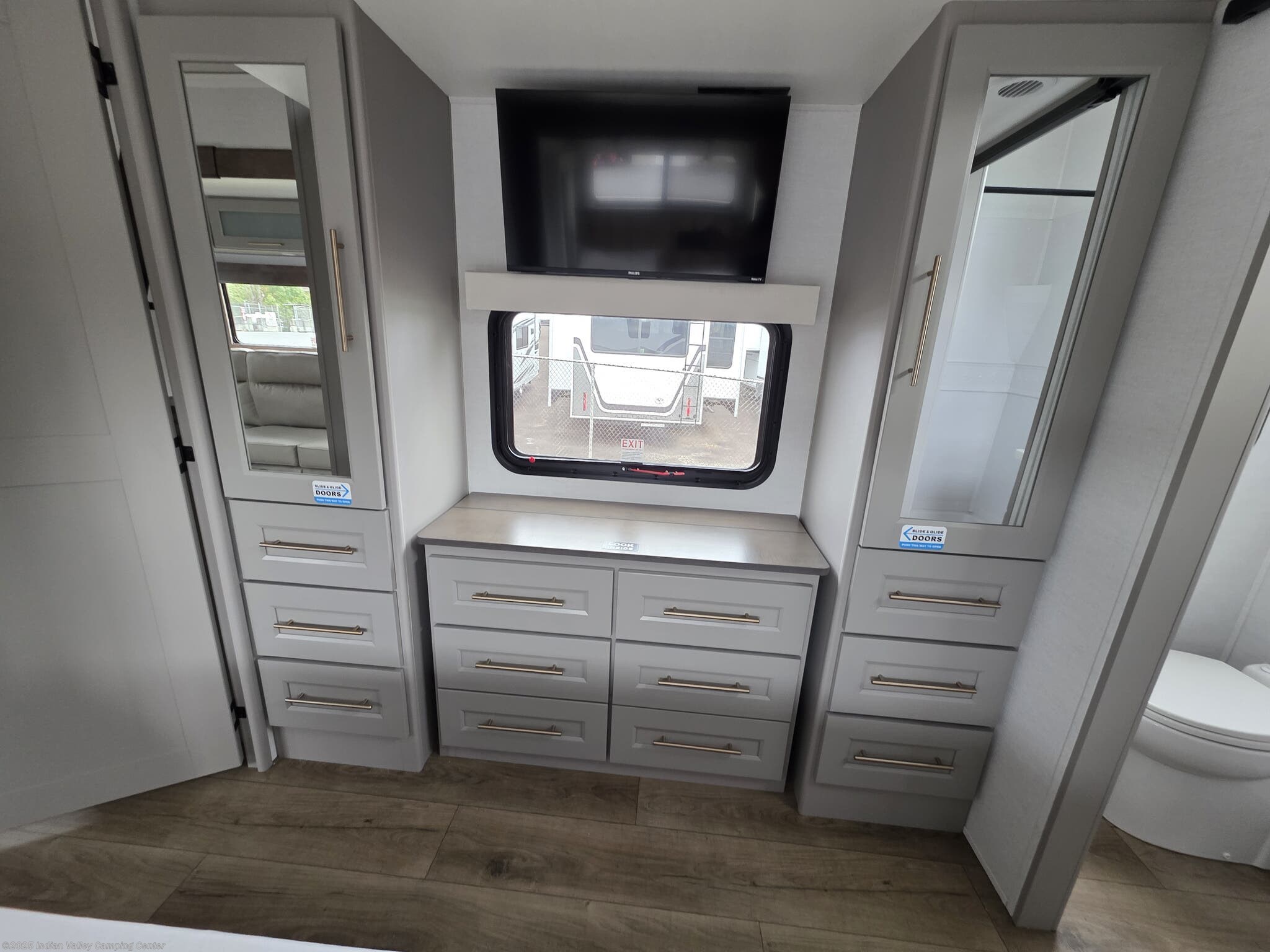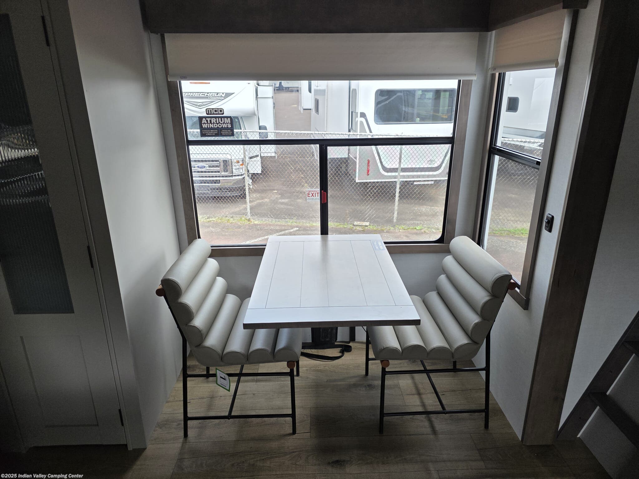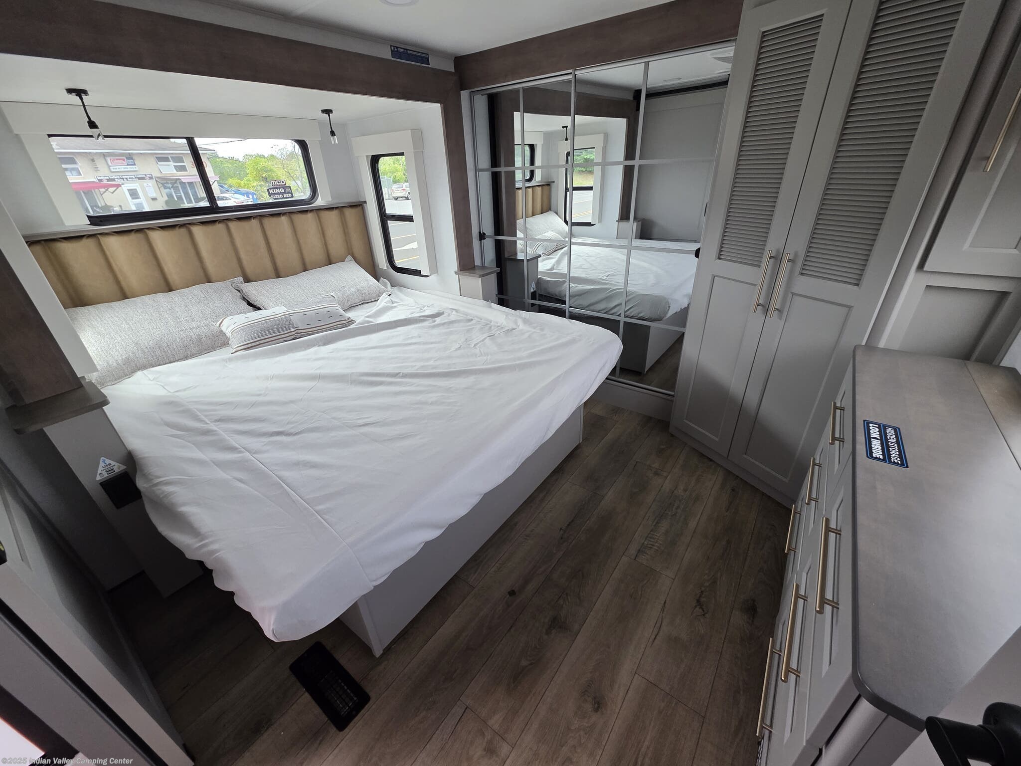The Paradigm 395DS features a generous four slideouts, creating expansive interior footprints and open sightlines across the living and dining areas. With a stand-alone dinette, premium seating, and a dedicated sleeping suite, this model blends residential feel with campground practicality. The floorplan is designed to maximize storage, wardrobe space, and multi-use living zones—ideal for long trips, full timers, or seasonal getaways.