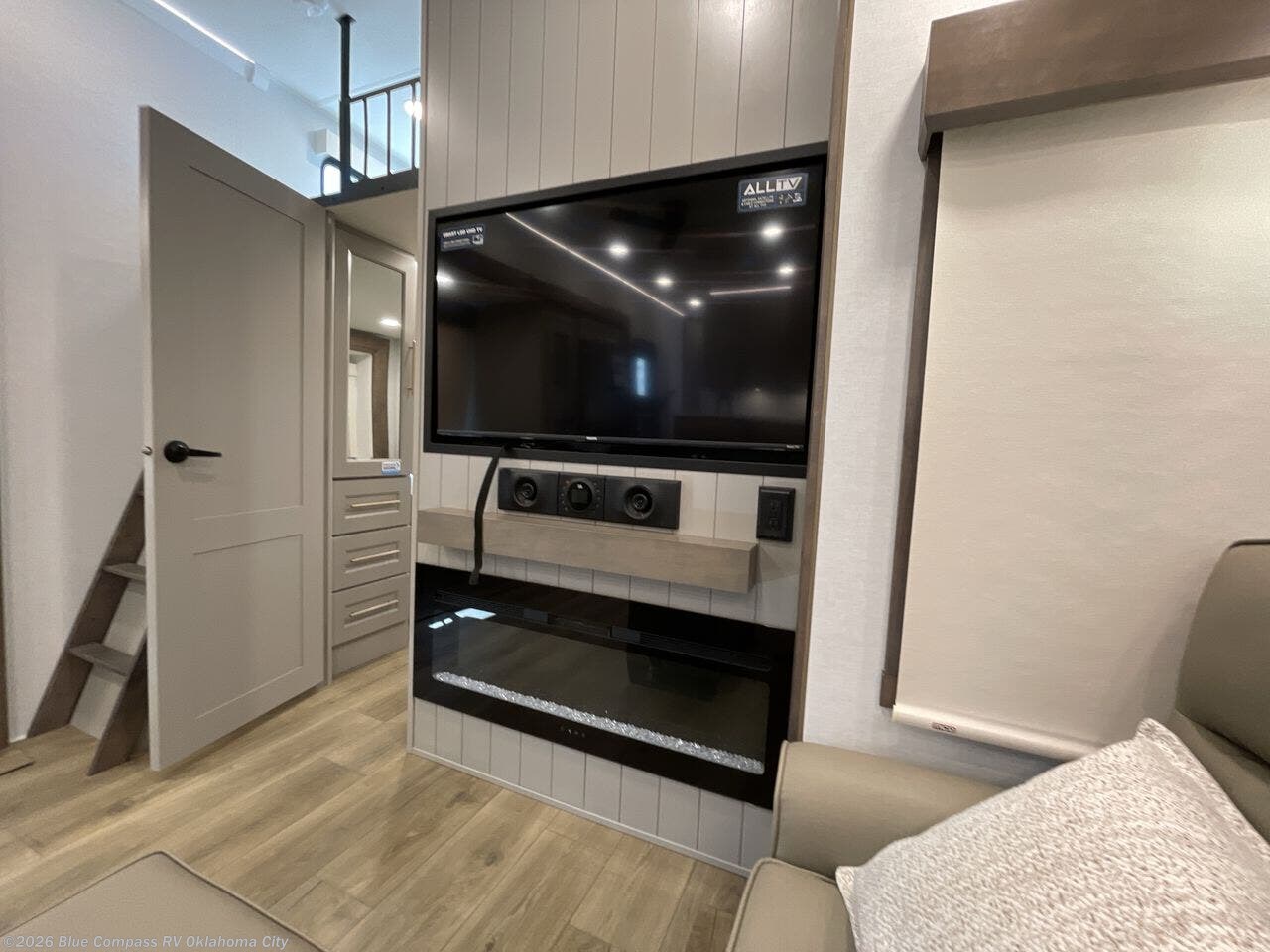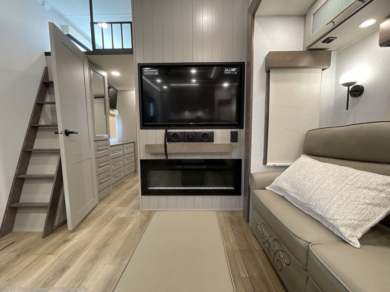 A spacious unit with sleeping for eight with plenty of choices to suit everyone! There is a front private bedroom with a king size bed that offers a large full front closet that has also been prepped for a washer and dryer if you choose that option. The front bath features a 40" x 30" shower and dual entry. Head down to the kitchen and living space at the bottom of the stairs to find a curbside slide that houses the 19 cu. ft. residential refrigerator, a pantry, and a swivel table and desk. As you continue on toward the rear of this coach, you will find a spacious living area along the roadside with a 50" Smart TV and a fireplace, a sofa sleeper slide, and a dual reclining loveseat. This makes a great gathering place for television watching, game playing, and even added sleeping space if needed at night. The rear private bedroom with its own private bath features a queen bed, two closets, and a Smart TV as well. The multipurpose loft area above can be accessed just before this rear bedroom entry by a ladder, and it is perfect for extra storage, or it can be used for added sleeping that the kiddos are sure to love.