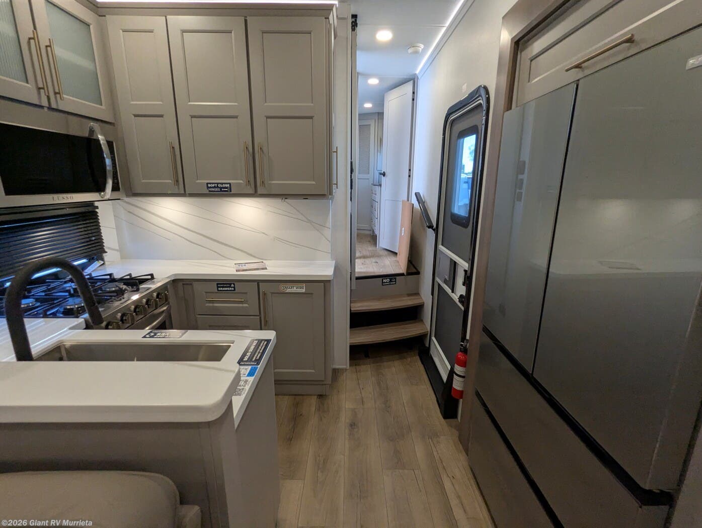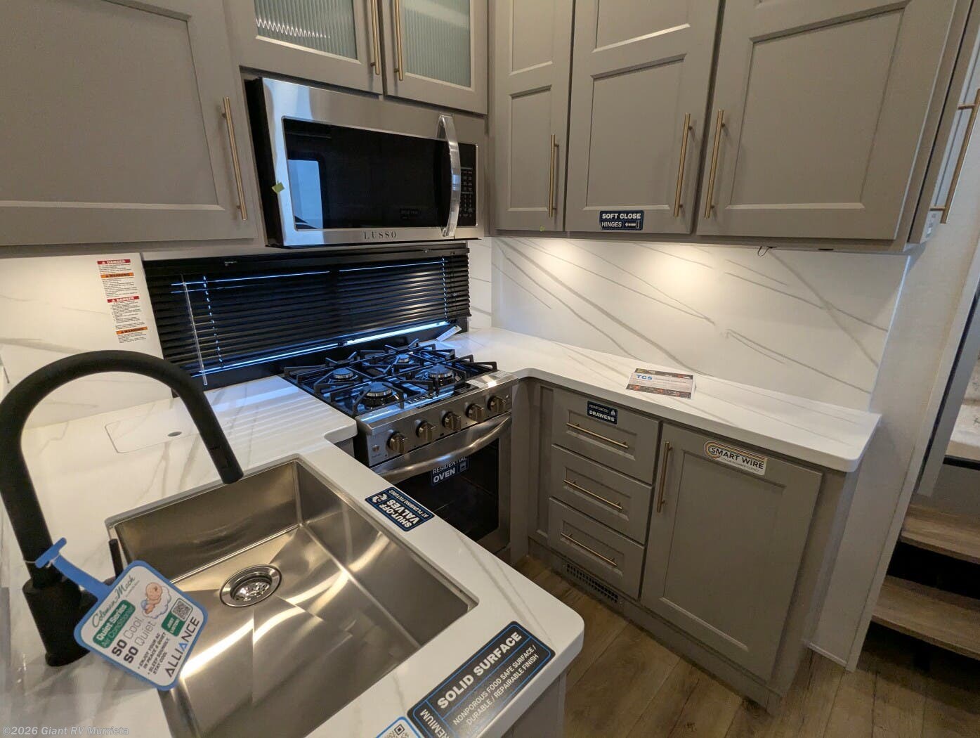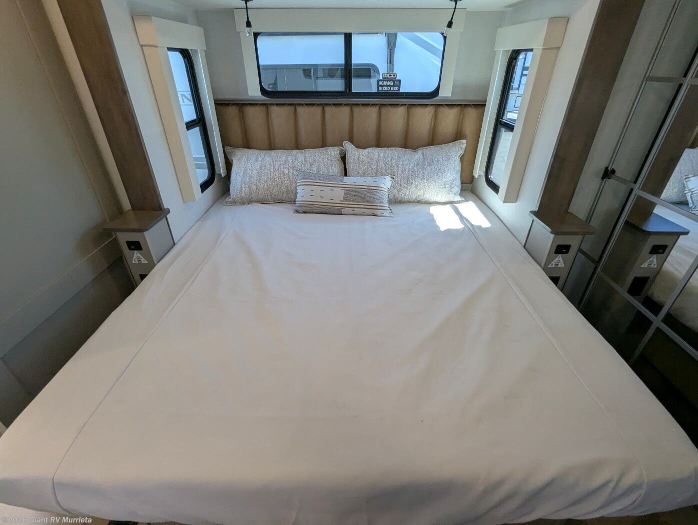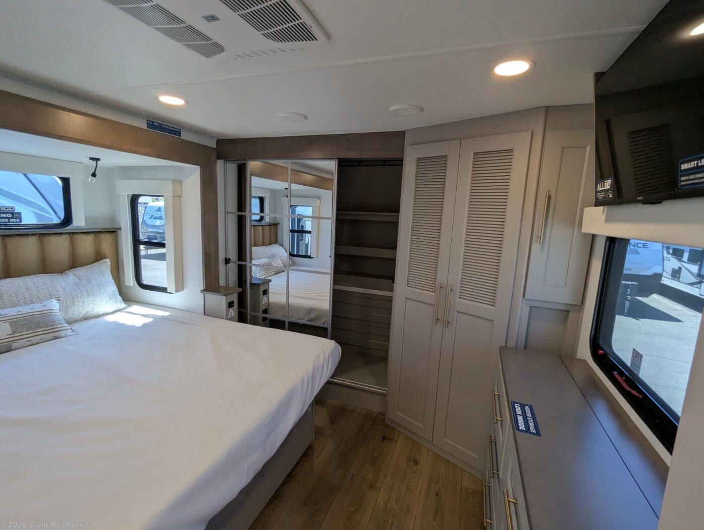- Luxury Amenities: Features three air conditioning units, a kitchen with a 19 cu ft refrigerator, Insignia range, and dual Smart TVs for entertainment.