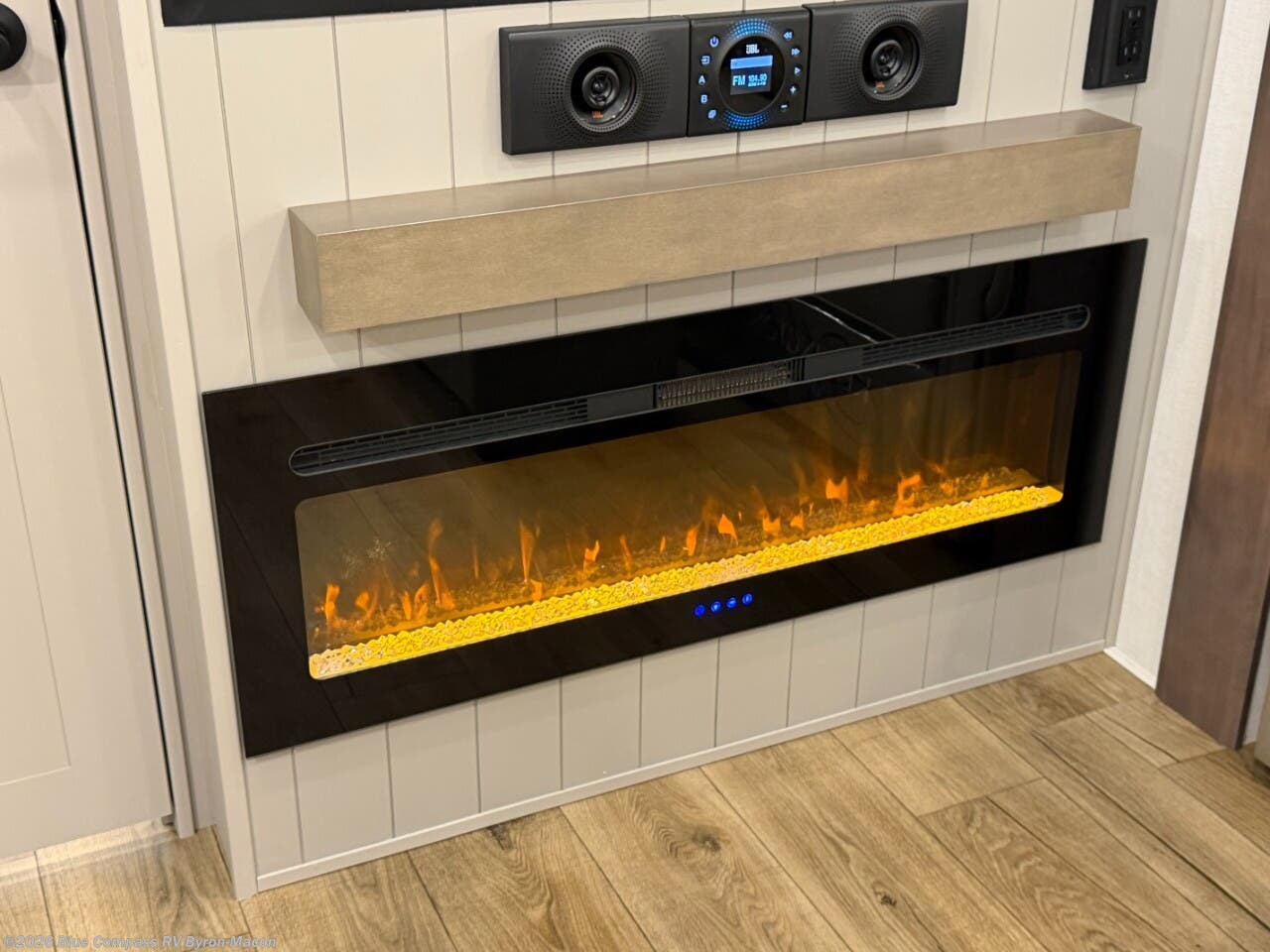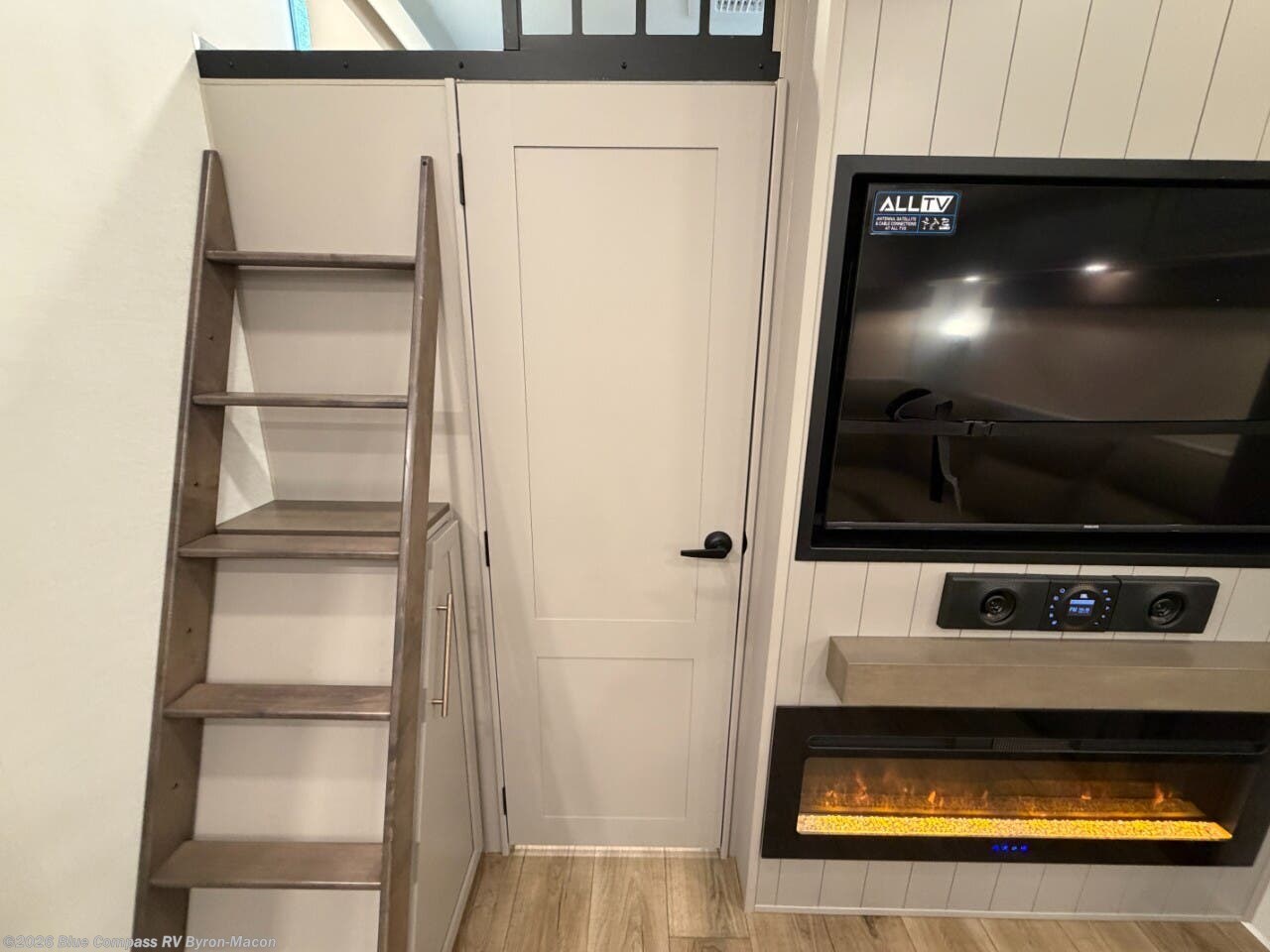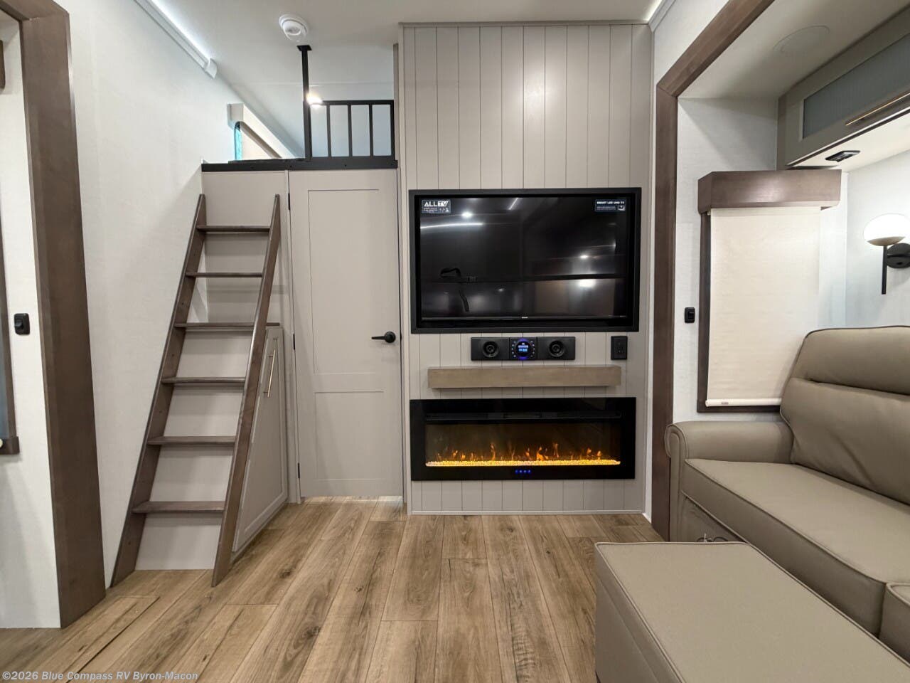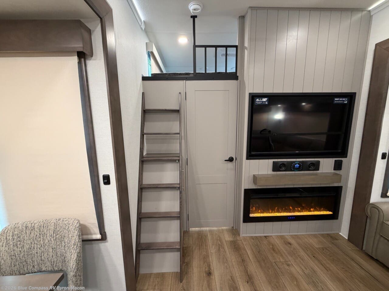 A spacious unit with sleeping for eight with plenty of choices to suit everyone! There is a front private bedroom with a king size bed that offers a large full front closet that has also been prepped for a washer and dryer if you choose that option. The front bath features a 40" x 30" shower and dual entry. Head down to the kitchen and living space at the bottom of the stairs to find a curbside slide that houses the 19 cu. ft. residential refrigerator, a pantry, and a swivel table and desk. As you continue on toward the rear of this coach, you will find a spacious living area along the roadside with a 50" Smart TV and a fireplace, a L-sofa sleeper slide, and a dual reclining loveseat. This makes a great gathering place for television watching, game playing, and even added sleeping space if needed at night. The rear private bedroom with its own private bath features a queen bed, two closets, and a Smart TV as well. The multipurpose loft area above can be accessed just before this rear bedroom entry by a ladder, and it is perfect for extra storage, or it can be used for added sleeping that the kiddos are sure to love.