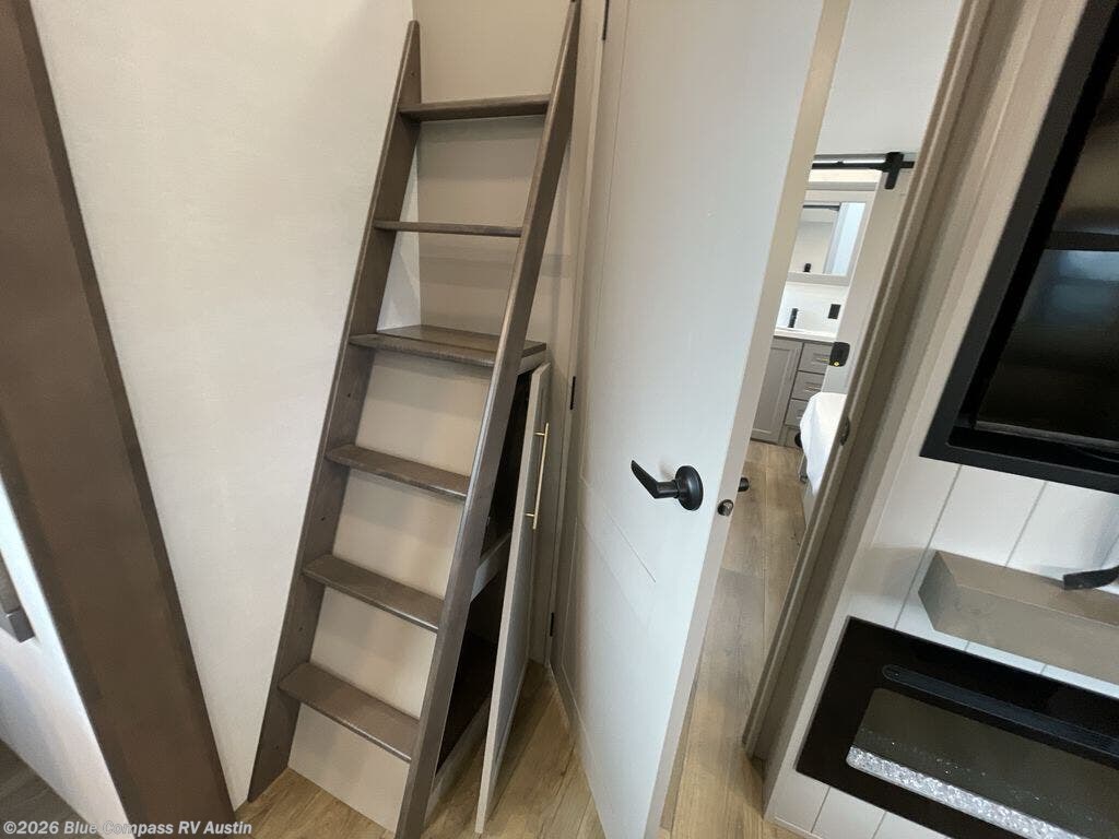 A spacious unit with sleeping for eight with plenty of choices to suit everyone! There is a front private bedroom with a king size bed that offers a large full front closet that has also been prepped for a washer and dryer if you choose that option. The front bath features a 40" x 30" shower and dual entry. Head down to the kitchen and living space at the bottom of the stairs to find a curbside slide that houses the 19 cu. ft. residential refrigerator, a pantry, and a swivel table and desk. As you continue on toward the rear of this coach, you will find a spacious living area along the roadside with a 50" Smart TV and a fireplace, a L-sofa sleeper slide, and a dual reclining loveseat. This makes a great gathering place for television watching, game playing, and even added sleeping space if needed at night. The rear private bedroom with its own private bath features a queen bed, two closets, and a Smart TV as well. The multipurpose loft area above can be accessed just before this rear bedroom entry by a ladder, and it is perfect for extra storage, or it can be used for added sleeping that the kiddos are sure to love.
