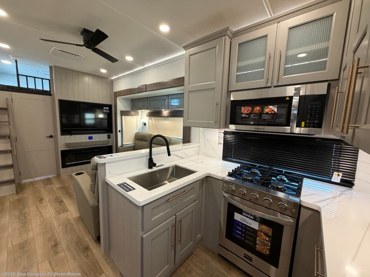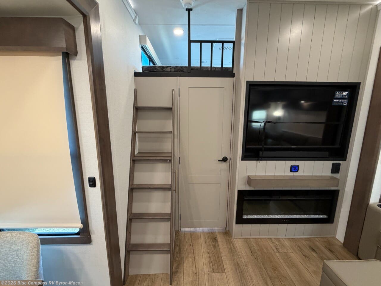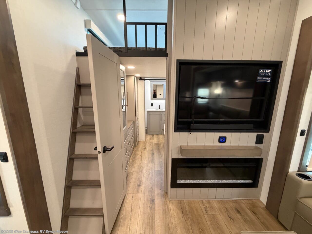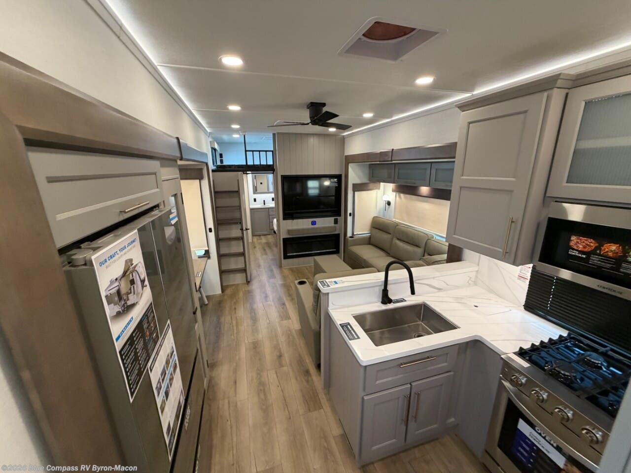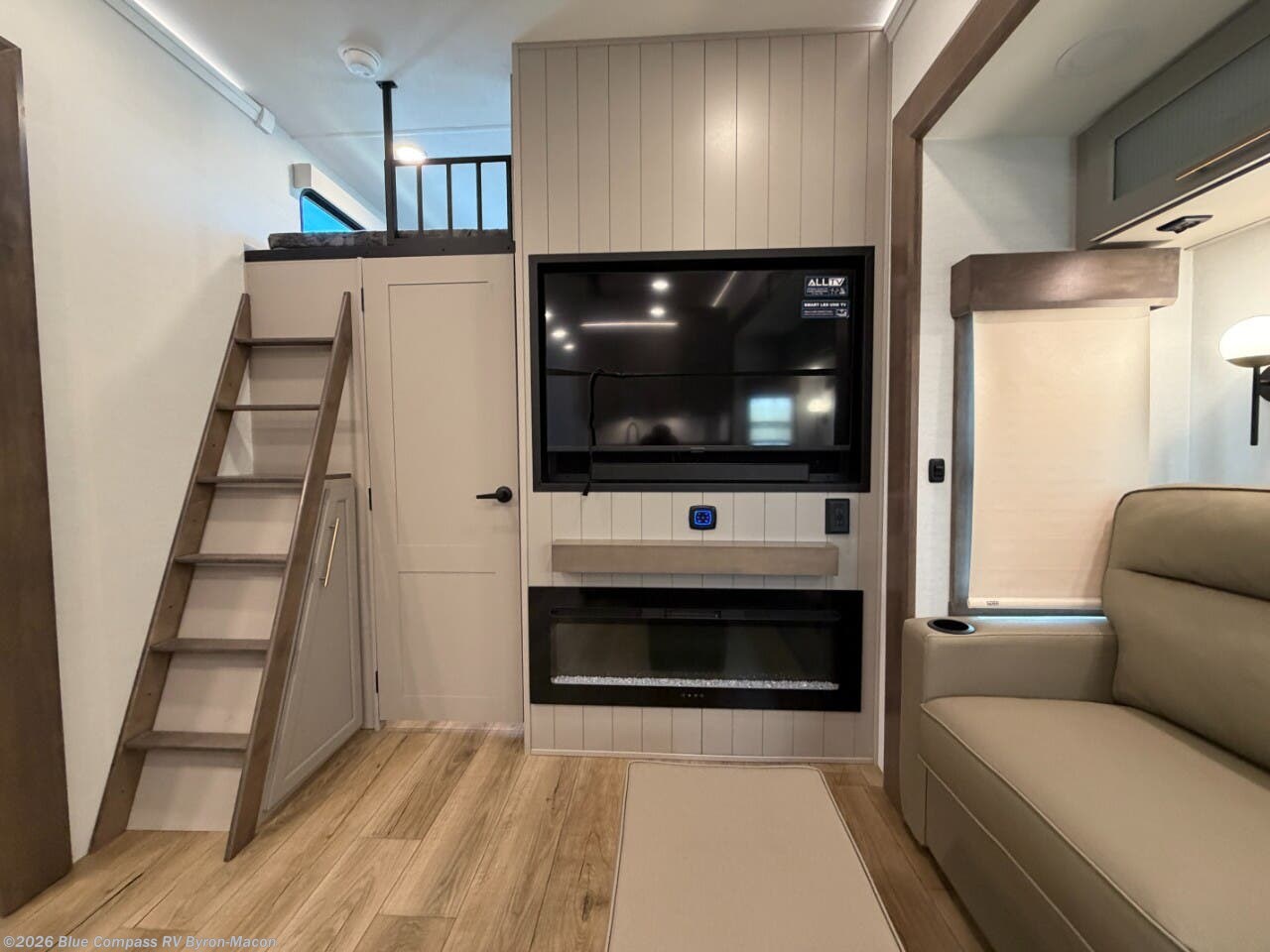 A spacious unit with sleeping for eight with plenty of choices to suit everyone! There is a front private bedroom with a king size bed that offers a large full front closet that has also been prepped for a washer and dryer if you choose that option. The front bath features a 40" x 30" shower and dual entry. Head down to the kitchen and living space at the bottom of the stairs to find a curbside slide that houses the 19 cu. ft. residential refrigerator, a pantry, and a swivel table and desk. As you continue on toward the rear of this coach, you will find a spacious living area along the roadside with a 50" Smart TV and a fireplace, a L-sofa sleeper slide, and a dual reclining loveseat. This makes a great gathering place for television watching, game playing, and even added sleeping space if needed at night. The rear private bedroom with its own private bath features a queen bed, two closets, and a Smart TV as well. The multipurpose loft area above can be accessed just before this rear bedroom entry by a ladder, and it is perfect for extra storage, or it can be used for added sleeping that the kiddos are sure to love.