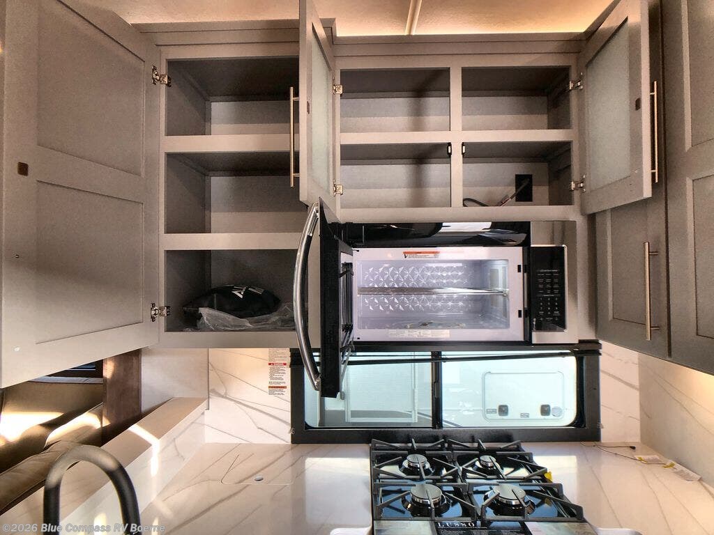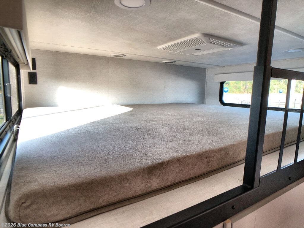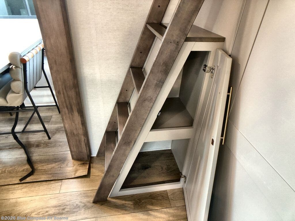 A spacious unit with sleeping for eight with plenty of choices to suit everyone! There is a front private bedroom with a king size bed that offers a large full front closet that has also been prepped for a washer and dryer if you choose that option. The front bath features a 40" x 30" shower and dual entry. Head down to the kitchen and living space at the bottom of the stairs to find a curbside slide that houses the 19 cu. ft. residential refrigerator, a pantry, and a swivel table and desk. As you continue on toward the rear of this coach, you will find a spacious living area along the roadside with a 50" Smart TV and a fireplace, a L-sofa sleeper slide, and a dual reclining loveseat. This makes a great gathering place for television watching, game playing, and even added sleeping space if needed at night. The rear private bedroom with its own private bath features a queen bed, two closets, and a Smart TV as well. The multipurpose loft area above can be accessed just before this rear bedroom entry by a ladder, and it is perfect for extra storage, or it can be used for added sleeping that the kiddos are sure to love.