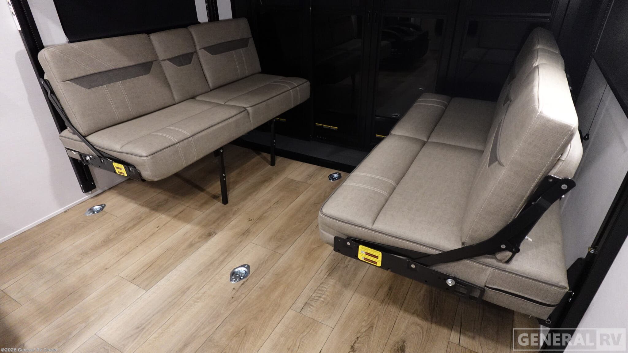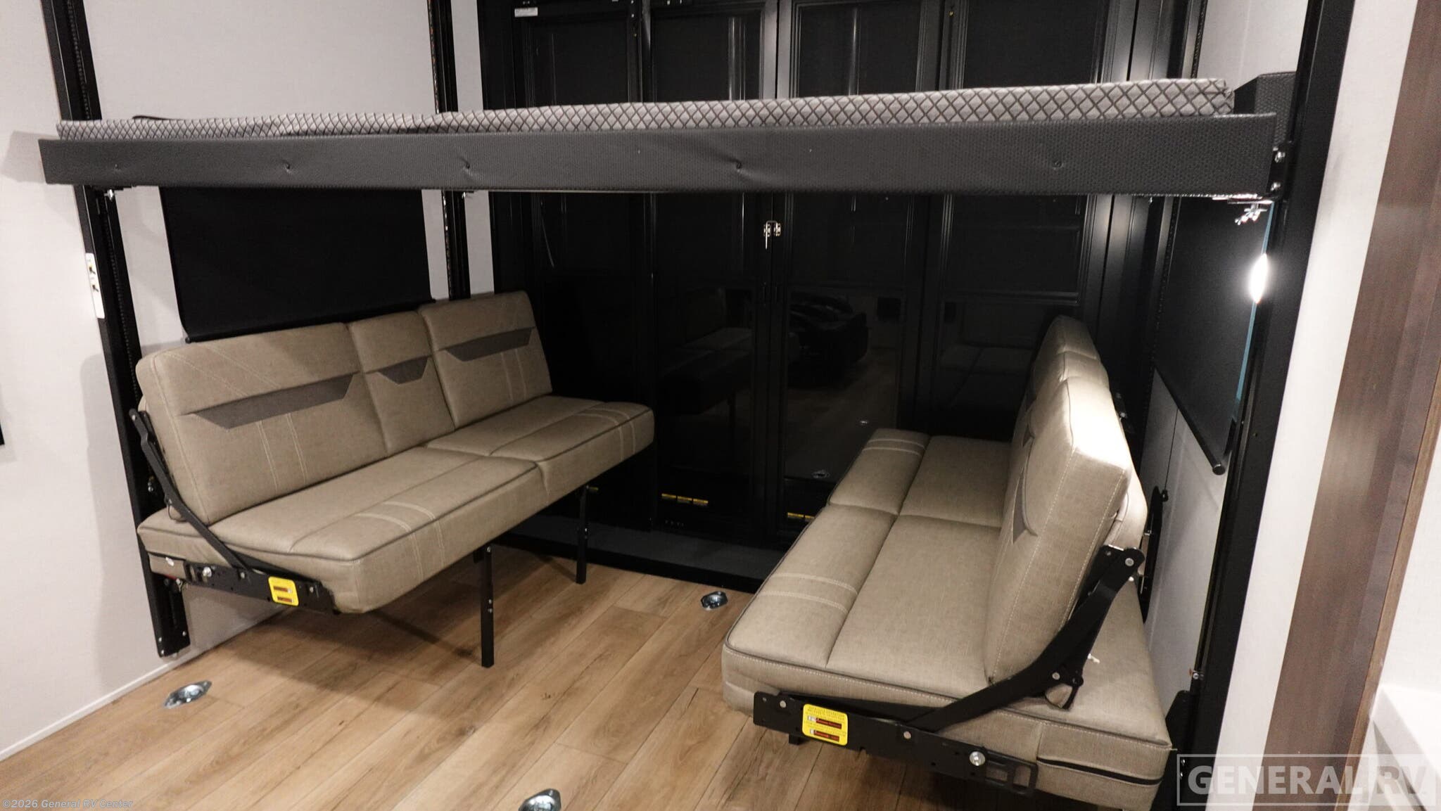 Alliance RV Valor All-Access toy hauler 27T14 highlights: -Happijac Sofas -Private Bedroom -10 Cu. Ft. Refrigerator -Dual Lounge Chairs -Drop-Down Queen Bed -Pull out Griddle Step into the world of adventure with the Alliance Valor, a striking blend of style and functionality. The exterior boasts a sleek white finish accented by bold graphics, making a statement wherever you roam. With the 14' garage length and 74 inch interior width, you can bring all your favorite off-road toys and gear with you. Inside the spacious living area, the Valor blends practicality and comfort. Whether you're cooking a gourmet meal or unwinding after a day of exploration, the Valor offers a perfect mix of comfort and luxury. The HappiJac roll-over sofas and drop-down queen bed offer a comfortable place to socialize together at night, as well as a provide sleeping space at night too! With its robust build and thoughtful design, this RV is ready to take on any journey, providing a home away from home that's as stylish as it is functional. For more details, visit your nearest General RV dealership.