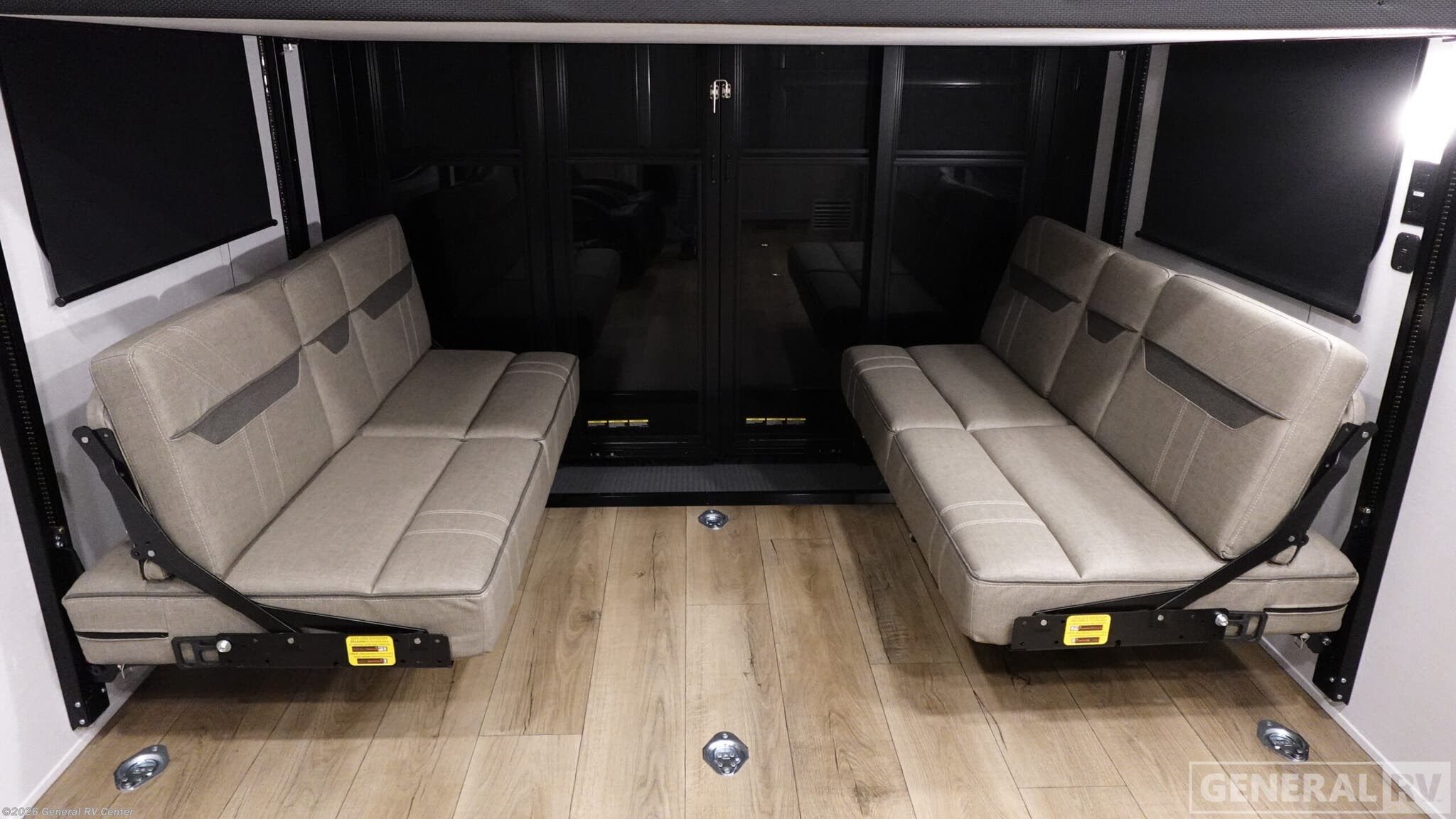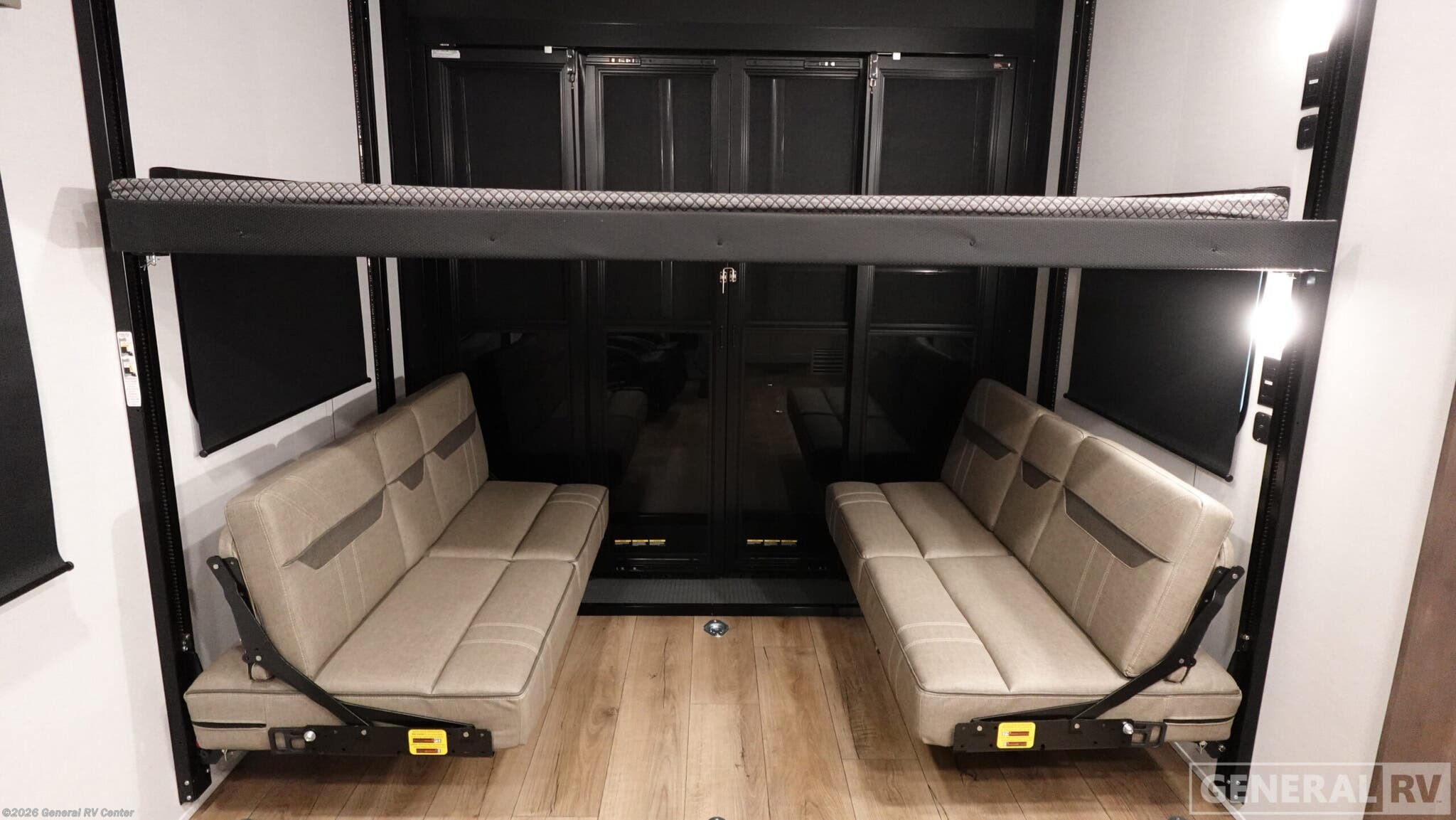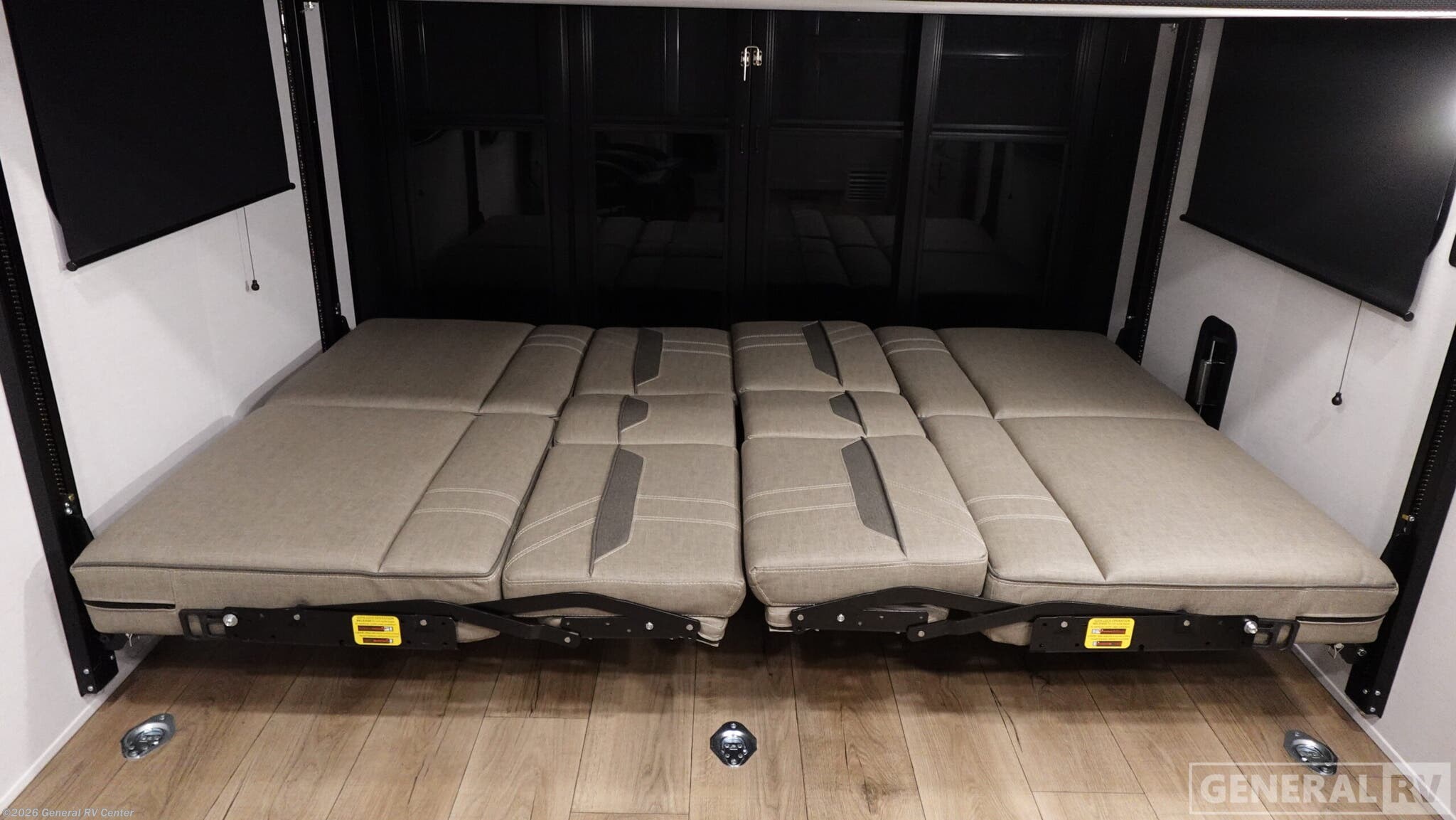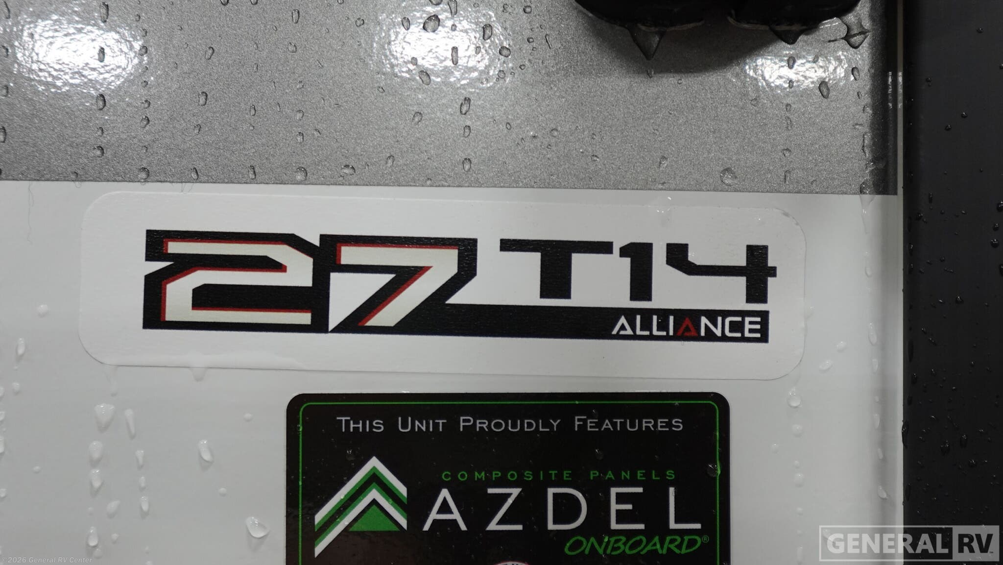Alliance RV Valor All-Access toy hauler 27T14 highlights: -Happijac Sofas -Private Bedroom -10 Cu. Ft. Refrigerator -Dual Lounge Chairs -Drop-Down Queen Bed -Pull out Griddle Step into the world of adventure with the Alliance Valor, a striking blend of style and functionality. The exterior boasts a sleek white finish accented by bold graphics, making a statement wherever you roam. With the 14' garage length and 74 inch interior width, you can bring all your favorite off-road toys and gear with you. Inside the spacious living area, the Valor blends practicality and comfort. Whether you're cooking a gourmet meal or unwinding after a day of exploration, the Valor offers a perfect mix of comfort and luxury. The HappiJac roll-over sofas and drop-down queen bed offer a comfortable place to socialize together at night, as well as a provide sleeping space at night too! With its robust build and thoughtful design, this RV is ready to take on any journey, providing a home away from home that's as stylish as it is functional. For more details, visit your nearest General RV dealership.